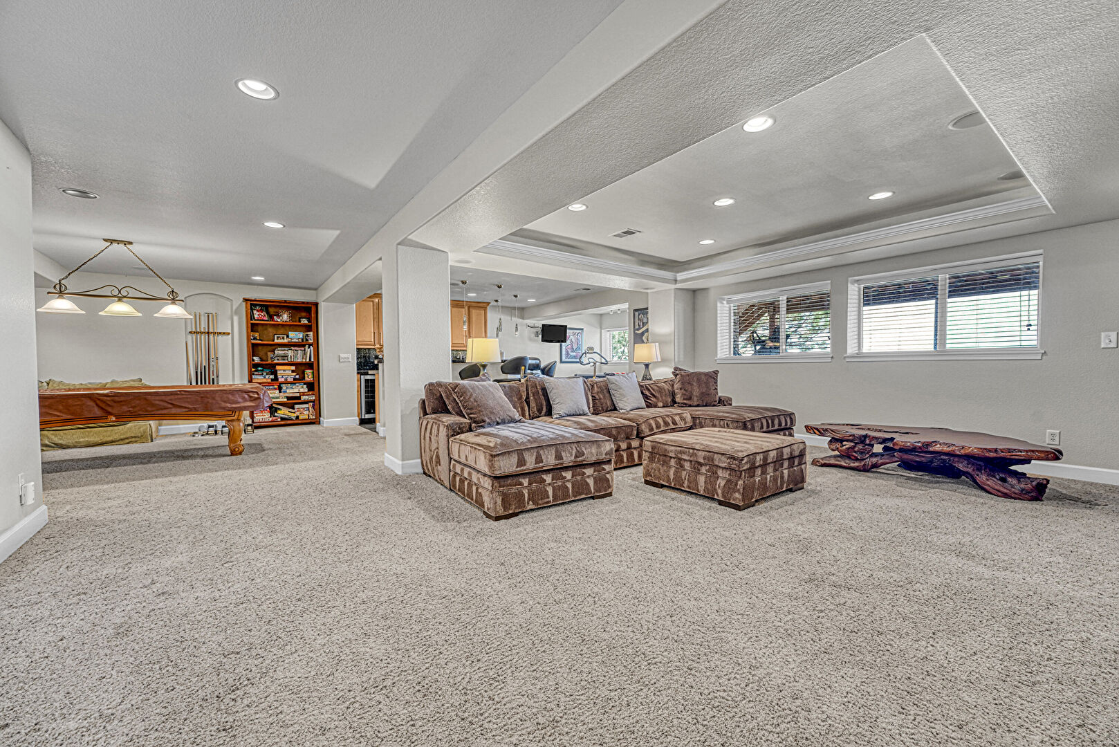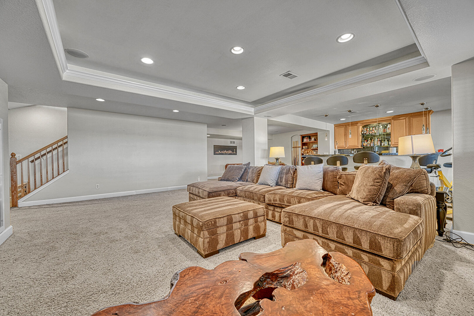 Arched Walkways, Baseboards Wall, Billiards, Carpet, Crown Molding, Drywall, Natural Light, Recessed Lighting, Textured Ceiling, Textured Wall, Tray Ceiling, Vent, Recessed Lighting, Stairs, Textured Wall