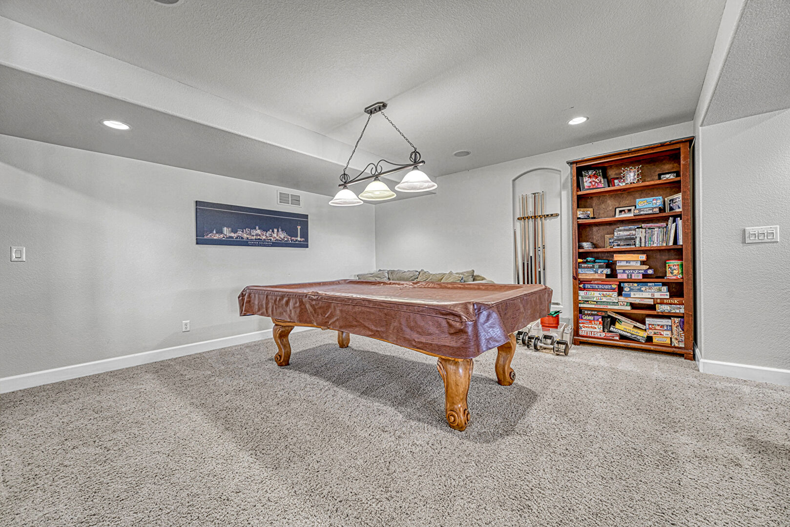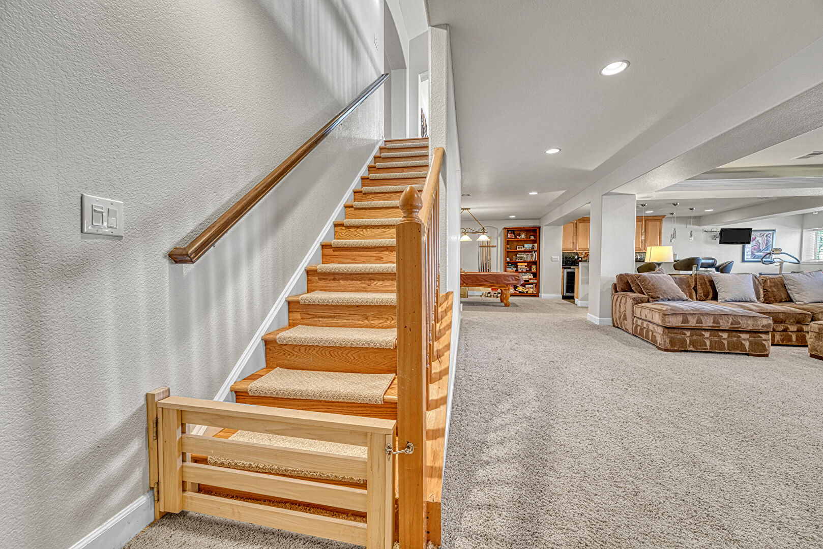 Baseboards Wall, Basement, Billiards, Carpet, Stairs, Textured Wall, Recessed Lighting