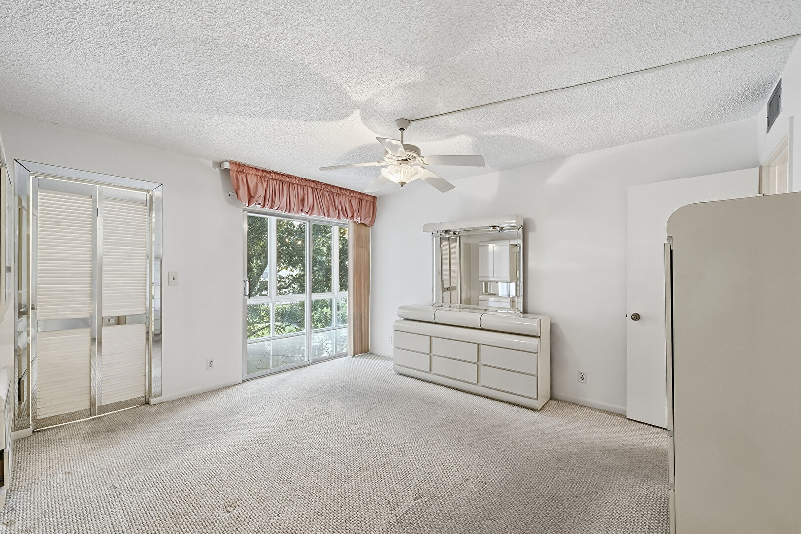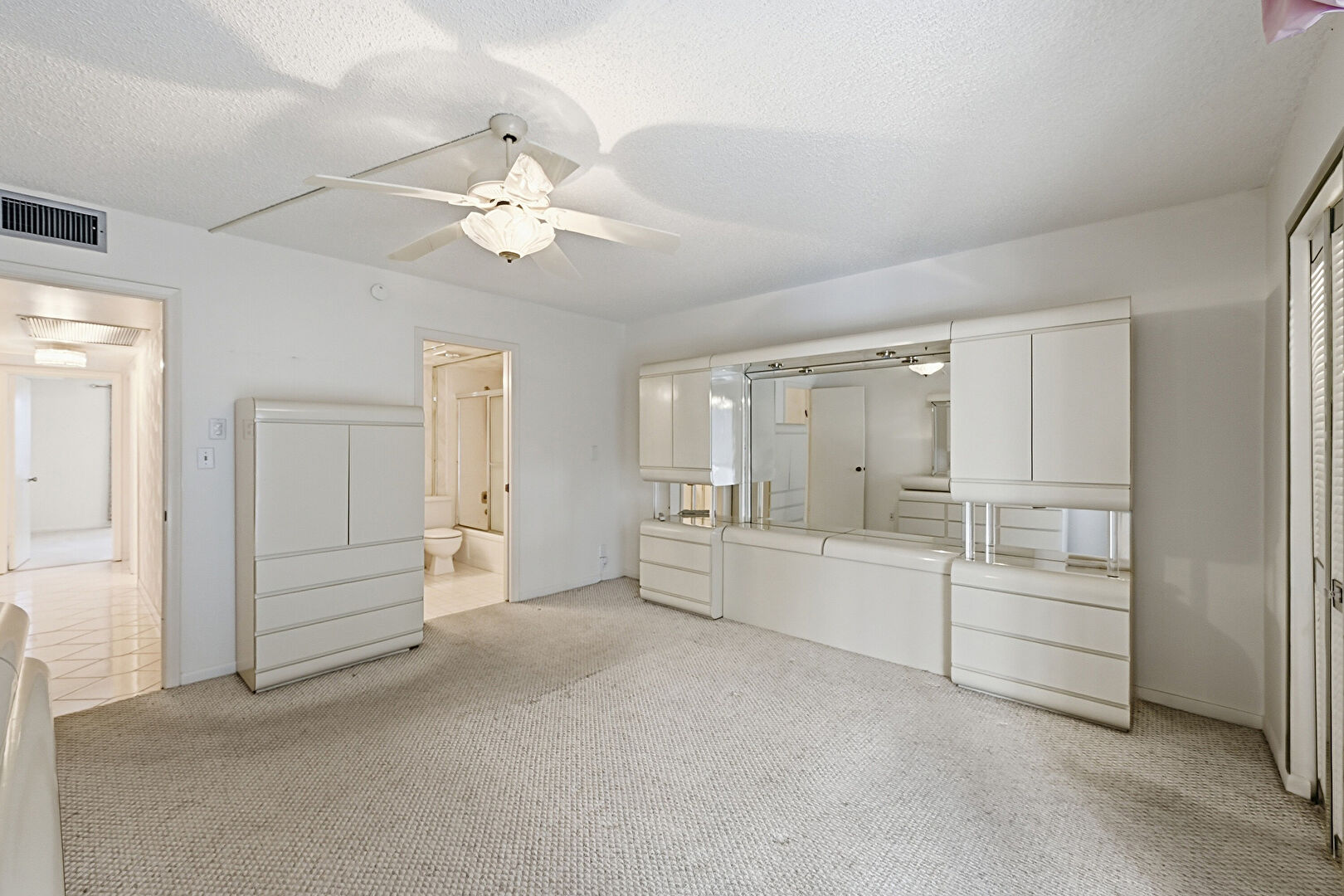 Access To Exterior, Arched Walkways, Carpet, Ceiling Fan, Drywall, Ensuite Bathroom, Natural Light, Textured Ceiling, Vent, Baseboards Wall, Carpet, Textured Ceiling