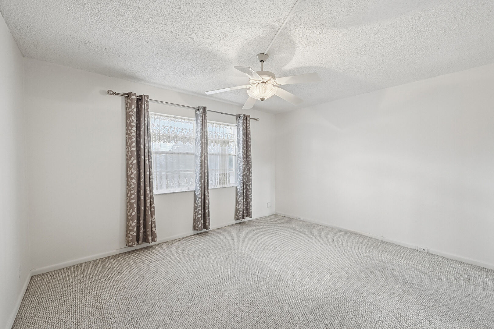 Baseboards Wall, Carpet, Ceiling Fan, Drywall, Natural Light, Textured Ceiling, Tile Floor, Vent, Baseboards Wall, Closet, Natural Light