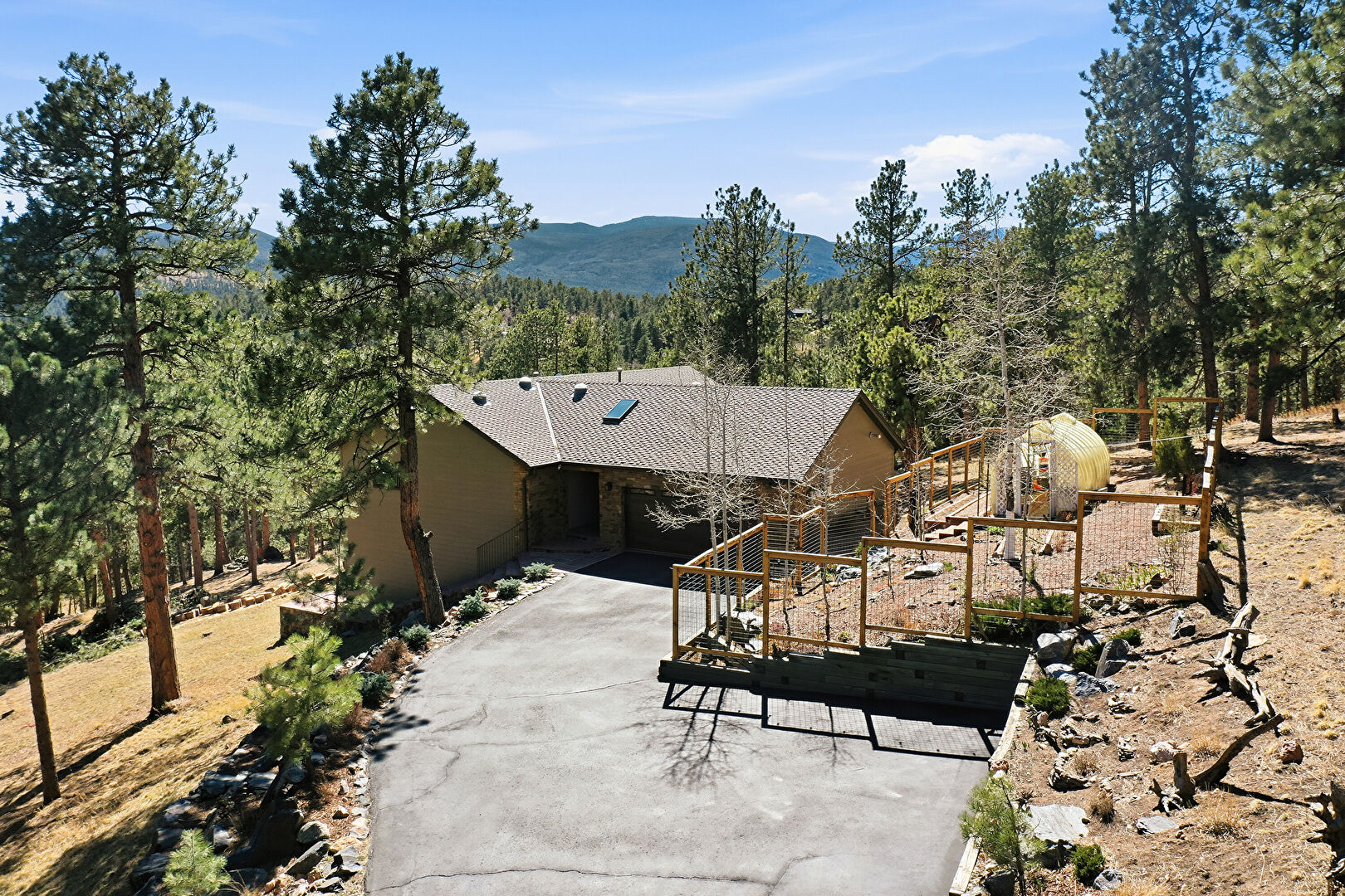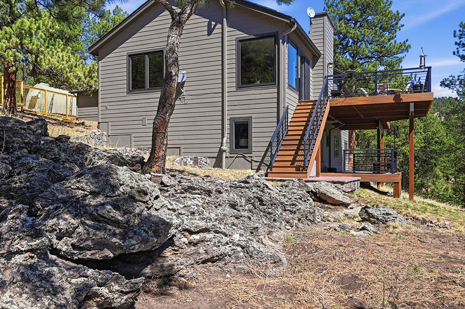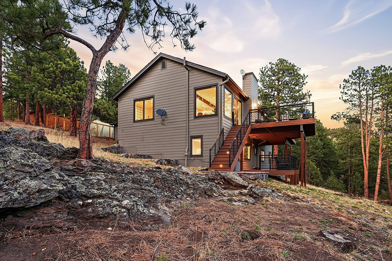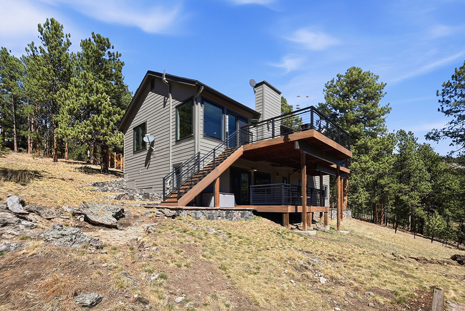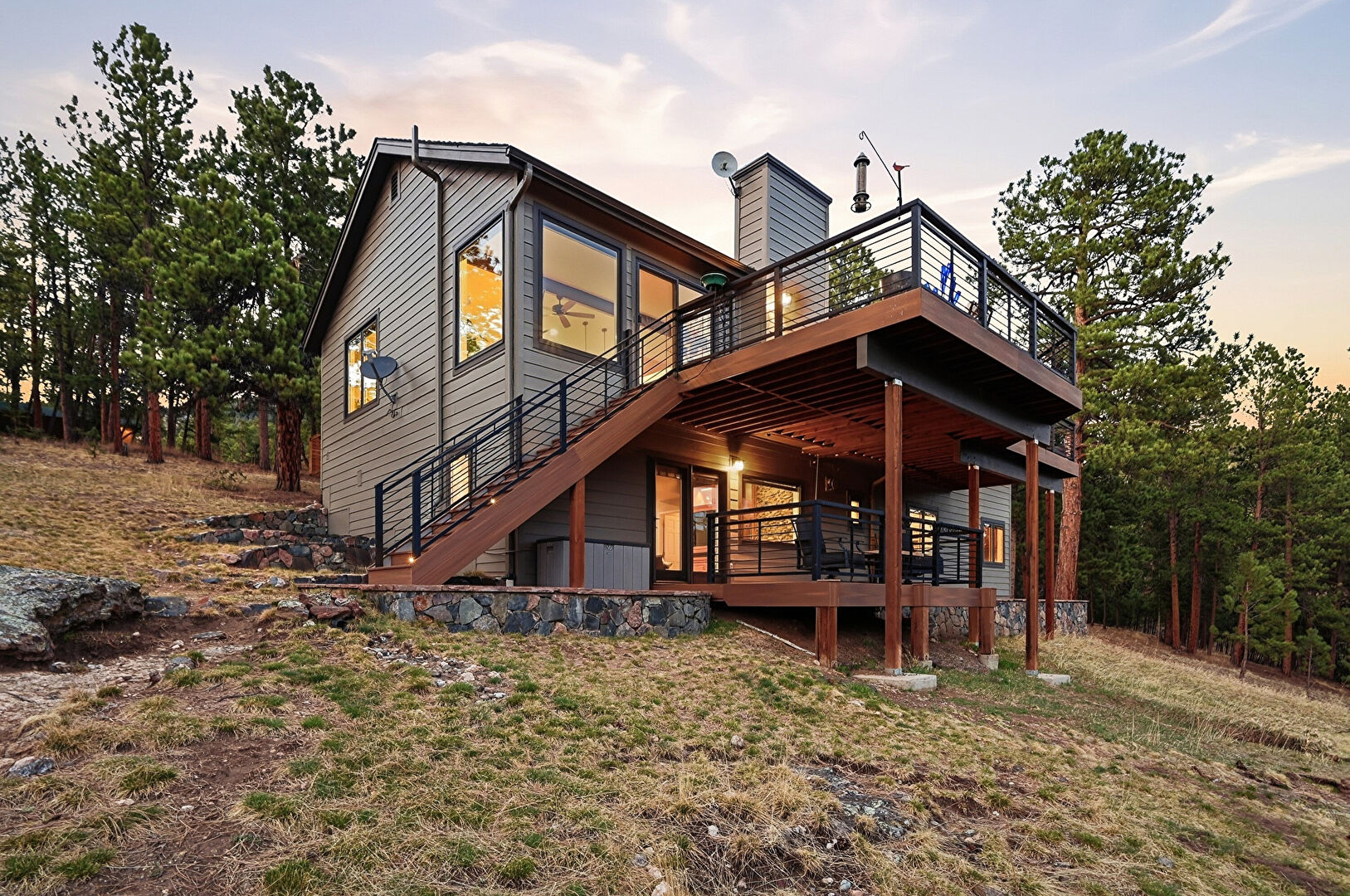 Chimney, Deck, Downspout, Driveway, Forest View, Gutters, Horizontal Siding, Mountain View, Patio, Satellite Dish, Stucco Siding, Mountain View, Natural Light, Stairs, Woods View