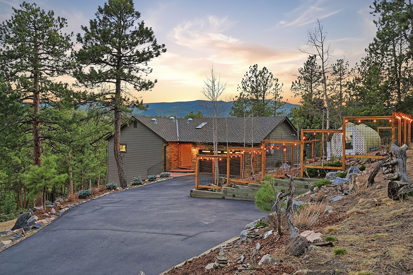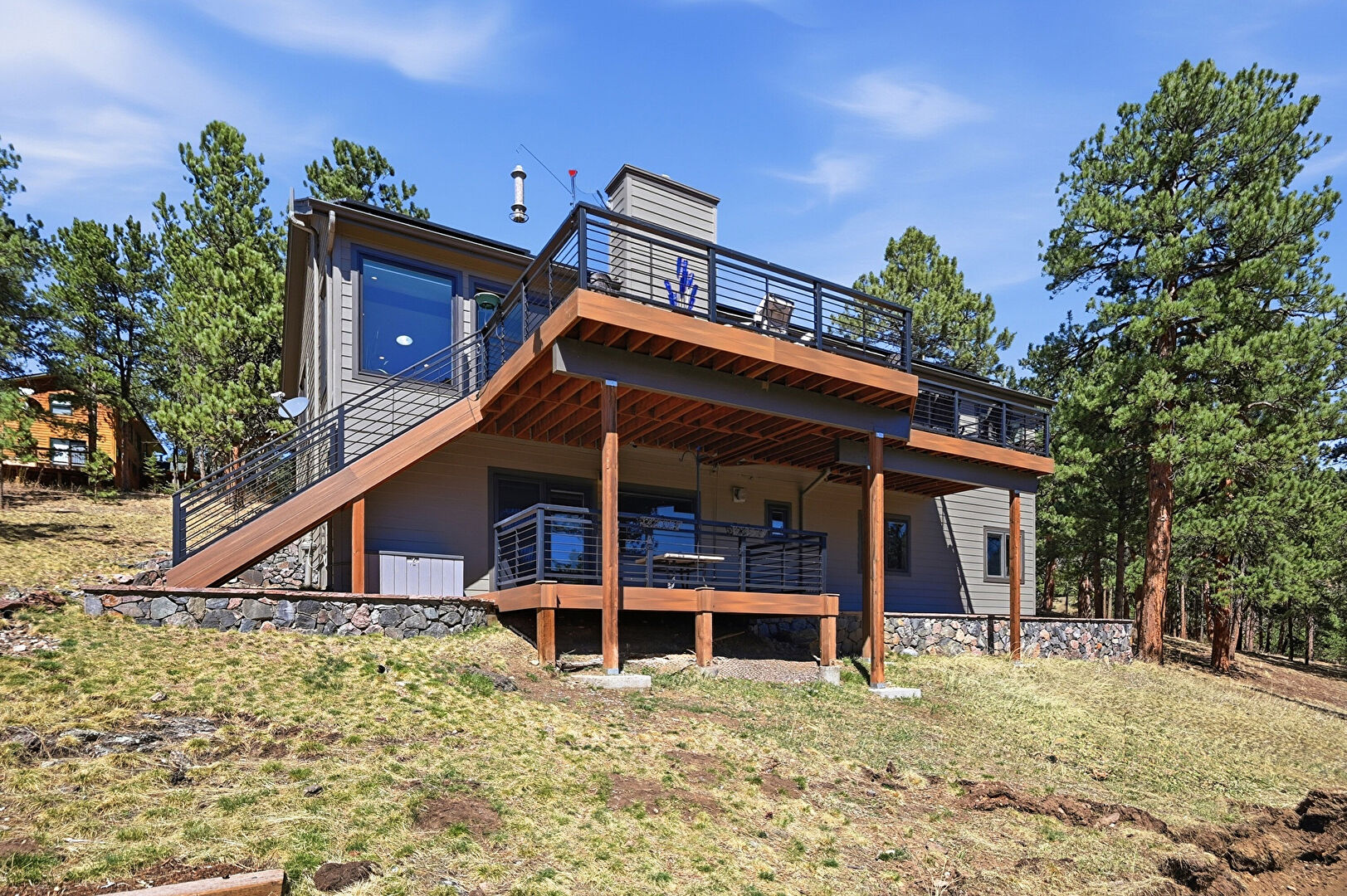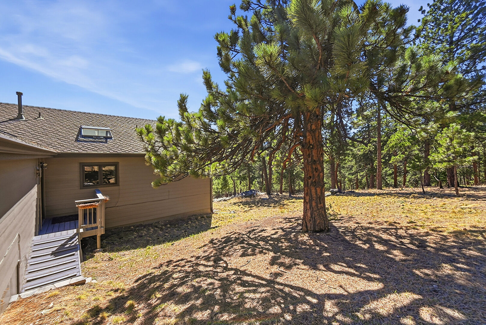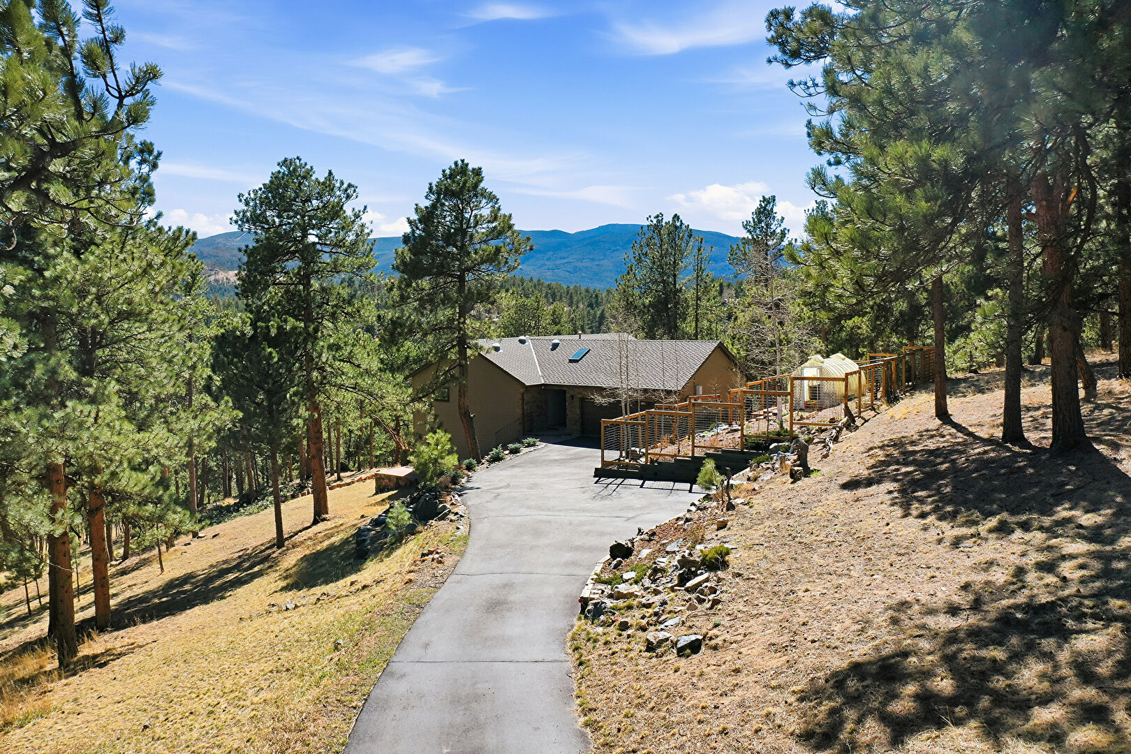 Chimney, Deck, Downspout, Driveway, Forest View, Gutters, Horizontal Siding, Mountain View, Patio, Satellite Dish, Stucco Siding, Mountain View, Natural Light, Stairs, Woods View