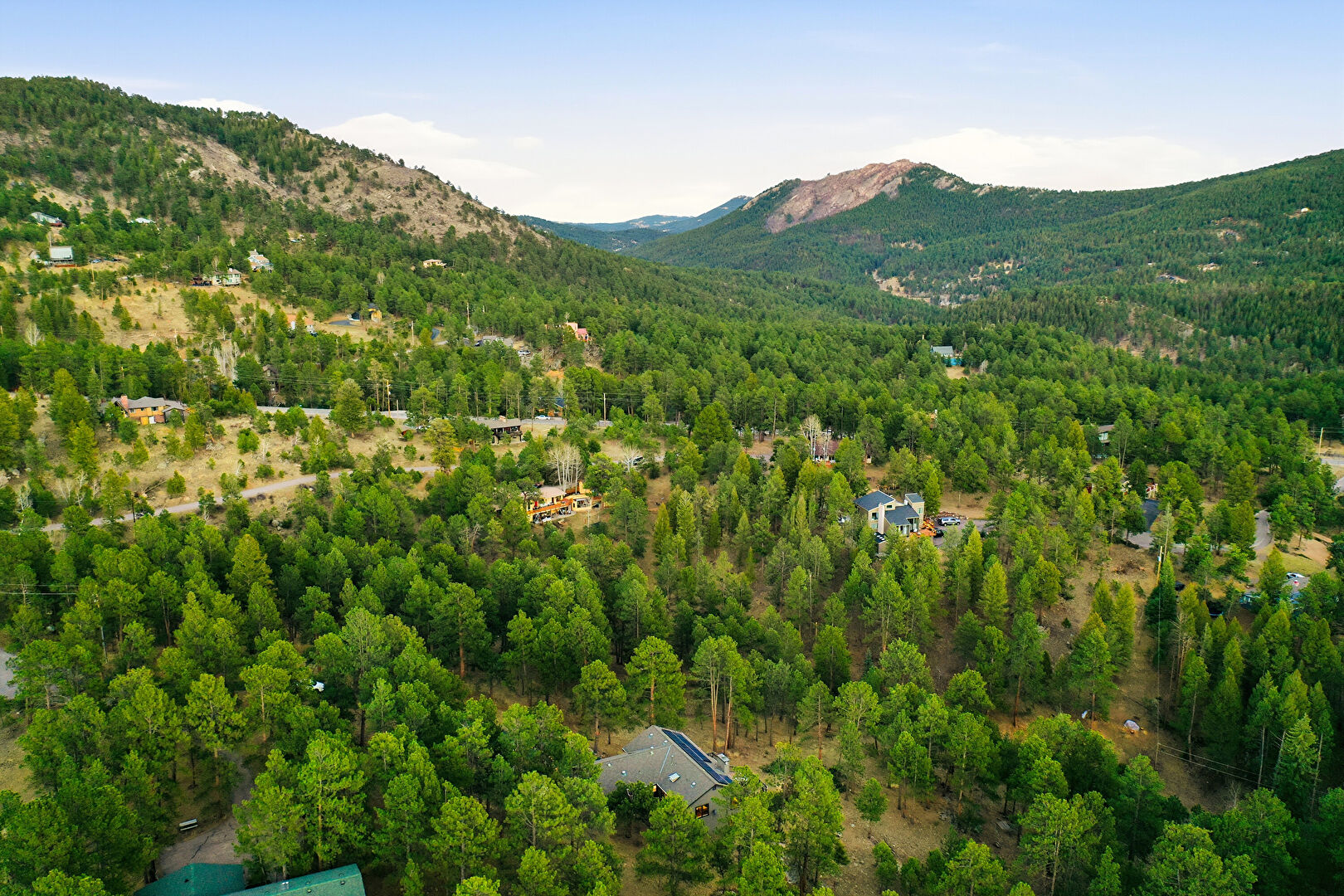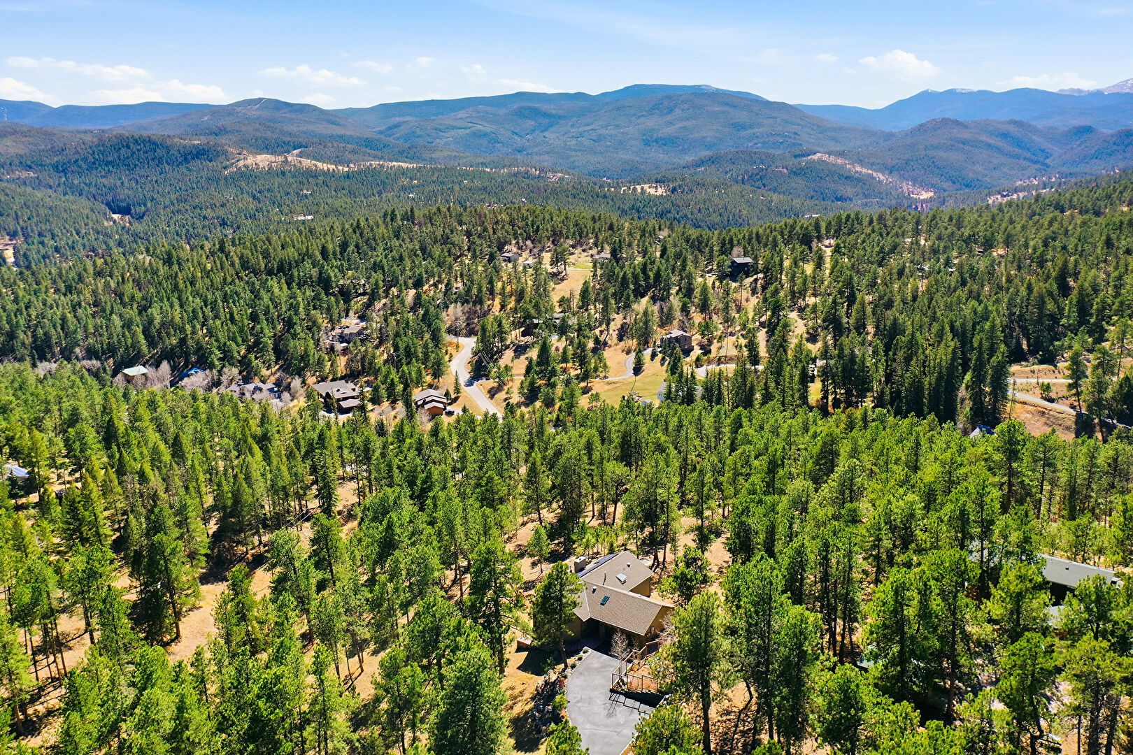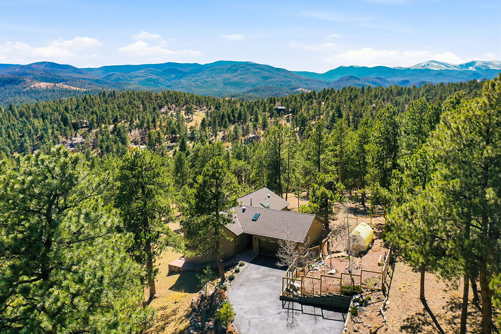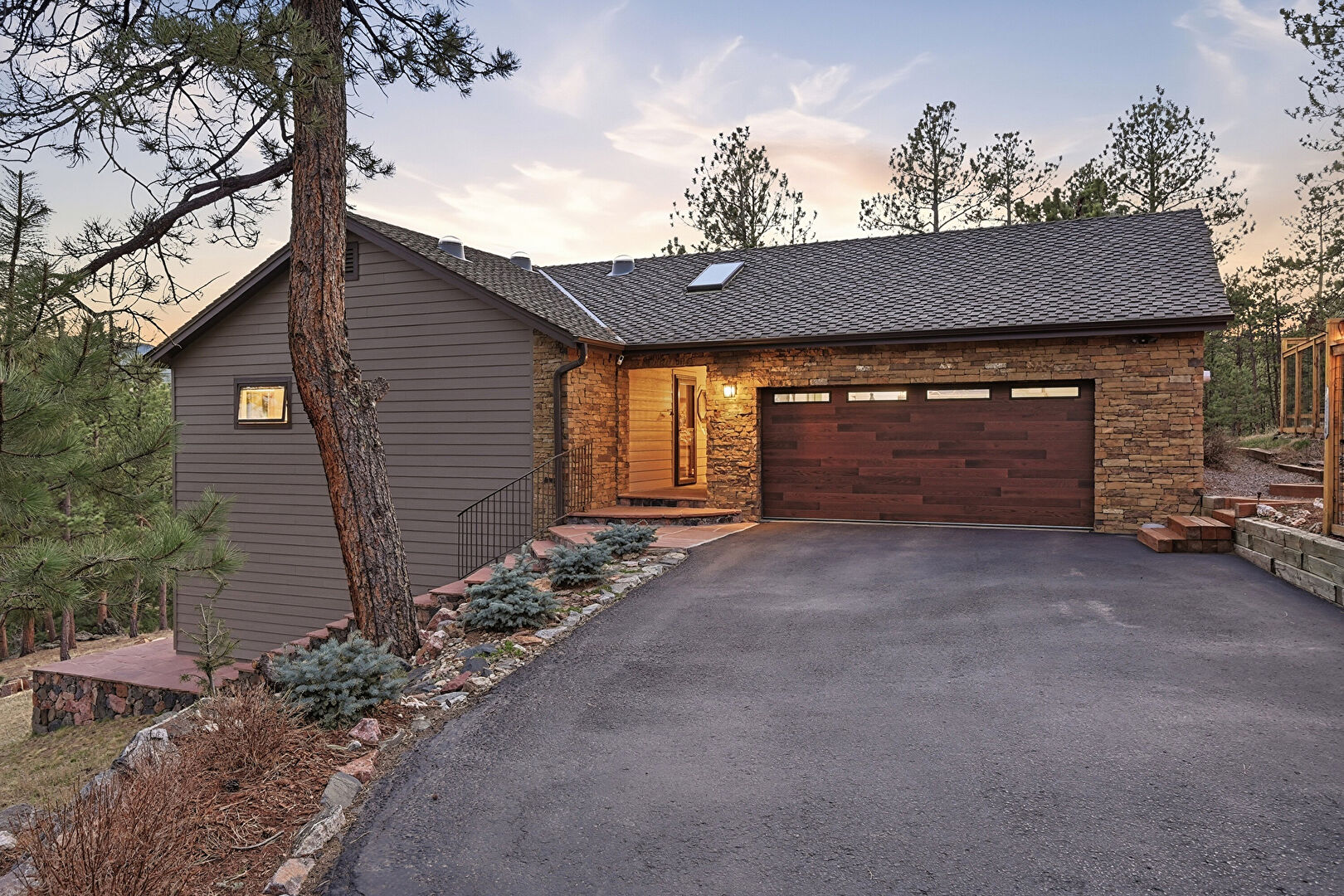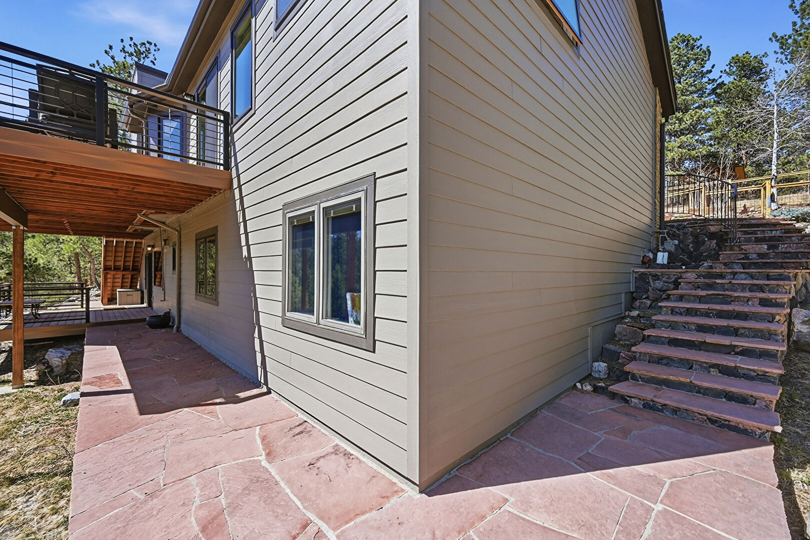 Chimney, Deck, Downspout, Driveway, Forest View, Gutters, Horizontal Siding, Mountain View, Patio, Satellite Dish, Stucco Siding, Mountain View, Natural Light, Stairs, Woods View