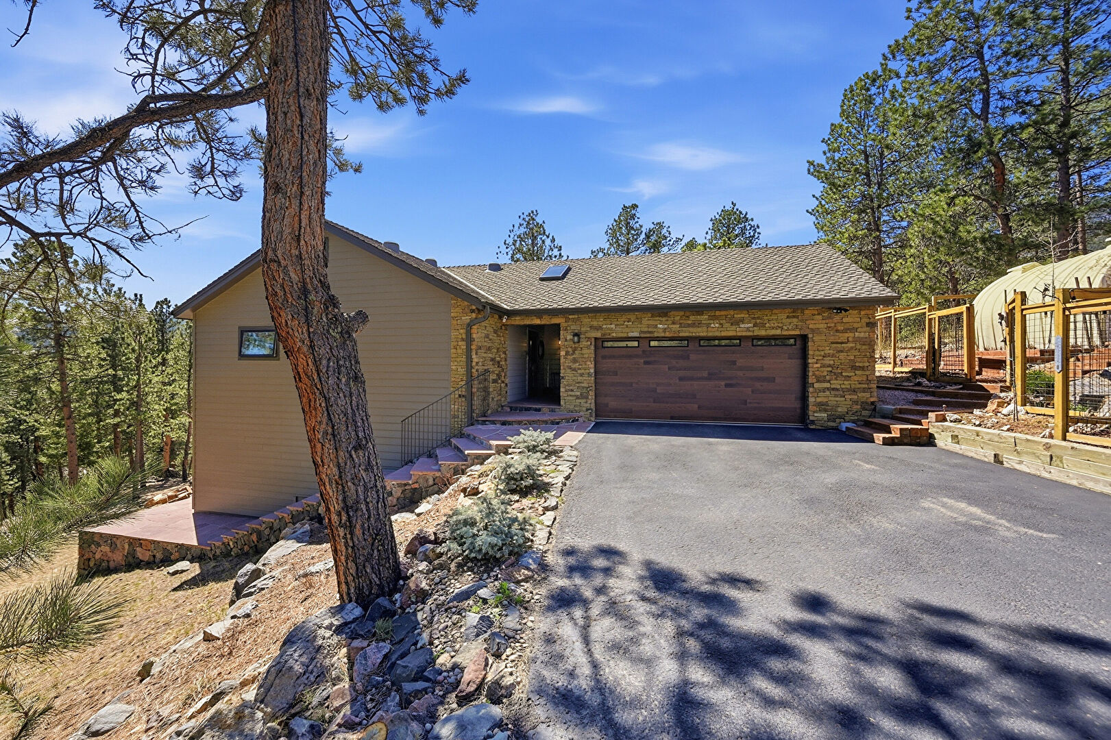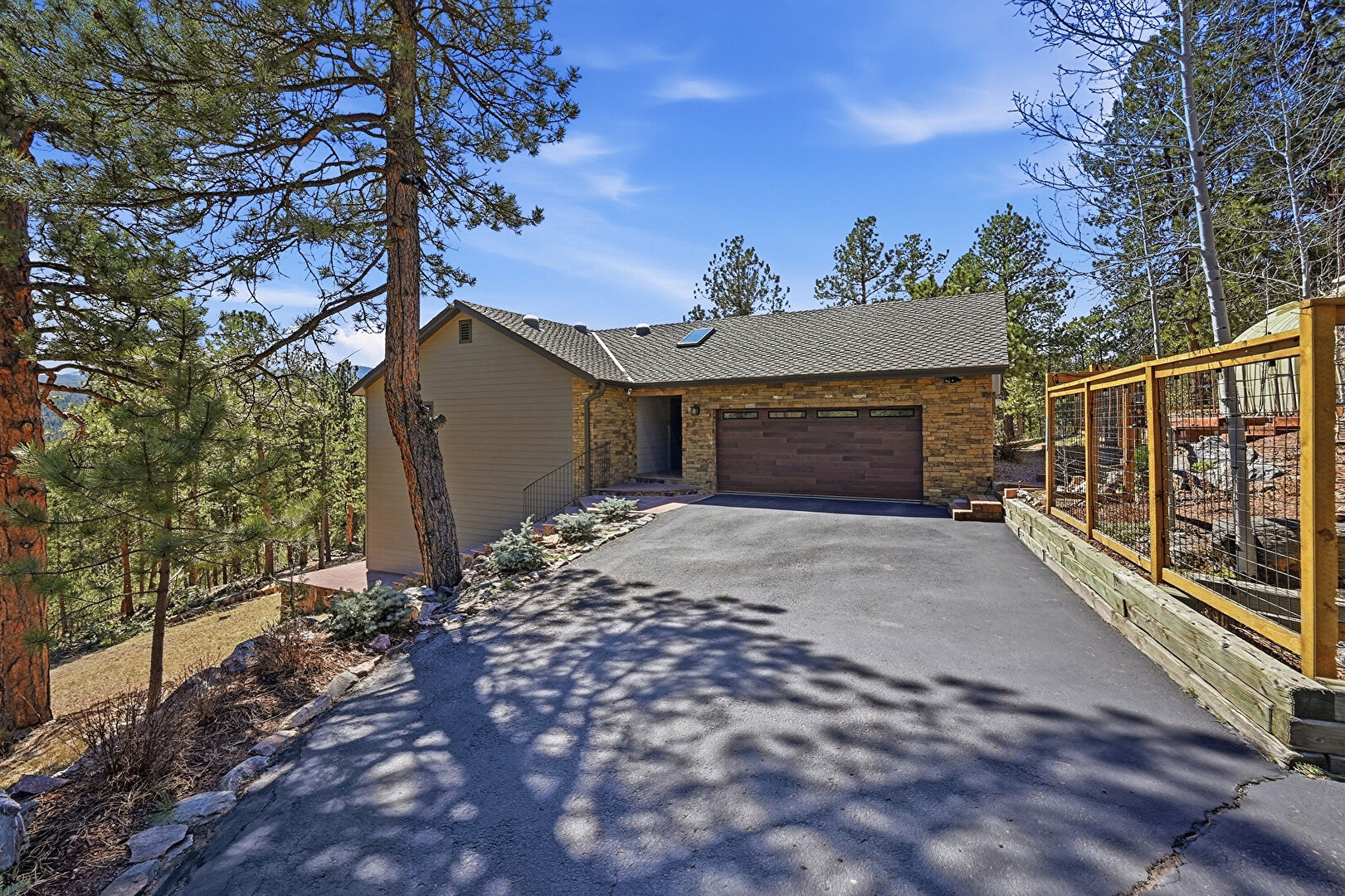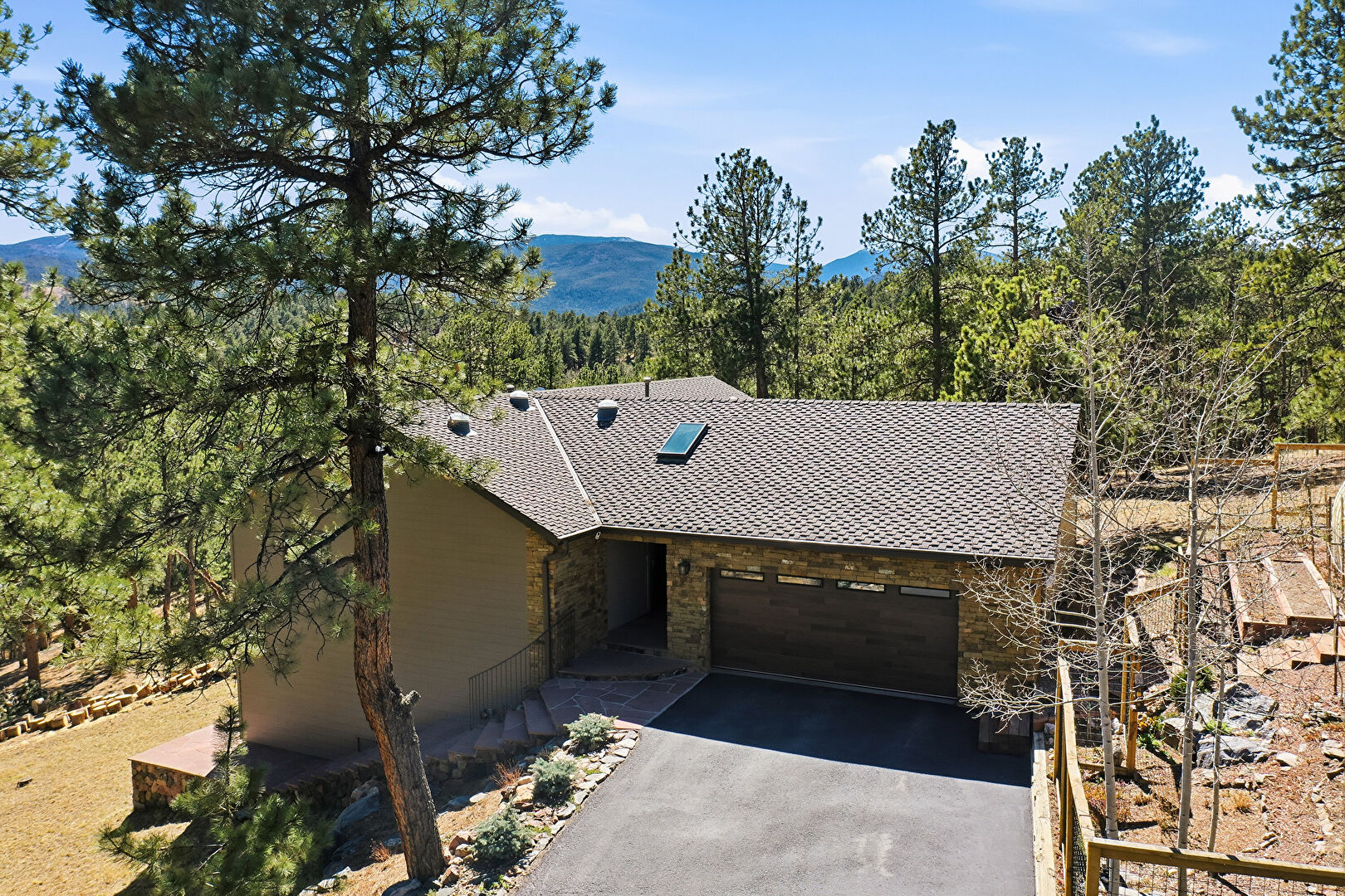 Brick Siding, Downspout, Driveway, Gazebo, Gutters, Horizontal Siding, Mountain View, Parking Pad, Patio, Shingle Roof, Stone Siding, Woods View, Deck, Downspout, Driveway, Mountain View, Shingle Roof
