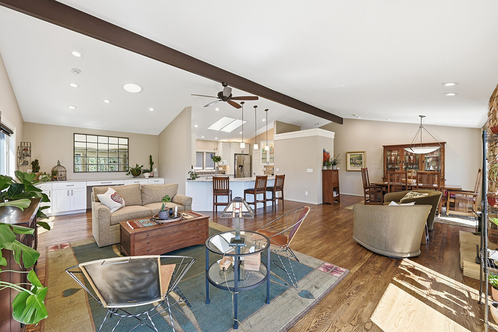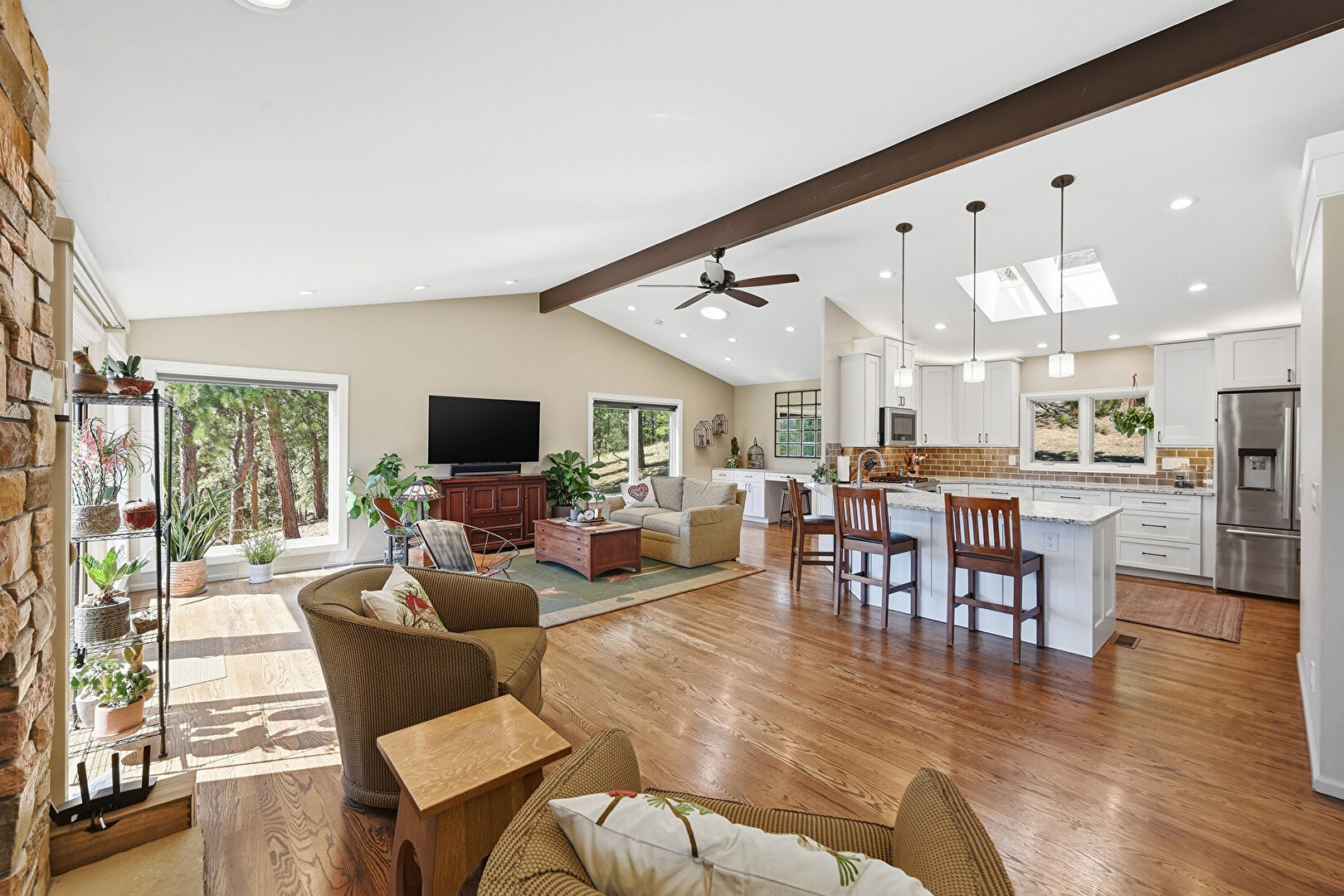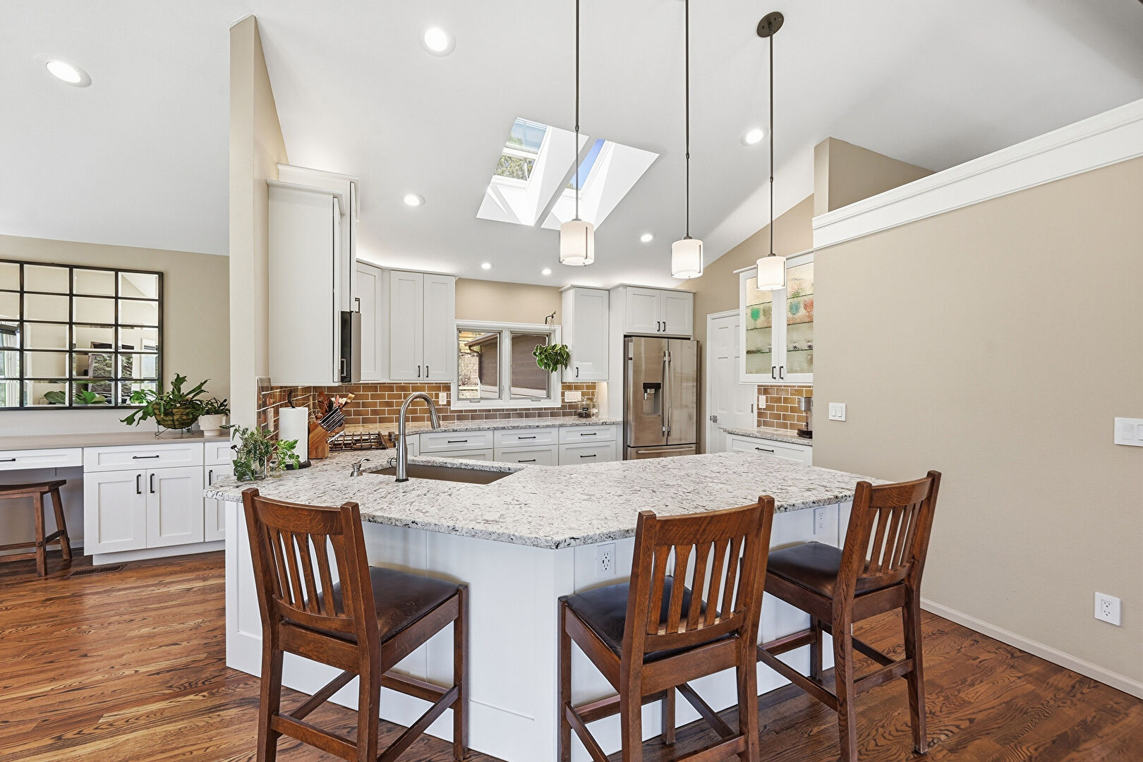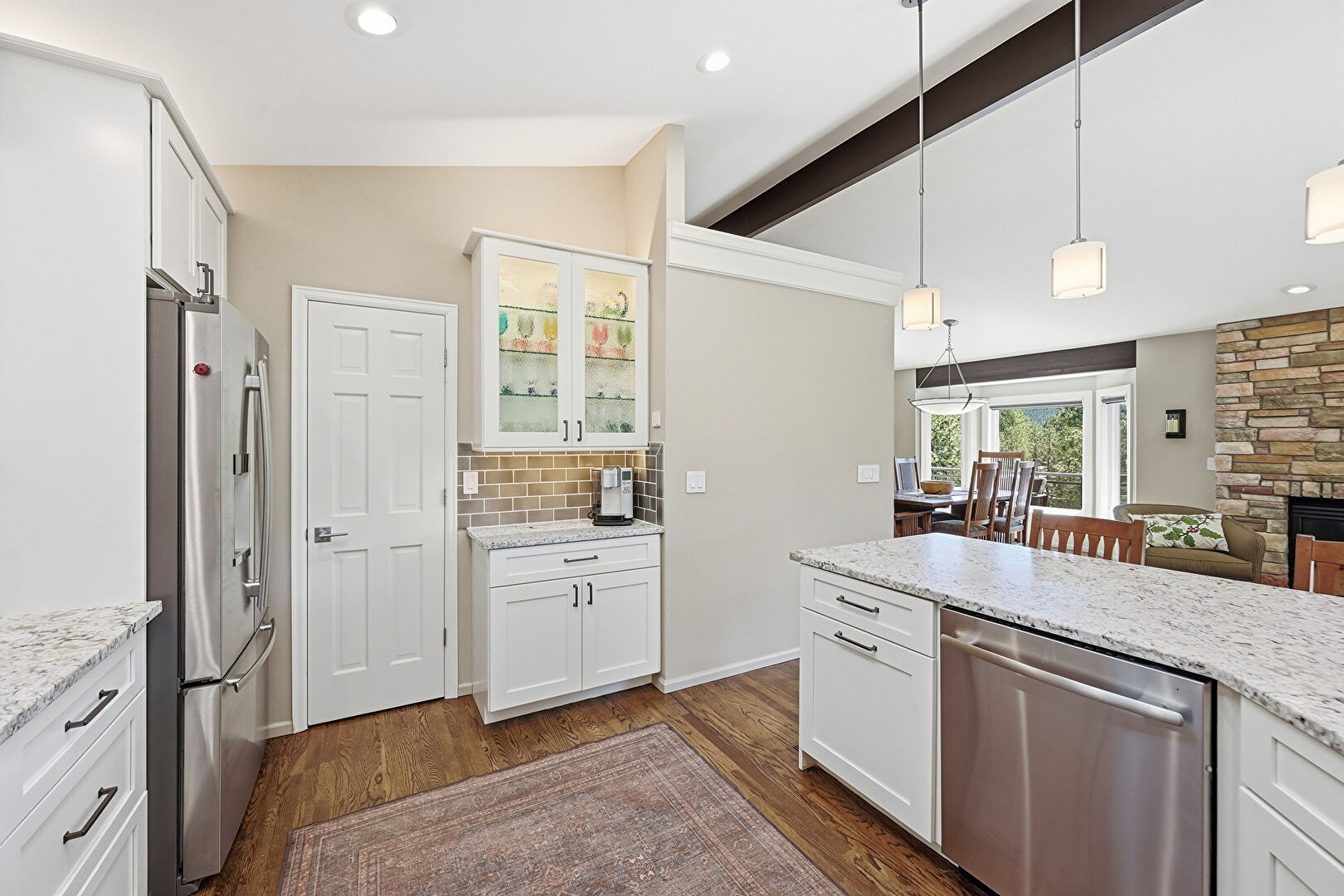Baseboards Wall, Beamed Ceiling, Ceiling Fan, Drywall, Fireplace, G Shaped Kitchen, Glass Insert Cabinets, High Ceiling, Kitchen Bar, Kitchen Peninsula, Natural Light, Opens To Living Area, Pendant Lighting, Recessed Lighting, Shaker Cabinets, Skylight, Stone Countertops, Vaulted Ceiling, Wood Finish Floor, Drywall, Glass Insert Cabinets, Vaulted Ceiling, Wood Finish Floor