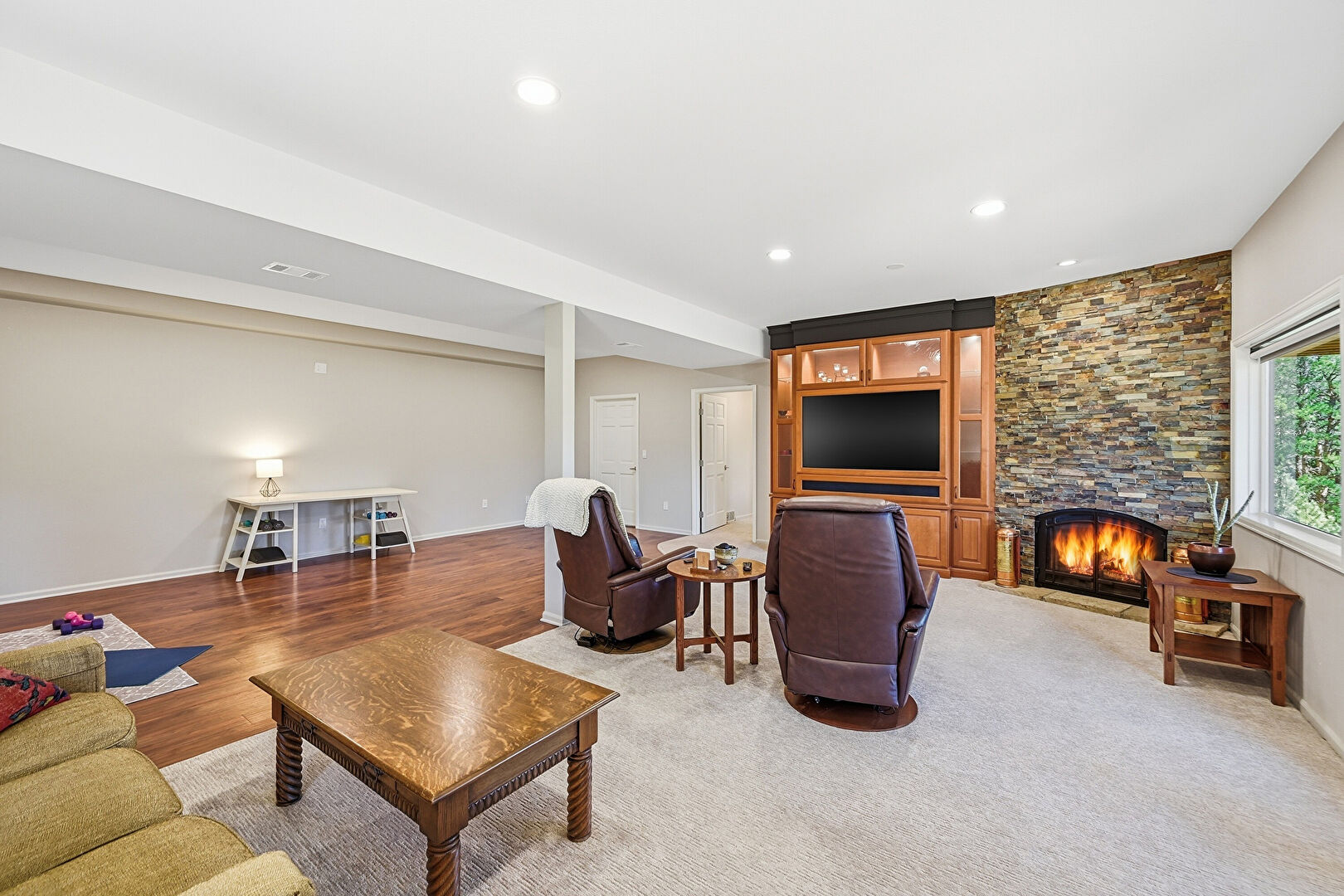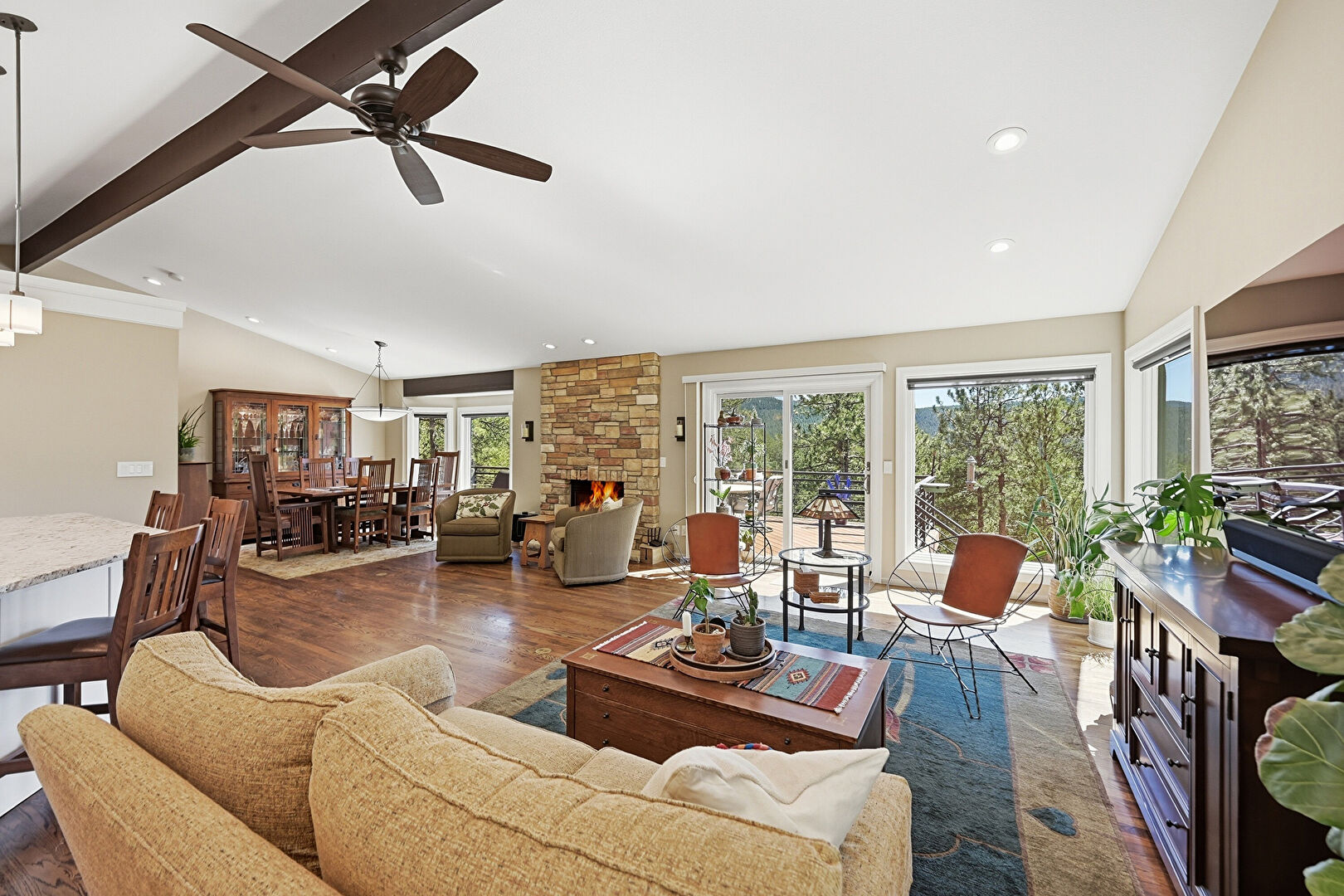 Baseboards Wall, Beamed Ceiling, Drywall, Fireplace, Natural Light, Recessed Lighting, Vaulted Ceiling, Wood Finish Floor, Vaulted Ceiling, Wood Finish Floor