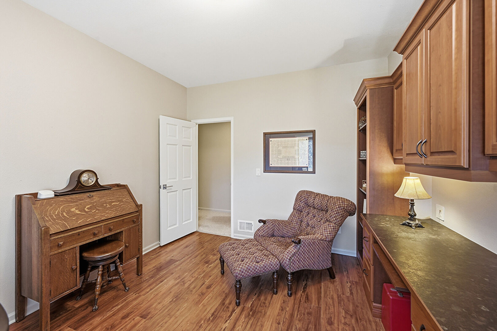 Built In Desk, Drywall, Natural Light, Office Area, Vent, Wood Finish Floor