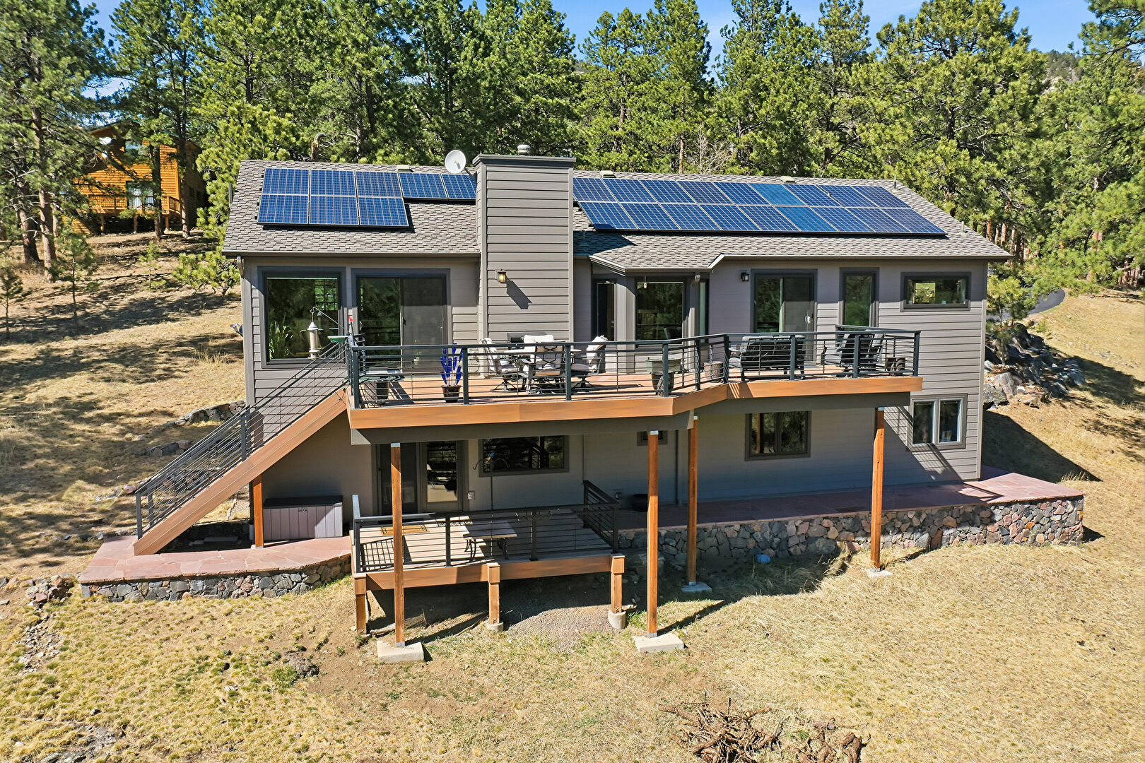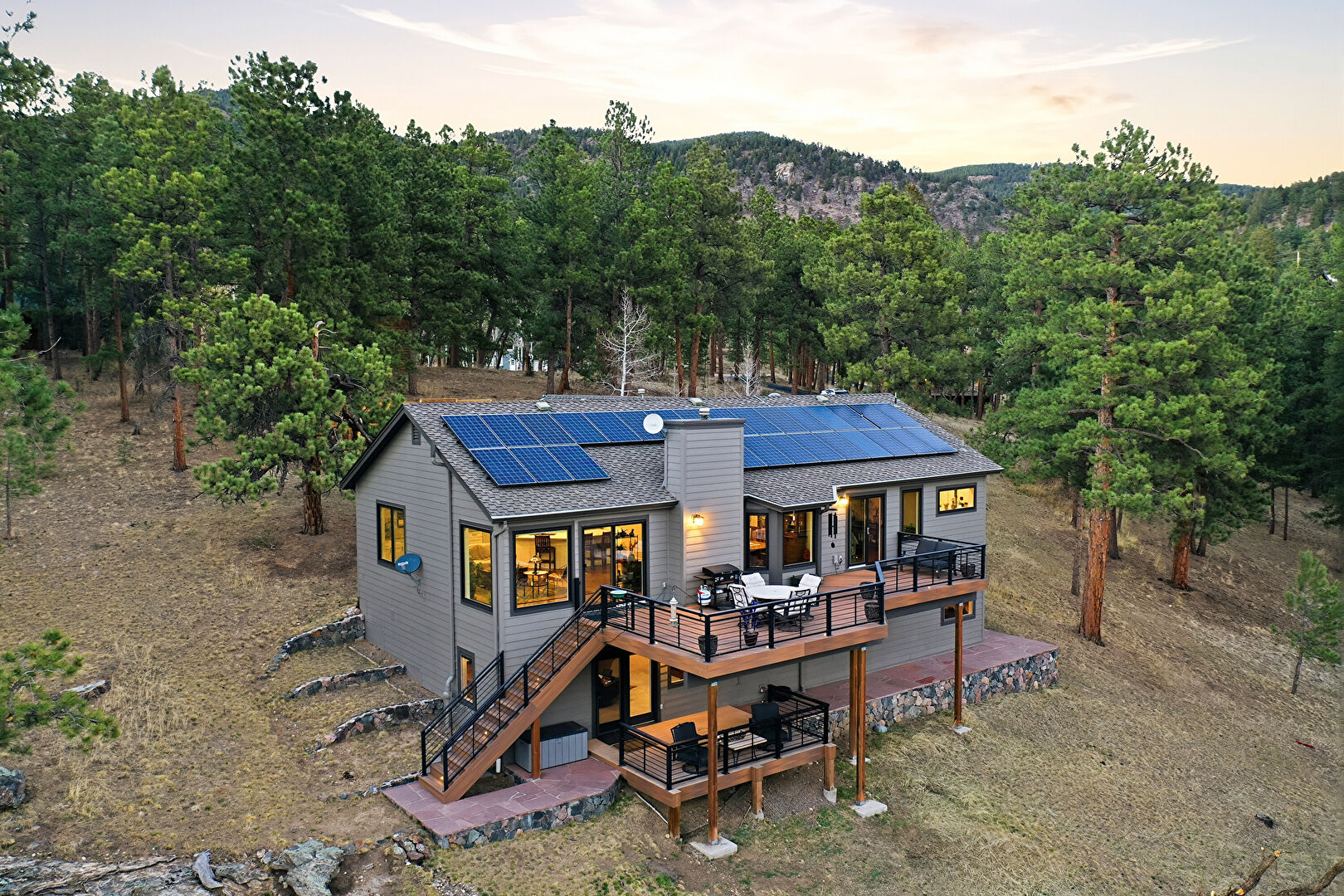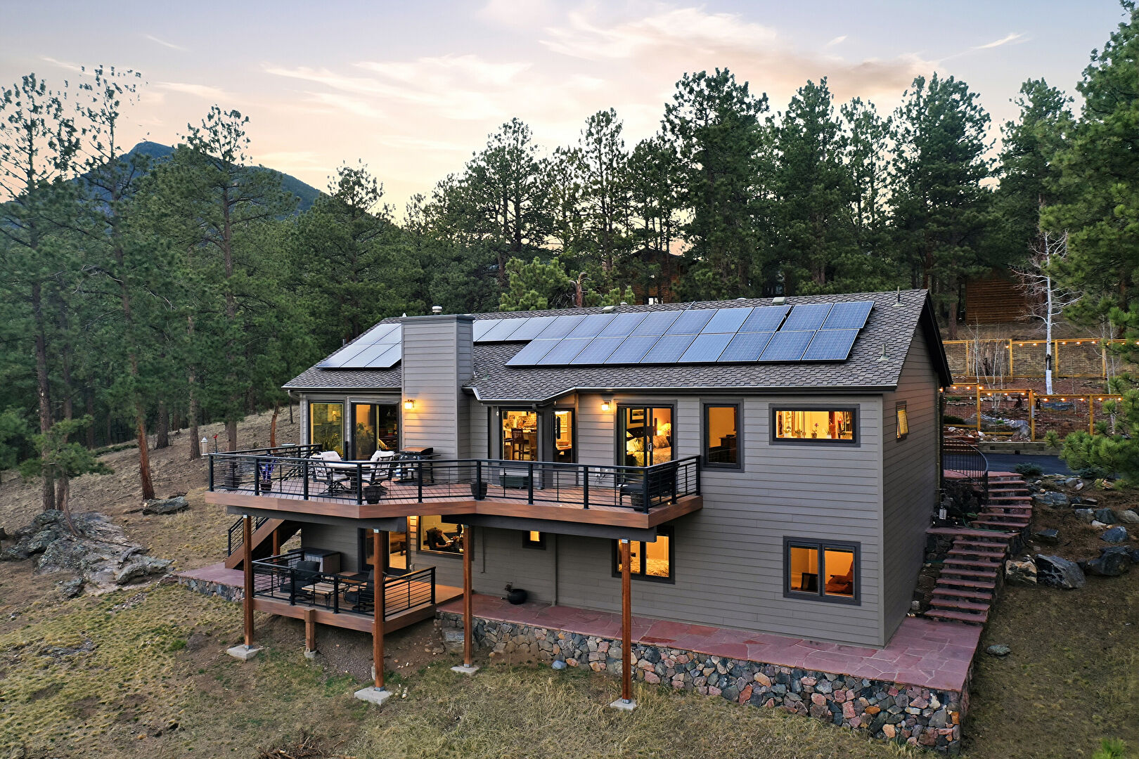 Balcony, Basement Walk Out, Chimney, Deck, Downspout, Forest View, Gutters, Horizontal Siding, Lawn, Mountain View, Outdoor Dining Area, Outdoor Living Space, Patio, Satellite Dish, Shingle Roof, Solar Panels, Stairs, Sunroom, Woods View, Basement Walk Out, Deck, Horizontal Siding, Lawn, Satellite Dish, Shingle Roof, Solar Panels, Stairs