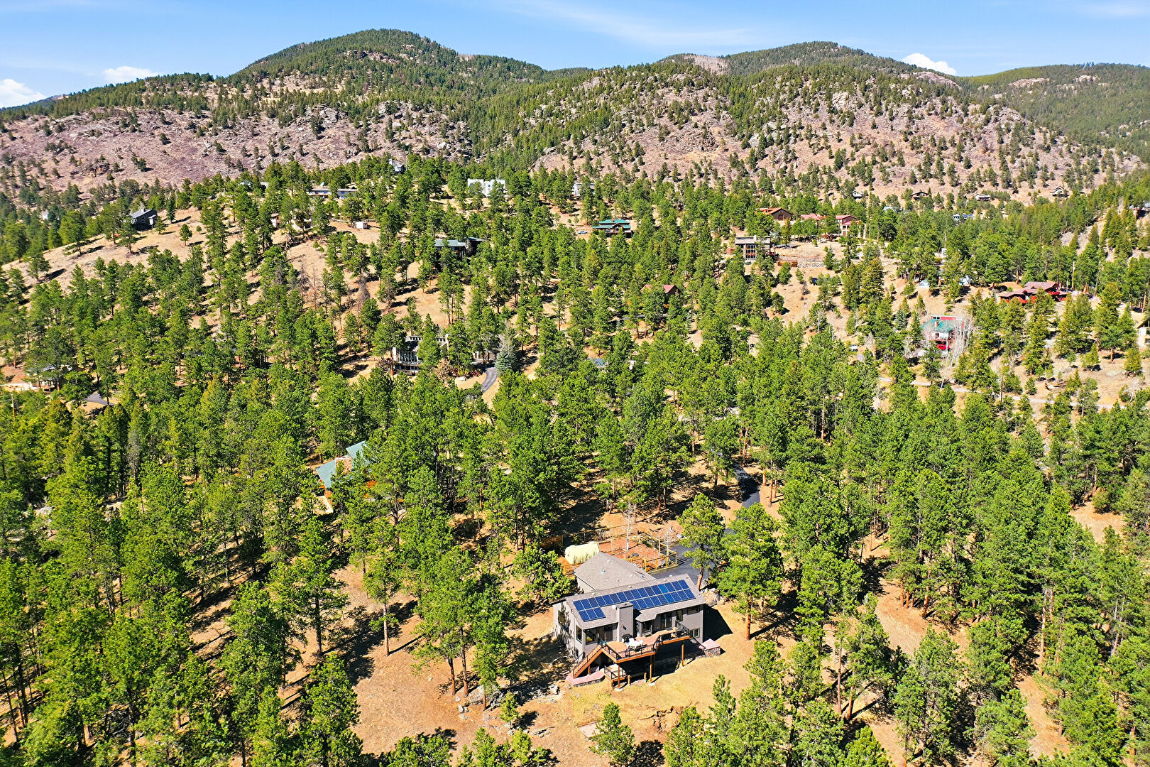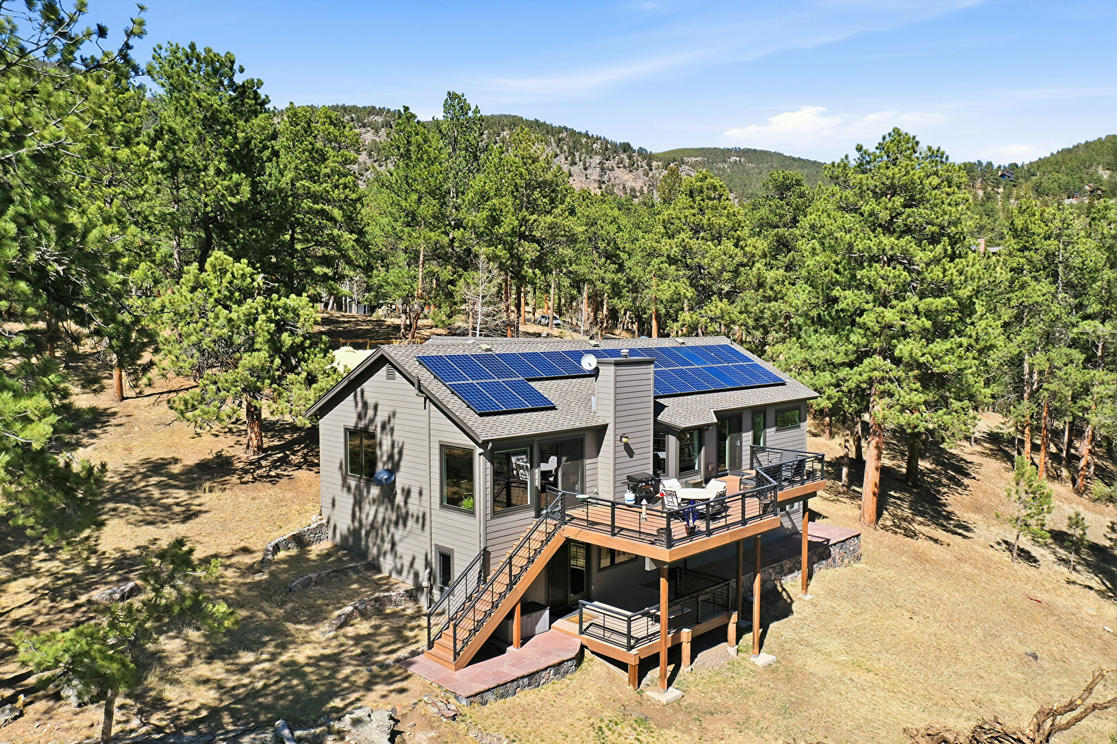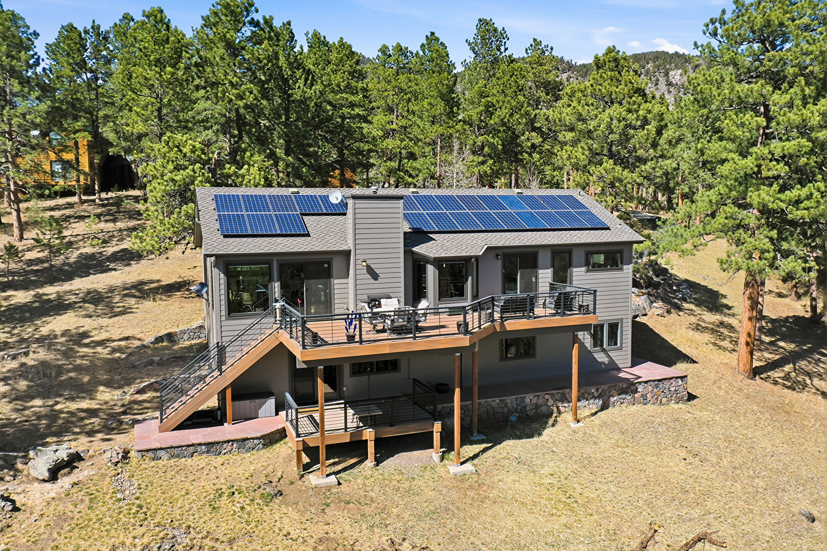 Balcony, Basement Walk Out, Chimney, Deck, Downspout, Forest View, Gutters, Horizontal Siding, Lawn, Mountain View, Outdoor Dining Area, Outdoor Living Space, Patio, Satellite Dish, Shingle Roof, Solar Panels, Stairs, Sunroom, Woods View, Basement Walk Out, Deck, Horizontal Siding, Lawn, Satellite Dish, Shingle Roof, Solar Panels, Stairs