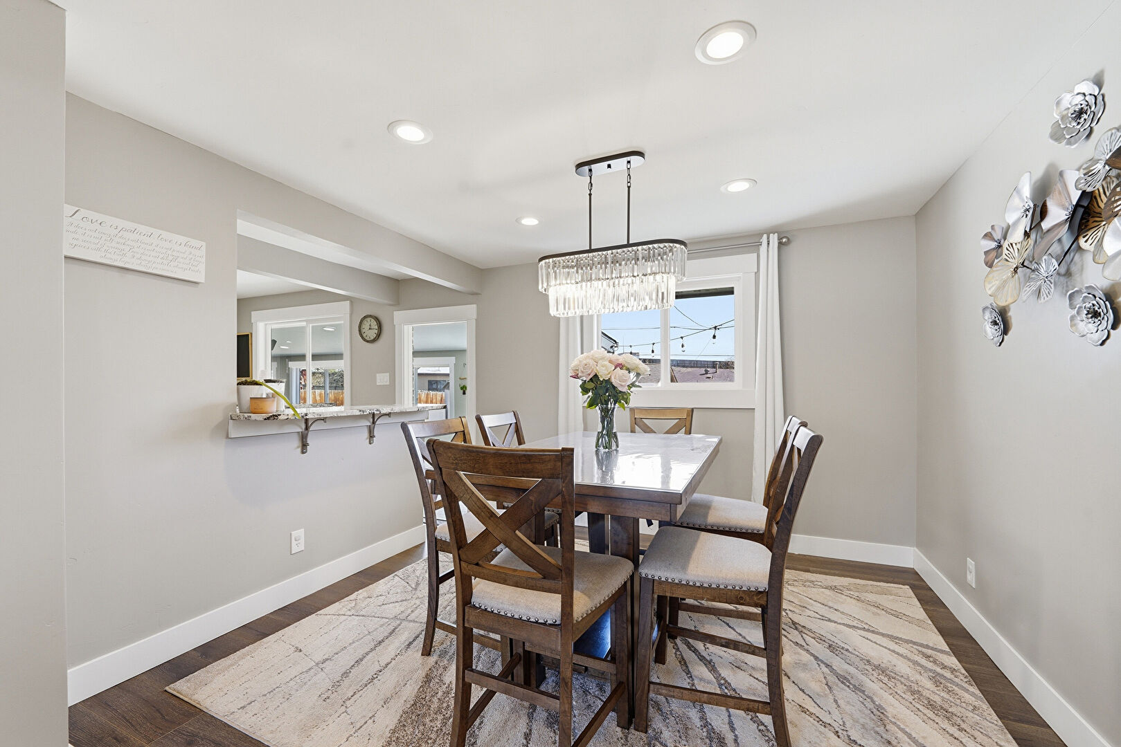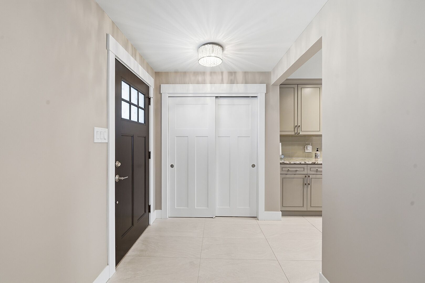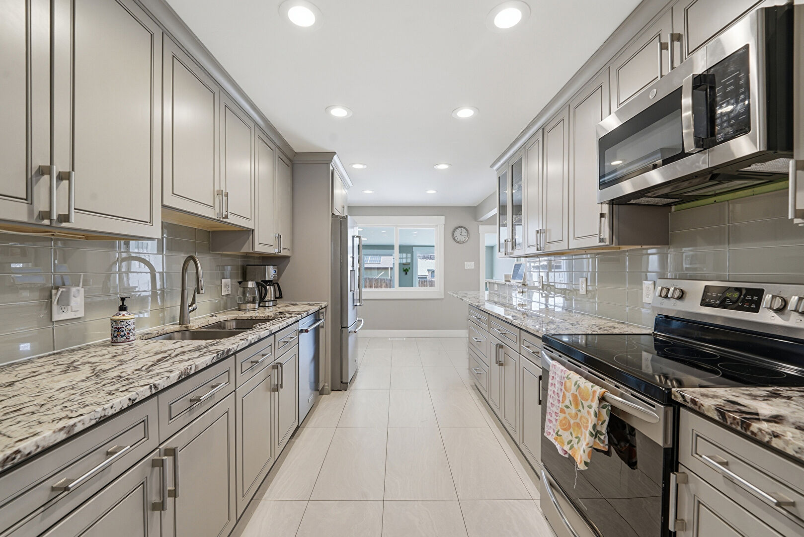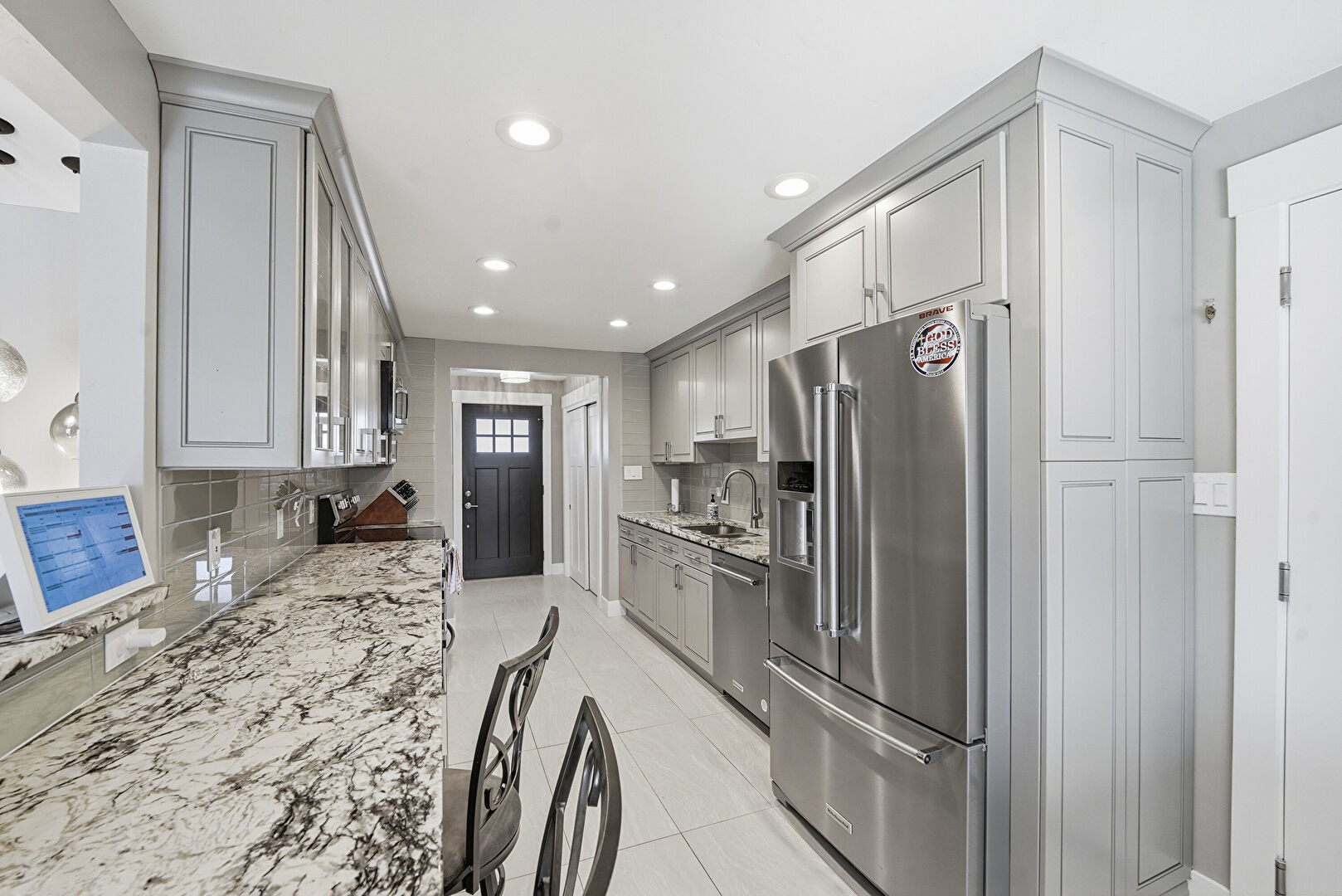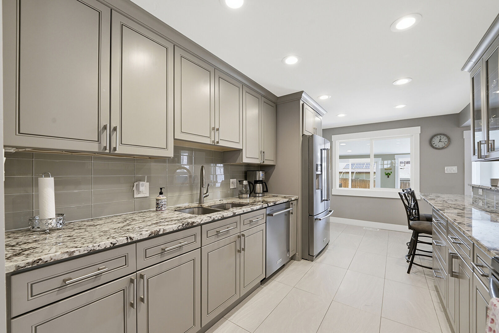 Baseboards Wall, Crown Molding Cabinets, Drywall, Galley Kitchen, Glass Insert Cabinets, Gray Cabinets, Kitchen Bar, Kitchen Peninsula, Natural Light, Notable Chandelier, Pendant Lighting, Raised Cabinets, Recessed Lighting, Stone Countertops, Tile Floor, Crown Molding Cabinets, Natural Light, Raised Cabinets, Stone Countertops