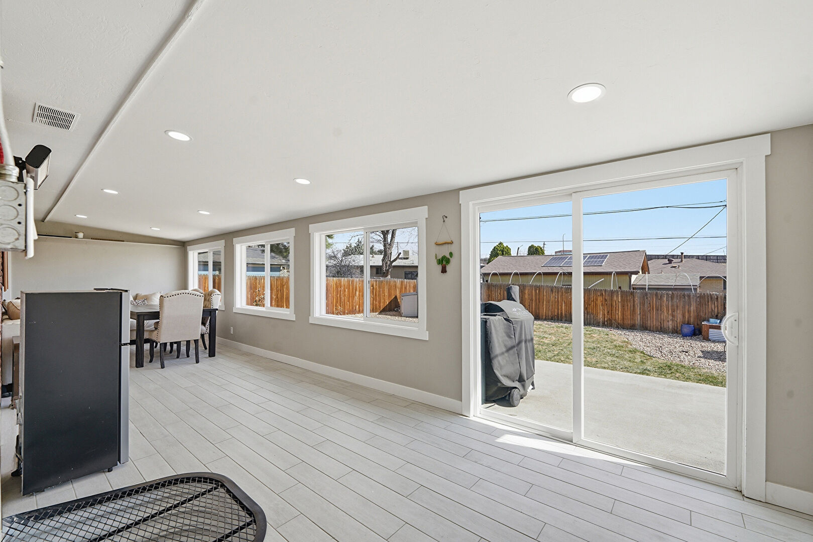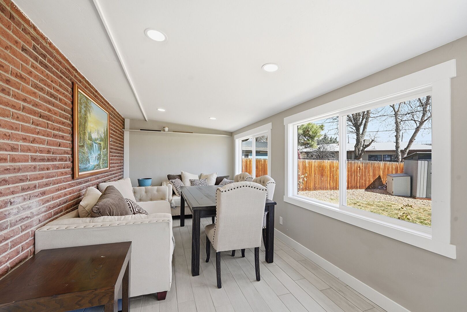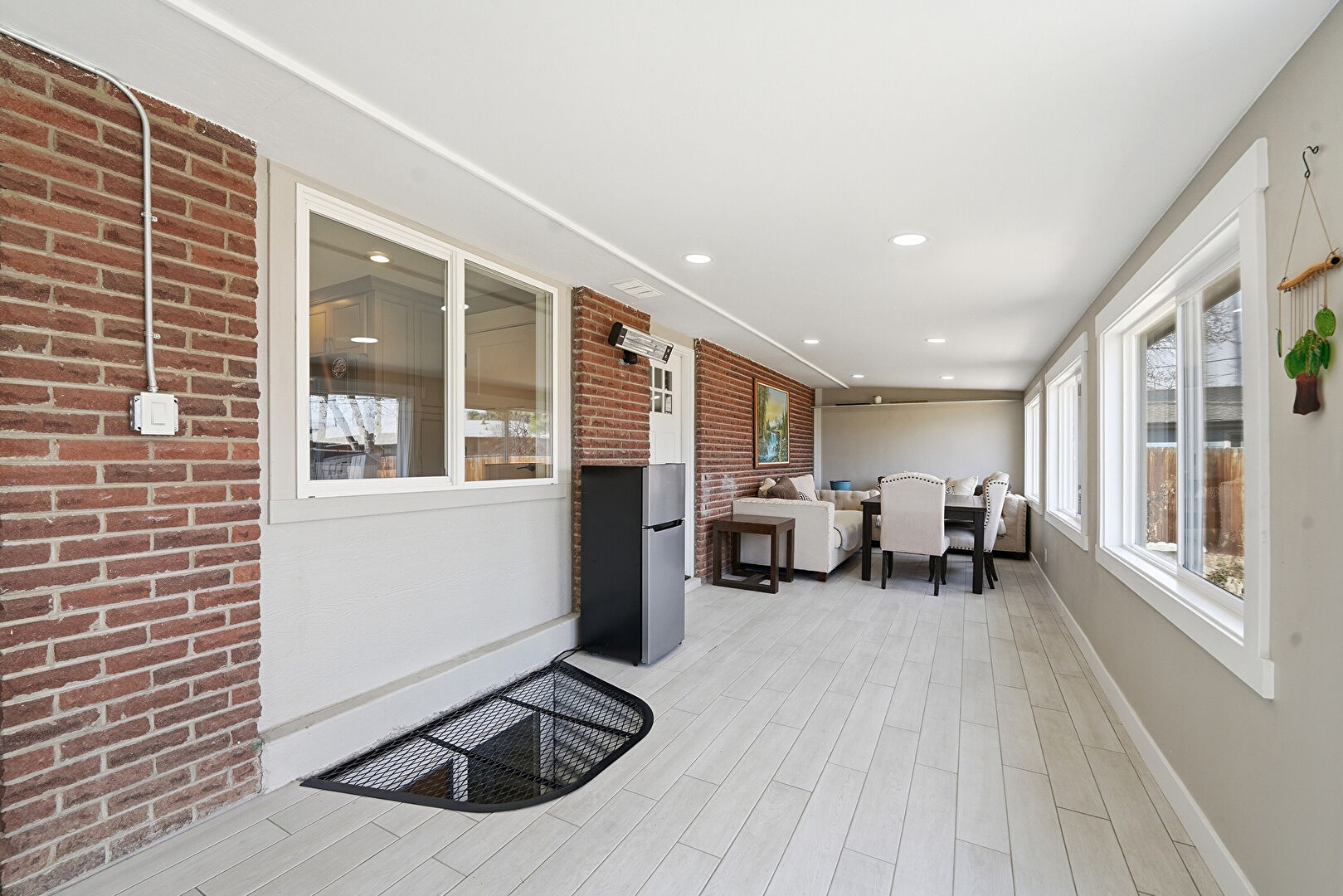 Baseboards Wall, Brick Wall, Drywall, Grill, Natural Light, Vent, Wood Finish Floor, Natural Light, Recessed Lighting