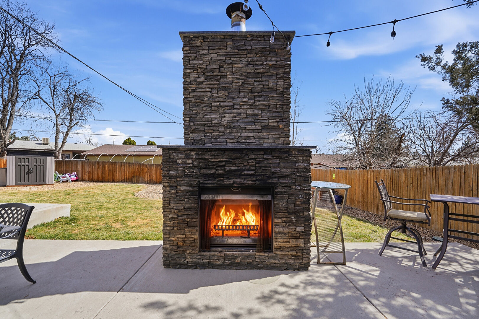 Fence, Fireplace, Lawn, Outdoor Dining Area, Outdoor Living Space, Patio, Shed, Fence, Outdoor Structure