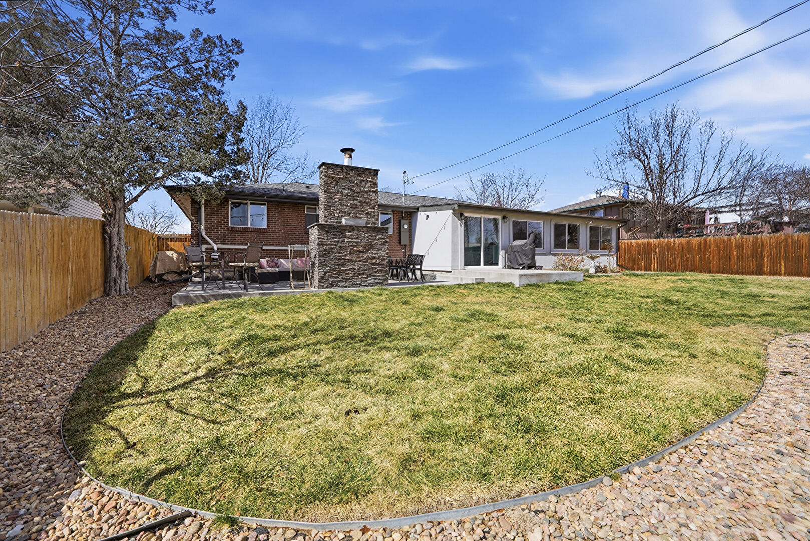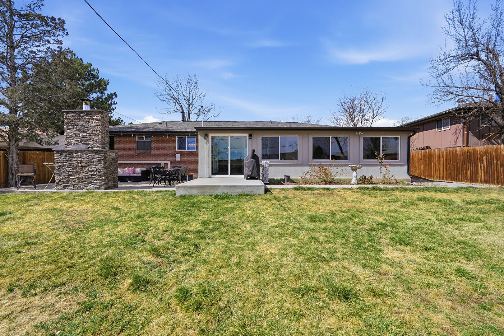Brick Siding, Chimney, Downspout, Electric Meter, Fence, Fireplace, Garden, Grill, Gutters, Lawn, Outdoor Dining Area, Outdoor Living Space, Outdoor Structure, Patio, Sunroom, Water Meter, Lawn, Patio, Shed