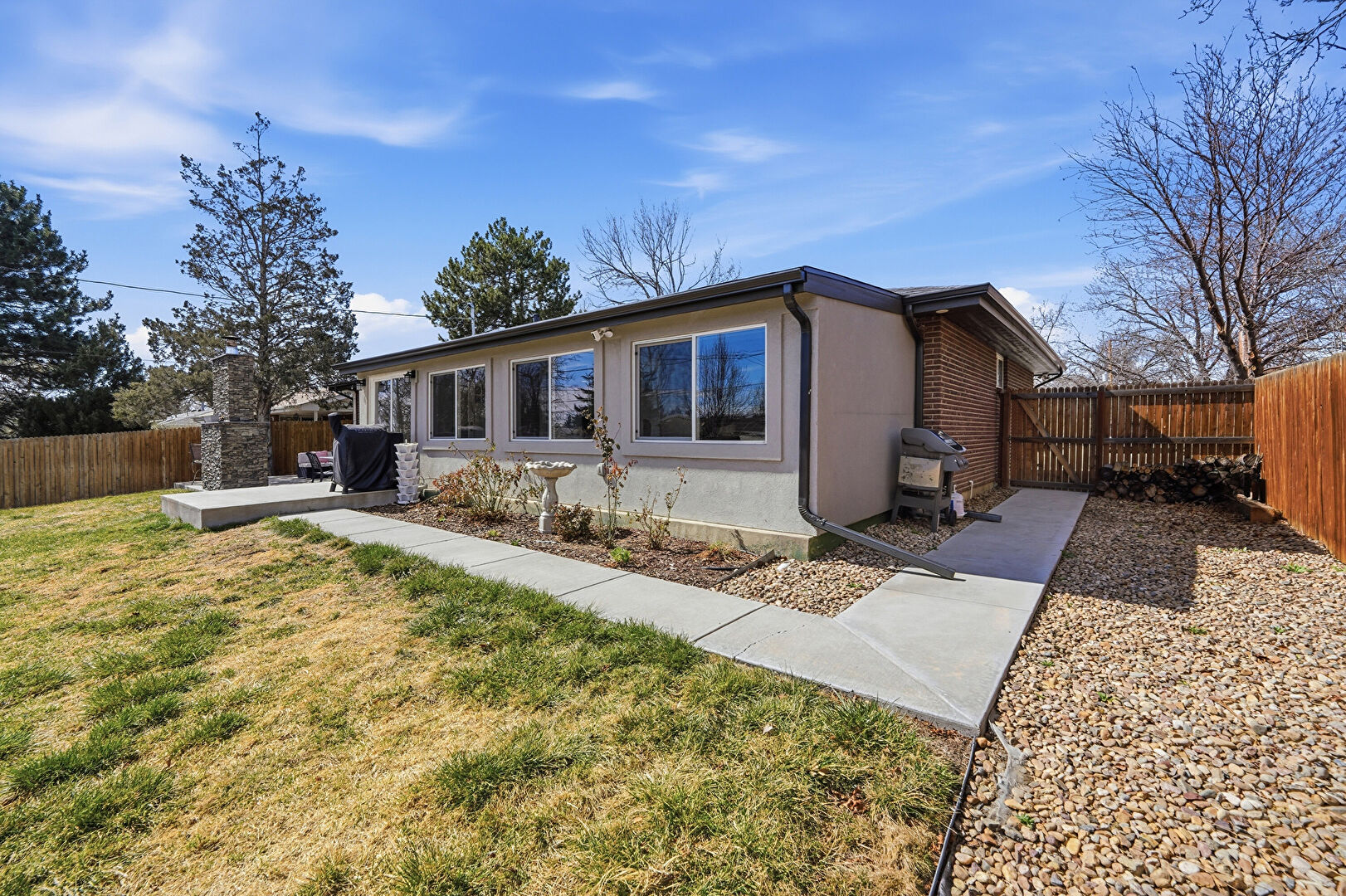 Brick Siding, Chimney, Concrete Foundation, Downspout, Driveway, Fence, Gate, Grill, Gutters, Lawn, Parking Pad, Patio, Porch, Shingle Roof, Stucco Siding, Concrete Foundation, Downspout, Driveway, Fence, Horizontal Siding, Lawn, Shingle Roof