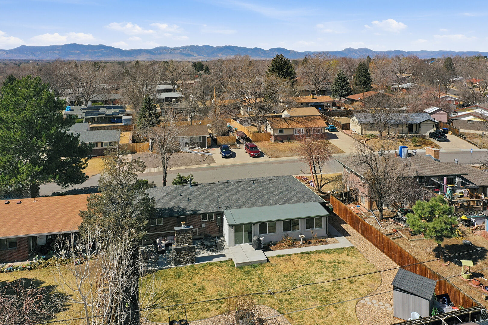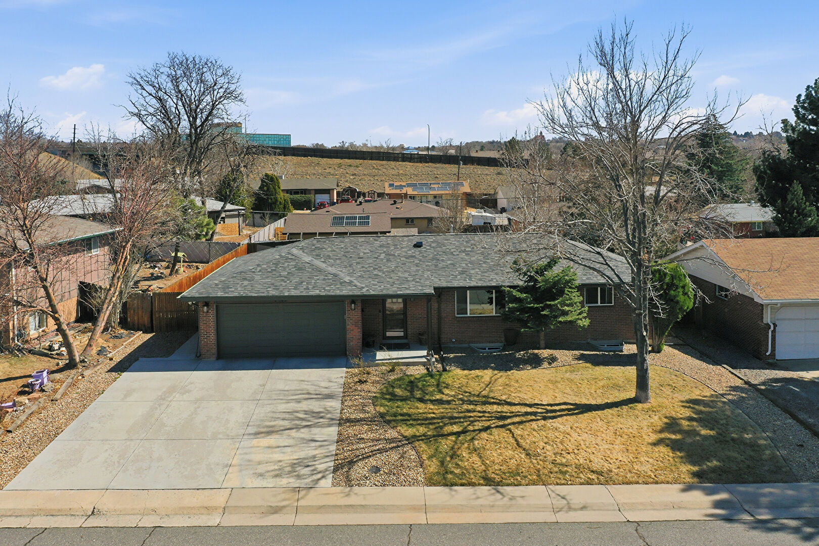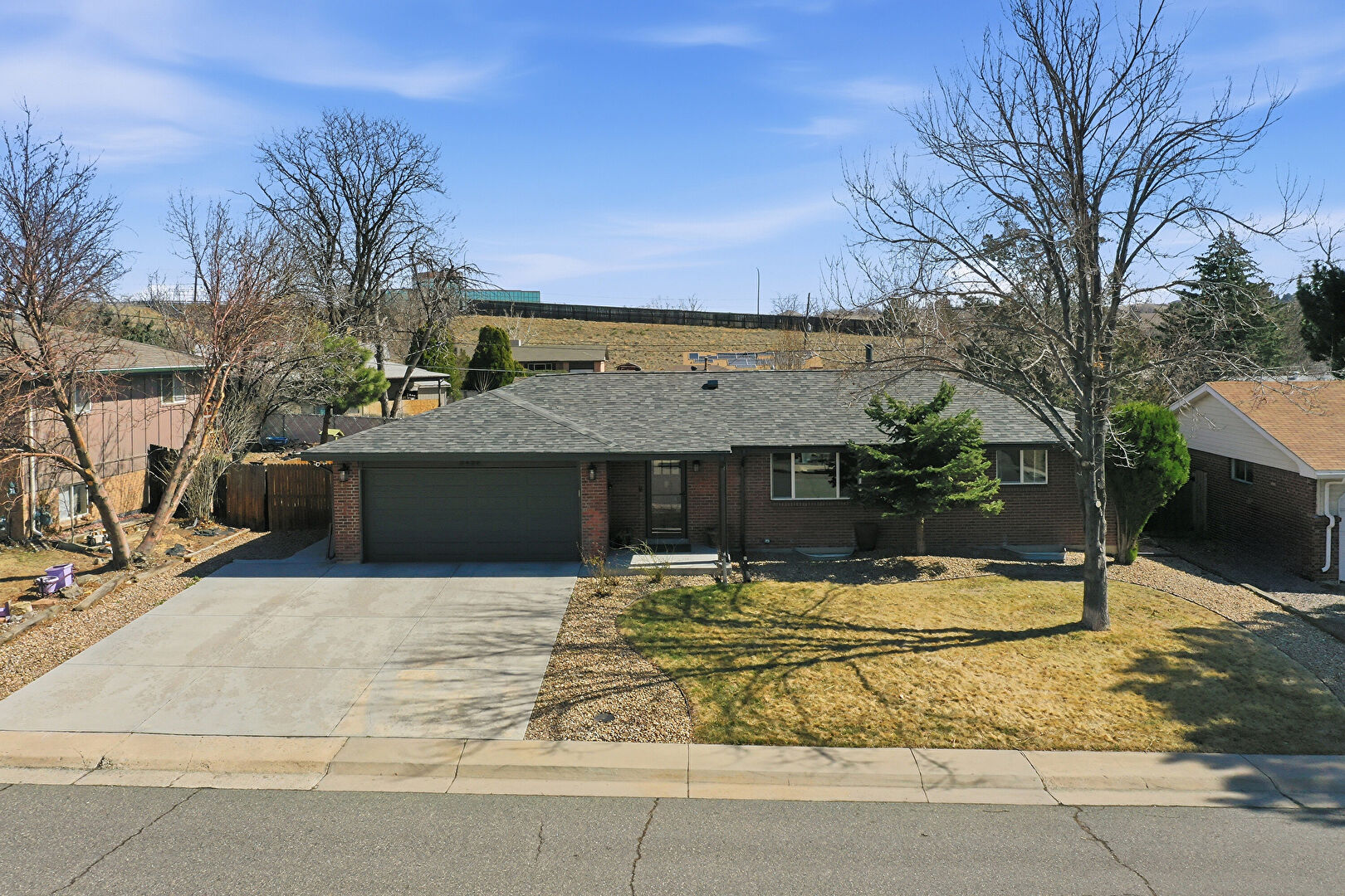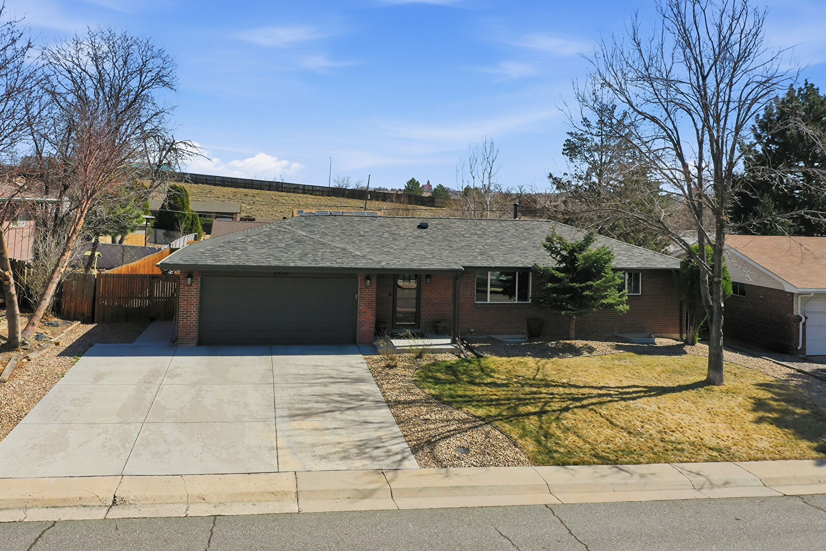 Brick Siding, Concrete Foundation, Downspout, Driveway, Fence, Lawn, Mountain View, Parking Pad, Residential View, Shingle Roof, Concrete Foundation, Driveway, Fence, Mountain View, Parking Pad, Residential View