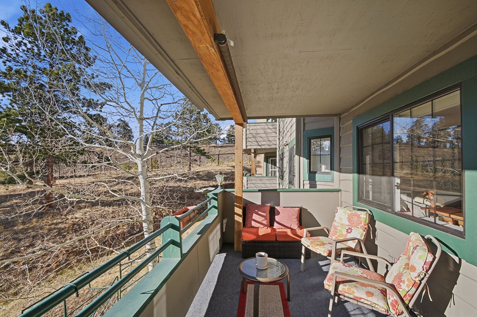Patio, Apartment Complex View, Stone Siding