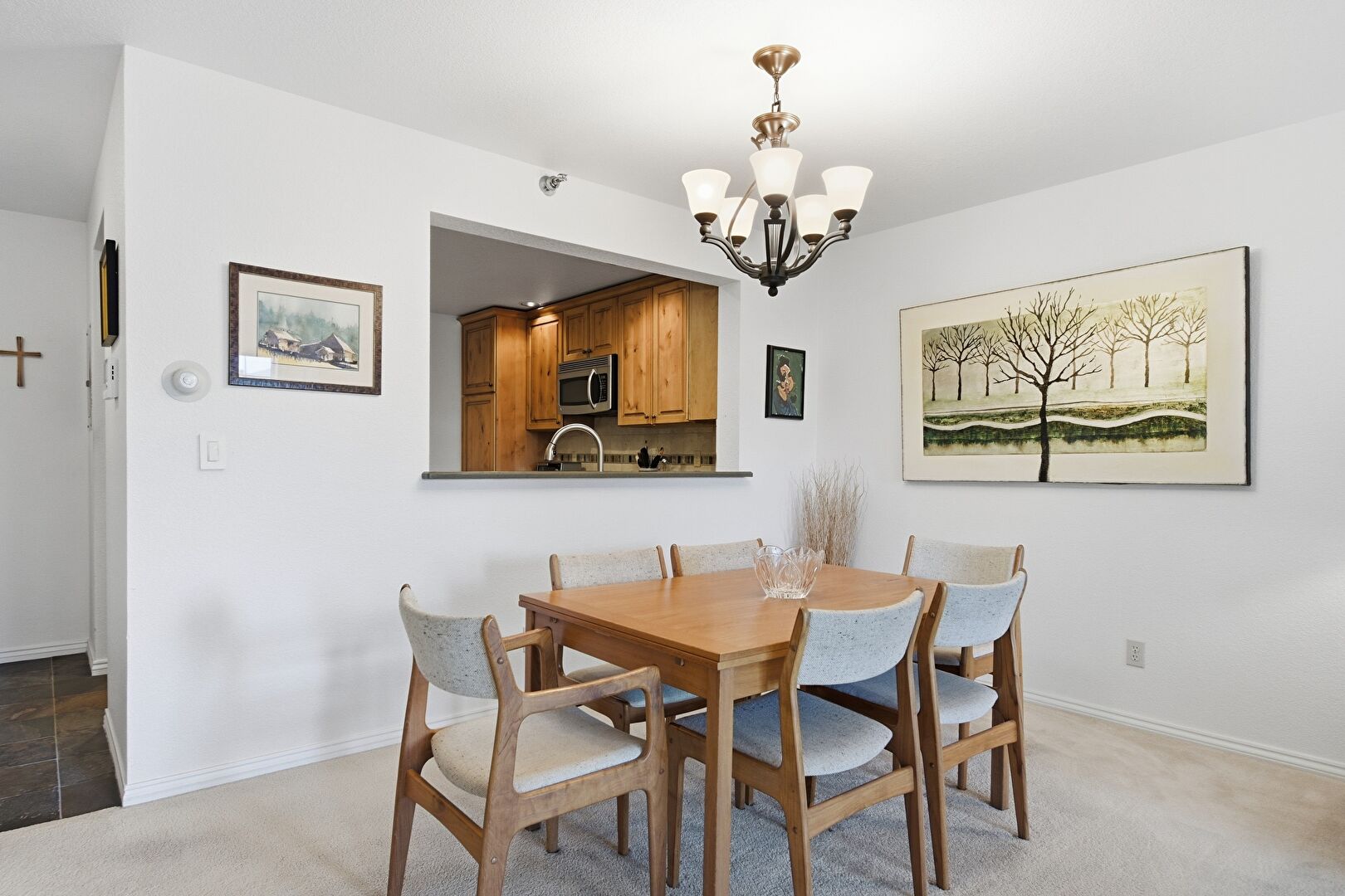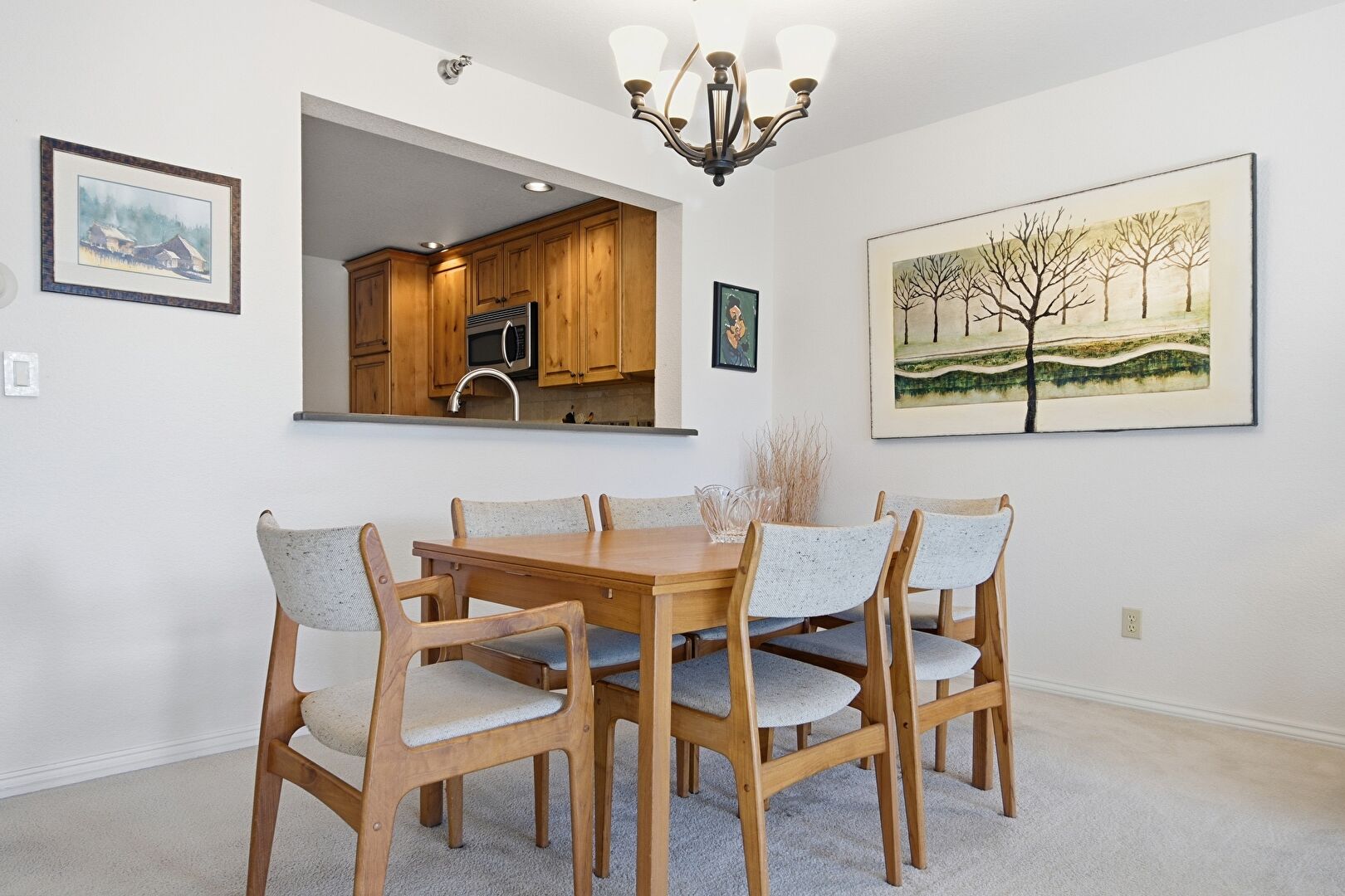 Baseboards Wall, Carpet, Crown Molding Cabinets, Drywall, Fireplace, Glass Insert Cabinets, High Ceiling, Medium Brown Cabinets, Natural Light, Notable Chandelier, Opens To Living Area, Pendant Lighting, Raised Cabinets, Recessed Lighting, Stone Countertops, Stone Finish Floor, Toaster, Baseboards Wall, Drywall, Glass Insert Cabinets, Pass Through Window