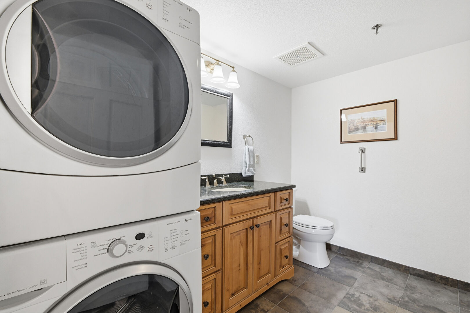 Baseboards Wall, Drywall, Half Bathroom, Laundry, Pendent Fire Sprinkler, Textured Wall, Vanity, Vent, Tile Floor, Vanity