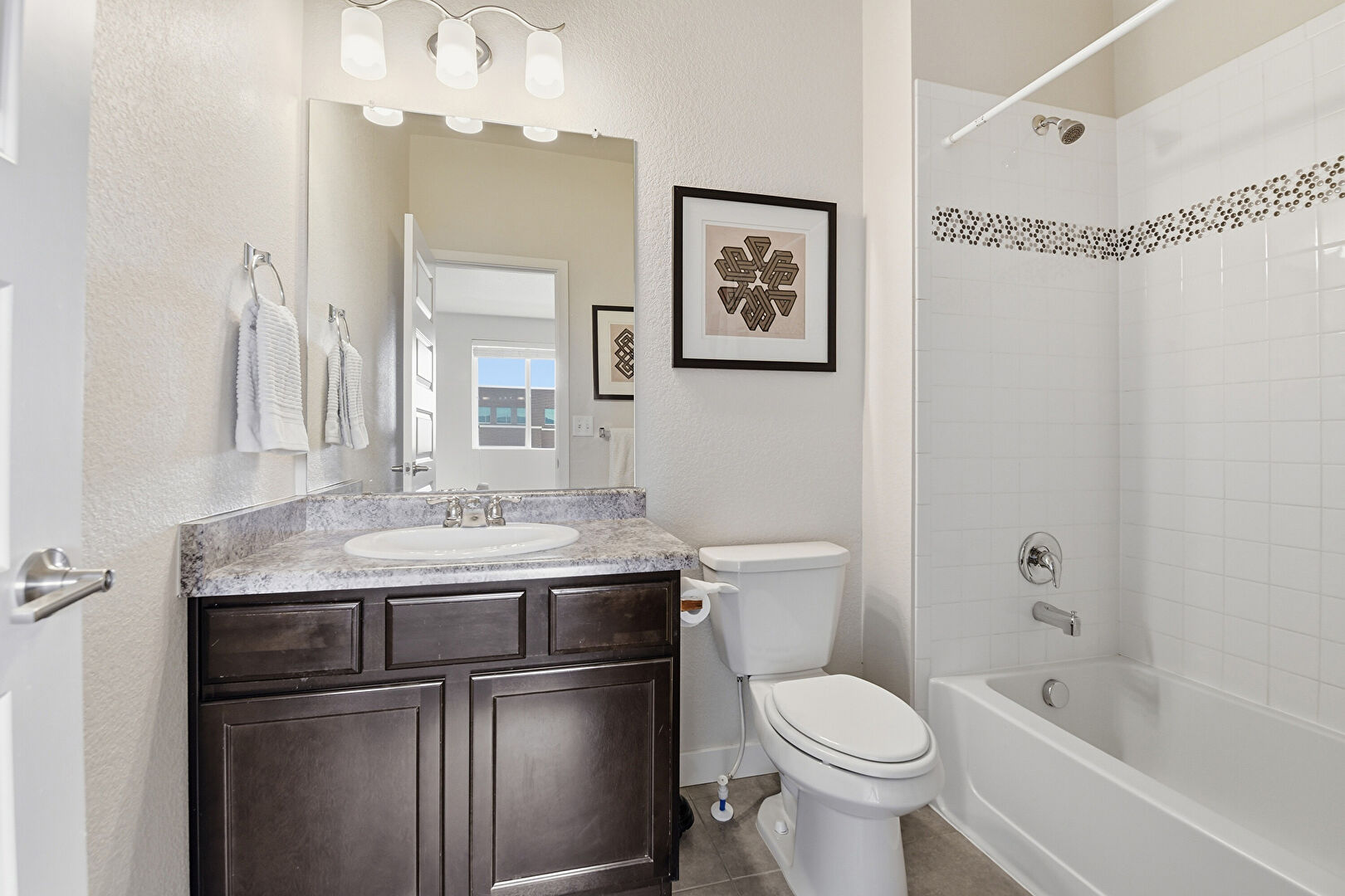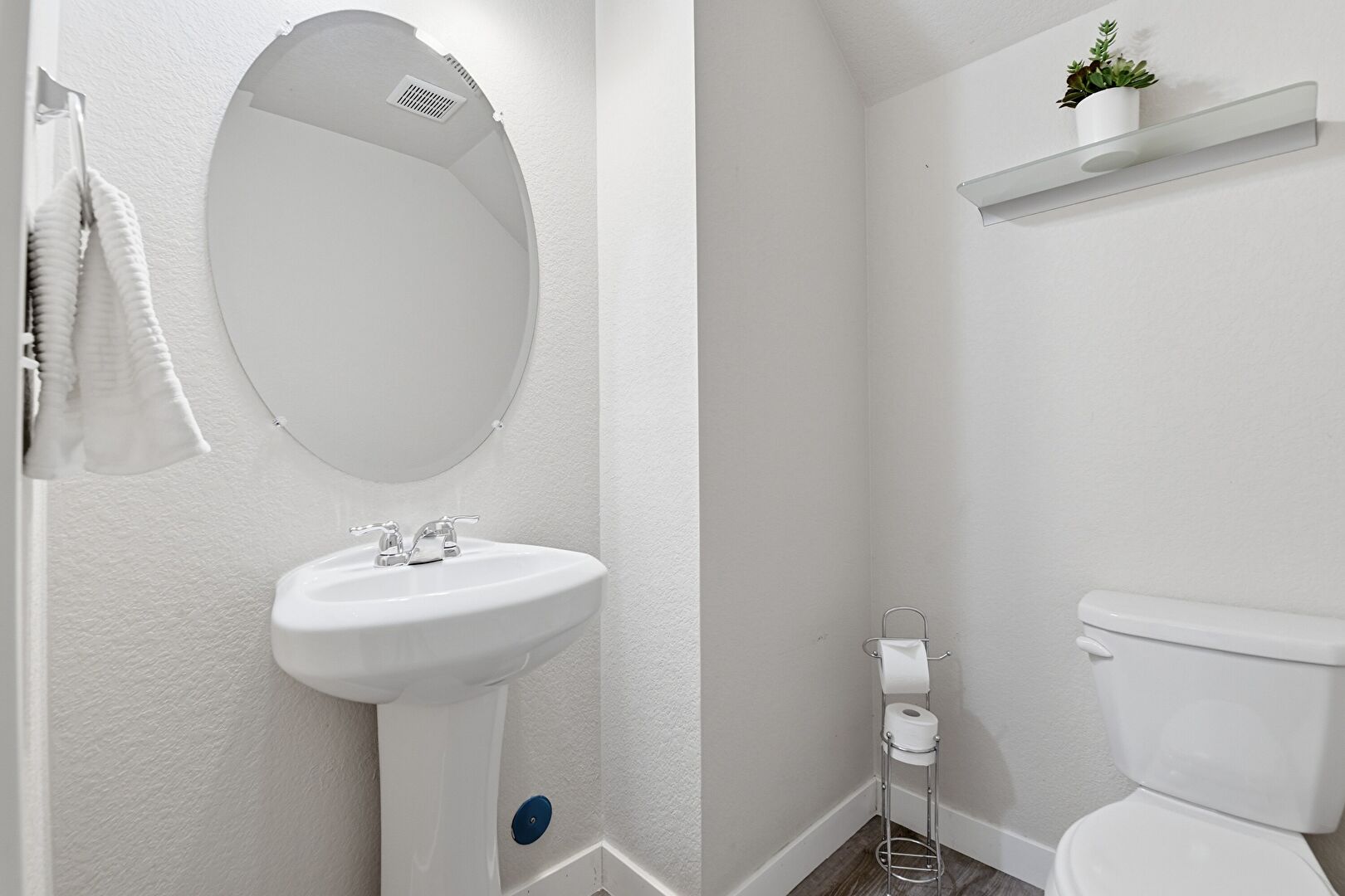 Baseboards Wall, Full Bathroom, Natural Light, Textured Wall, Tile Floor, Vanity, Vent, Wood Finish Floor, Combined Bath Shower, Half Bathroom