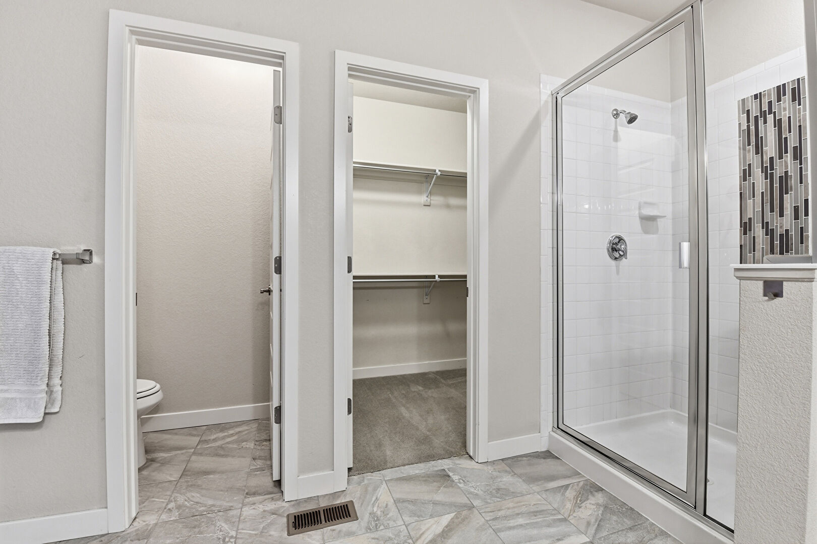 Baseboards Wall, Double Vanity, Drywall, Full Bathroom, Marble Finish Floor, Walk In Closet, Water Closet, Marble Finish Floor, Vent