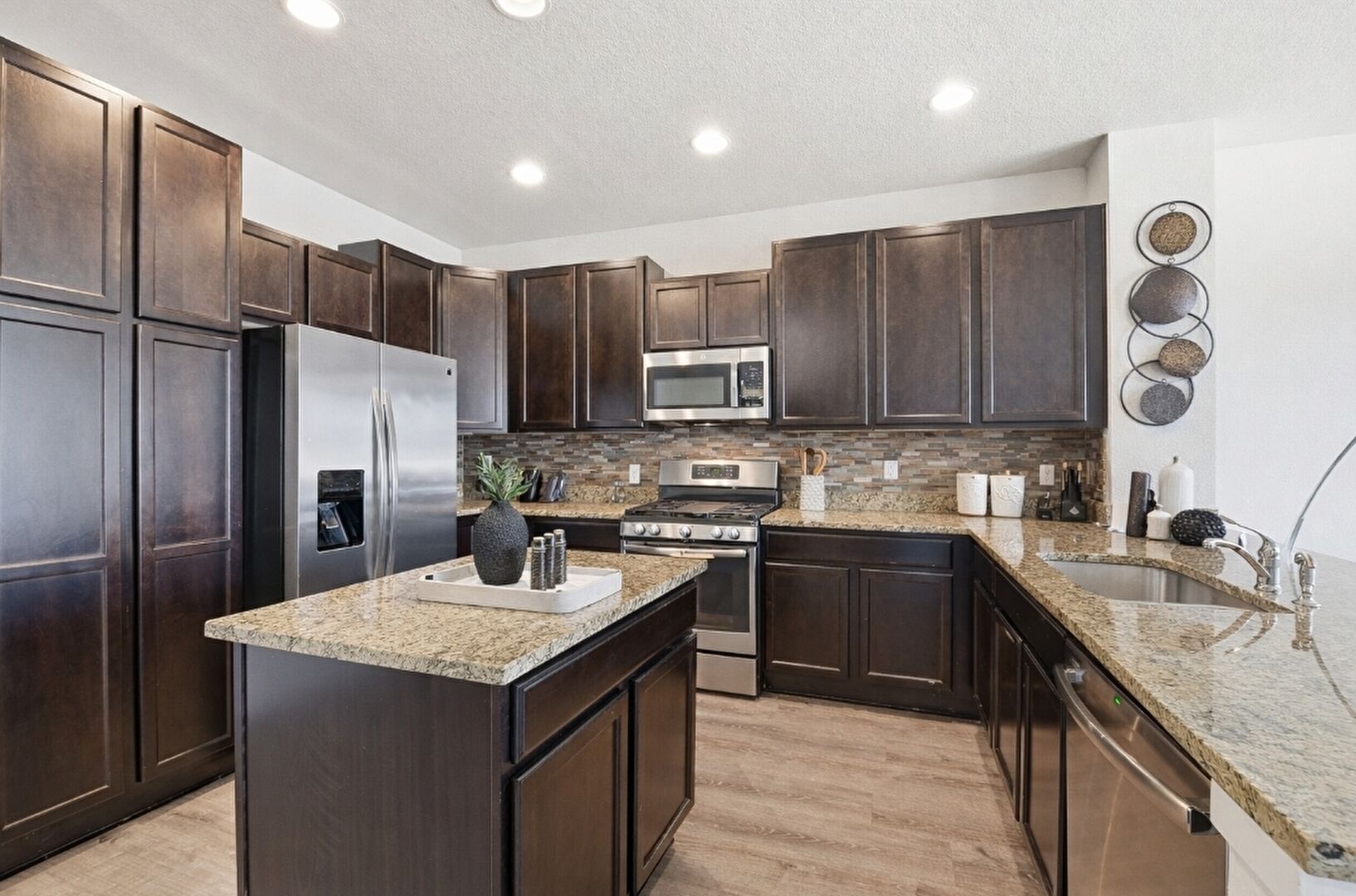 Dark Brown Cabinets, Drywall, Kitchen Bar, Kitchen Island, Kitchen Peninsula, Recessed Lighting, Shaker Cabinets, Stone Countertops, U Shaped Kitchen, Vent, Wood Finish Floor, Baseboards Wall, Recessed Lighting