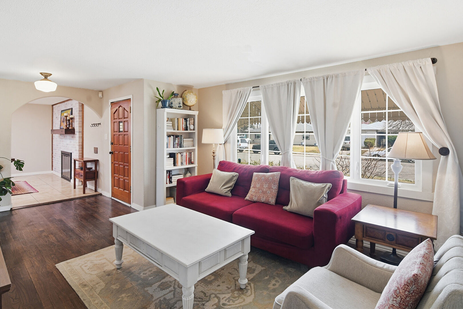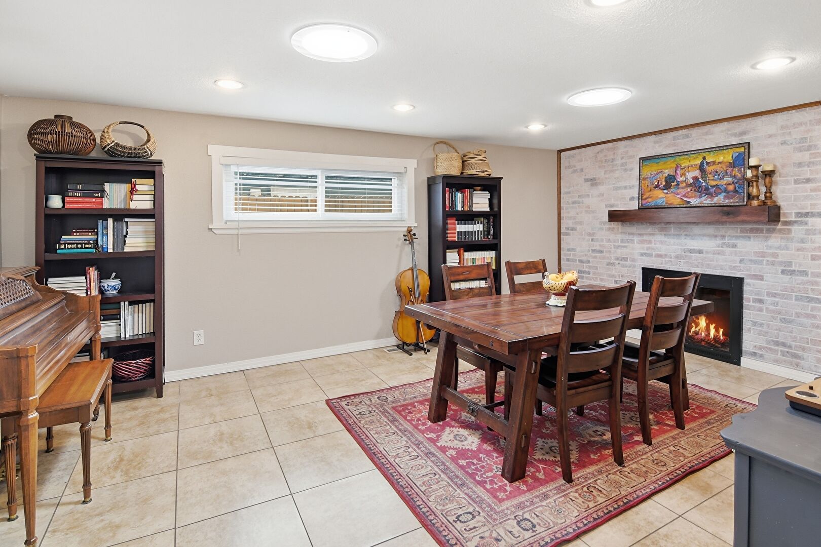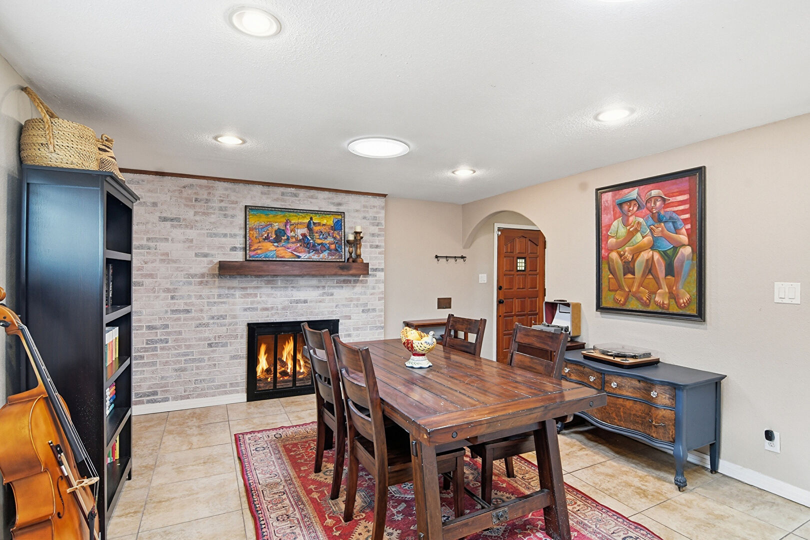 Arched Walkways, Baseboards Wall, Brick Wall, Drywall, Fireplace, Natural Light, Recessed Lighting, Tile Floor, Accent Wall, Drywall
