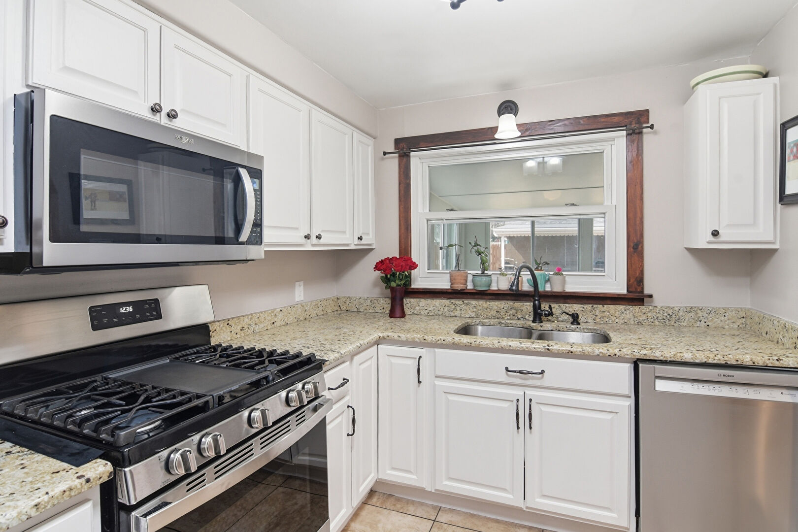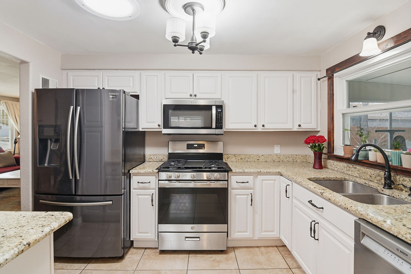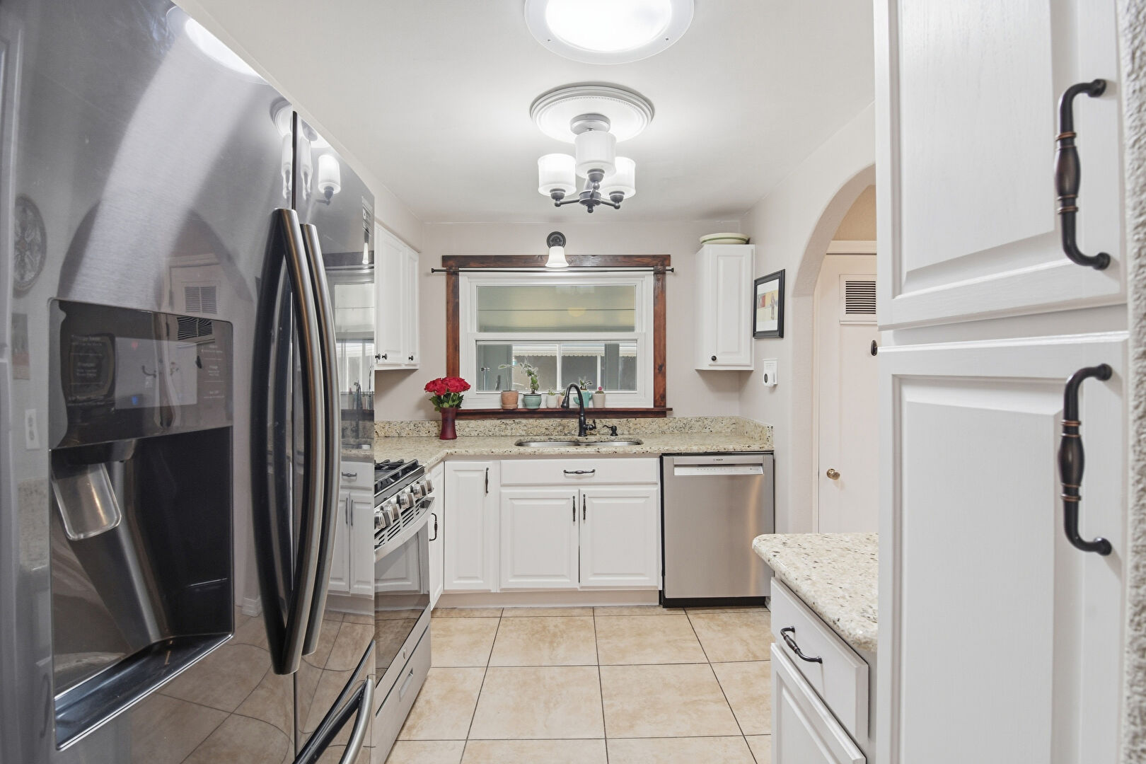 Arched Walkways, Drywall, Natural Light, Notable Chandelier, Raised Cabinets, Stone Countertops, Tile Floor, Vent, Natural Light, Raised Cabinets, Stone Countertops