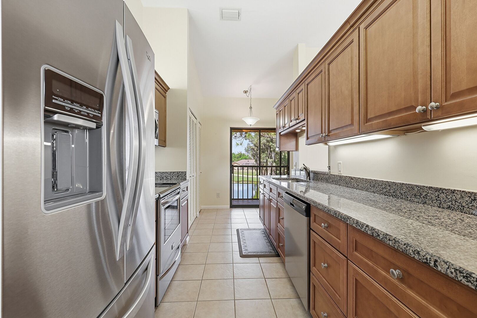 Baseboards Wall, Crown Molding Cabinets, Drywall, Galley Kitchen, High Ceiling, Medium Brown Cabinets, Natural Light, Pass Through Window, Pendant Lighting, Raised Cabinets, Shaker Cabinets, Stone Countertops, Tile Floor, Vent, Wall Furnace, Washer Dryer, Washer Hookup, Baseboards Wall, Drywall, Laundry, Pendant Lighting