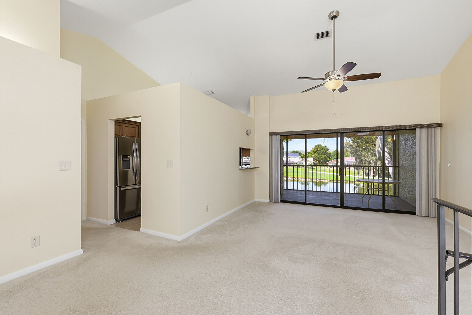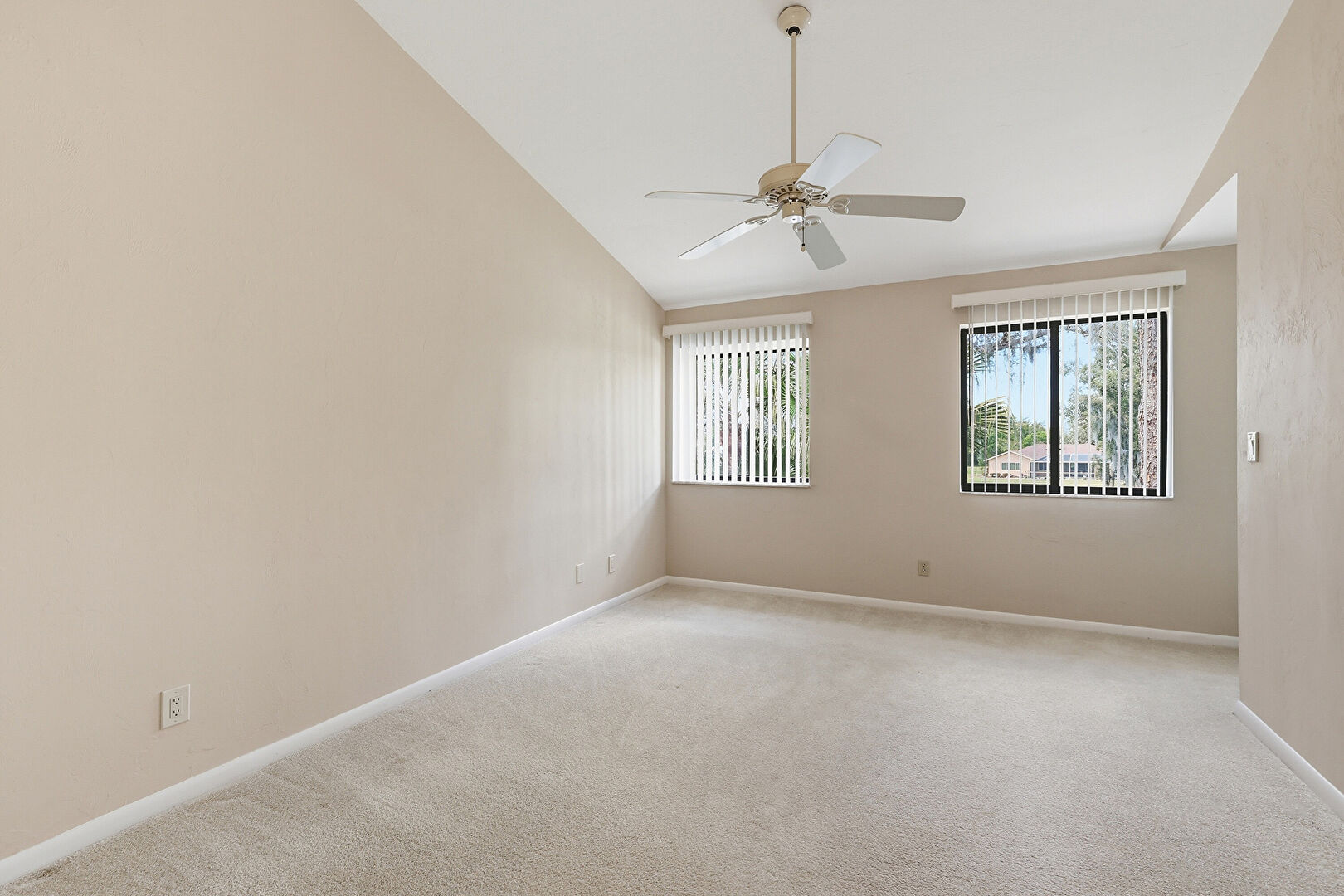Baseboards Wall, Carpet, Ceiling Fan, Drywall, High Ceiling, Natural Light, Vaulted Ceiling, Vent, Ceiling Fan, Drywall, High Ceiling