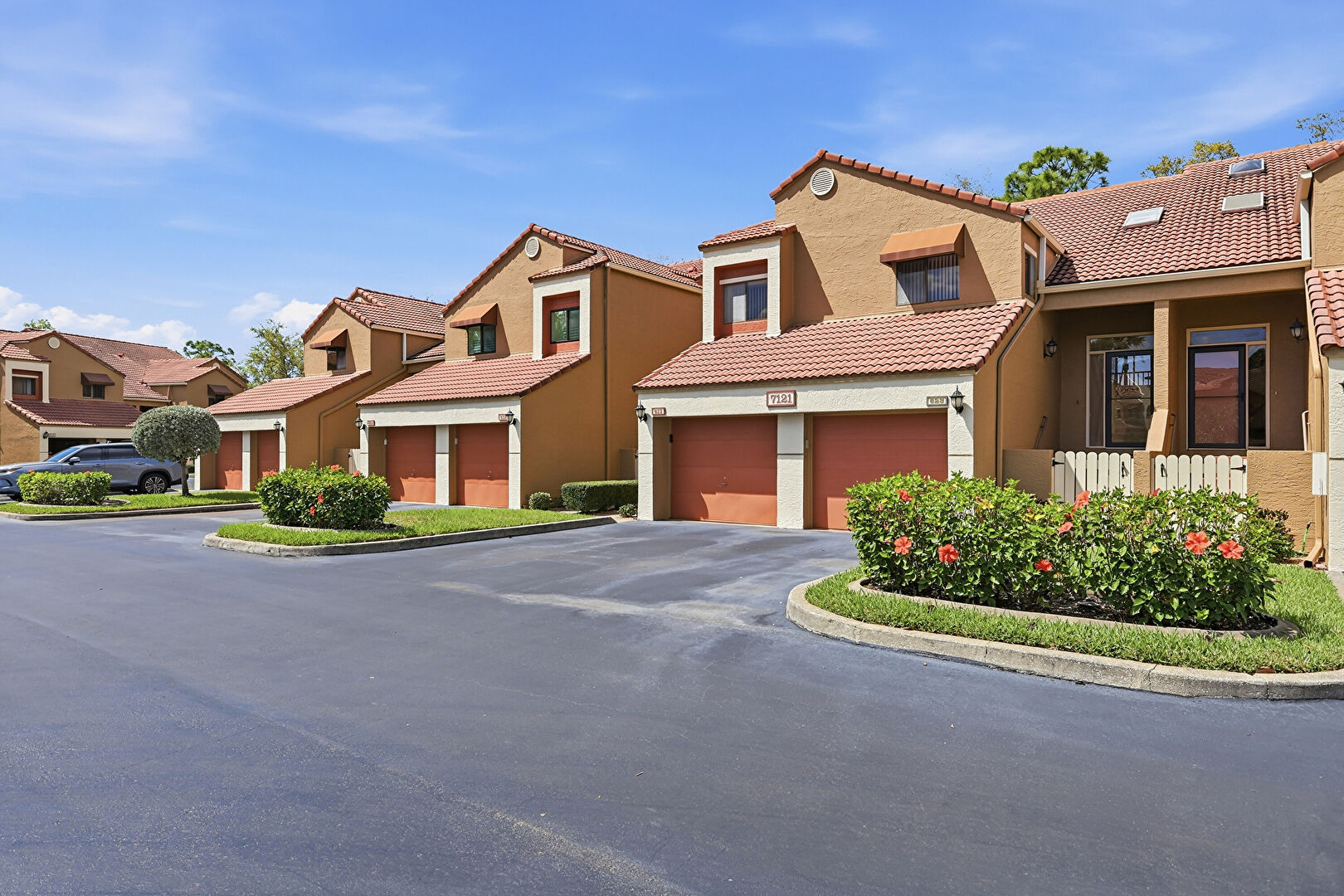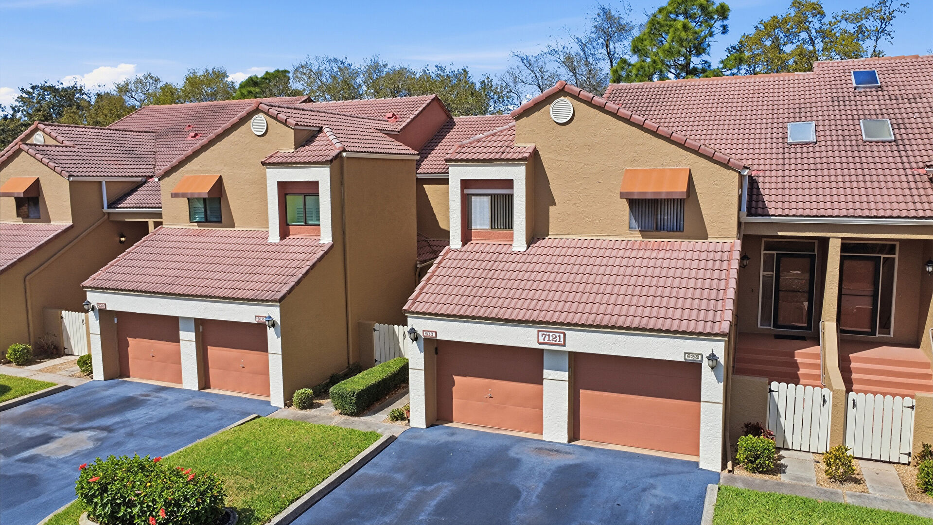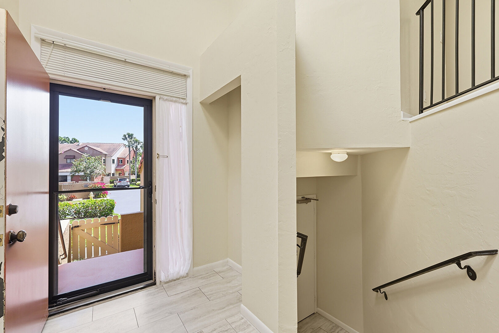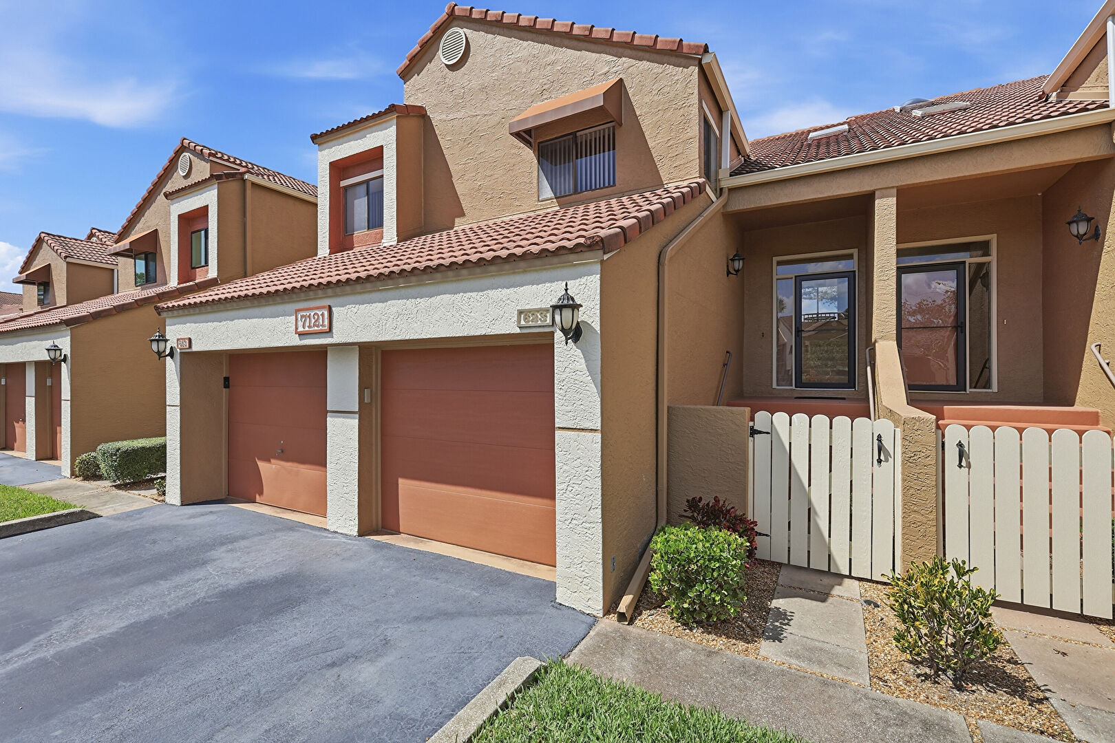 Driveway, Fence, Garage, Gate, Gutters, Porch, Residential View, Stucco Siding, Tile Roof, Downspout, Fence, Porch, Stucco Siding