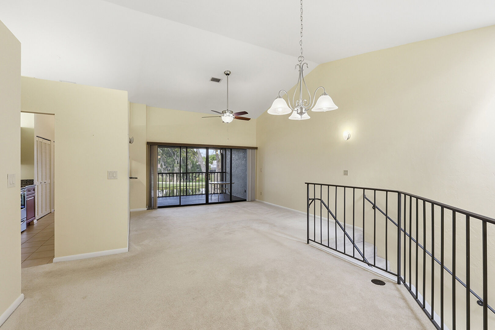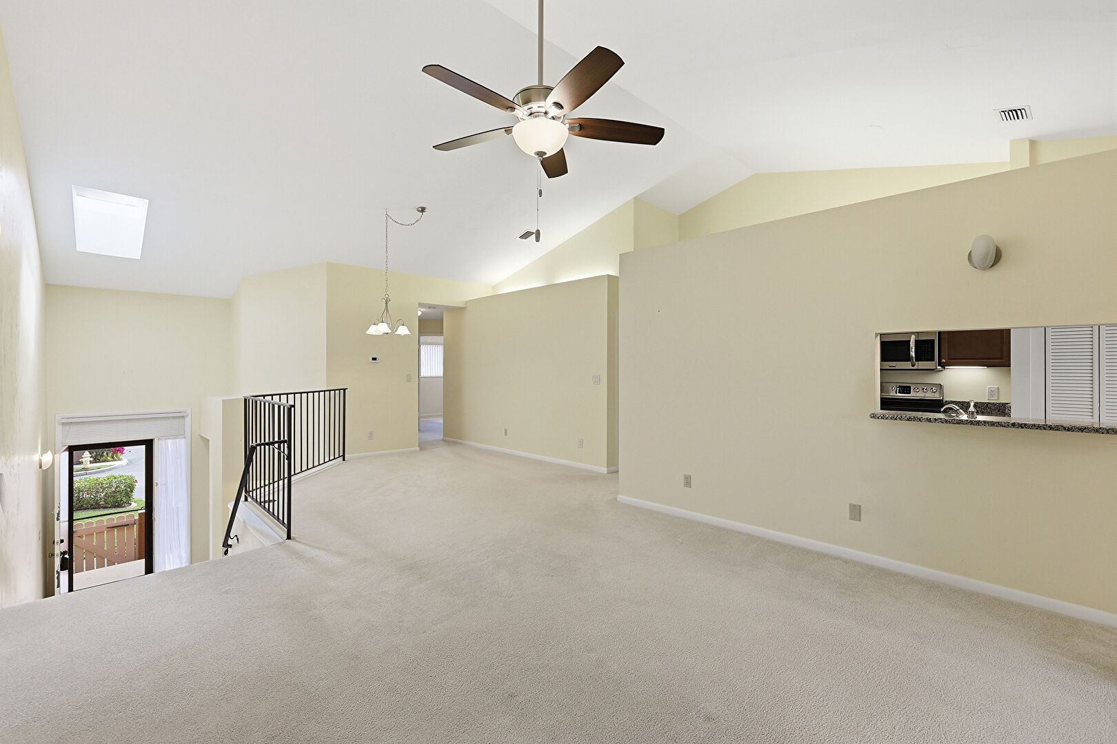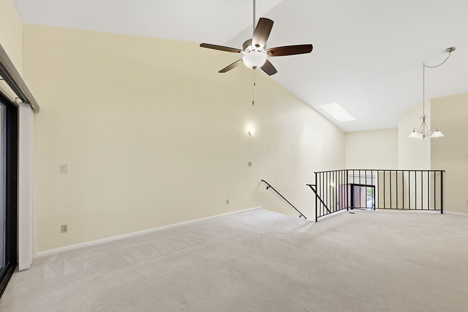 Baseboards Wall, Carpet, Cathedral Ceiling, Ceiling Fan, Drywall, High Ceiling, Natural Light, Notable Chandelier, Skylight, Vaulted Ceiling, Vent, Baseboards Wall, High Ceiling, Vent