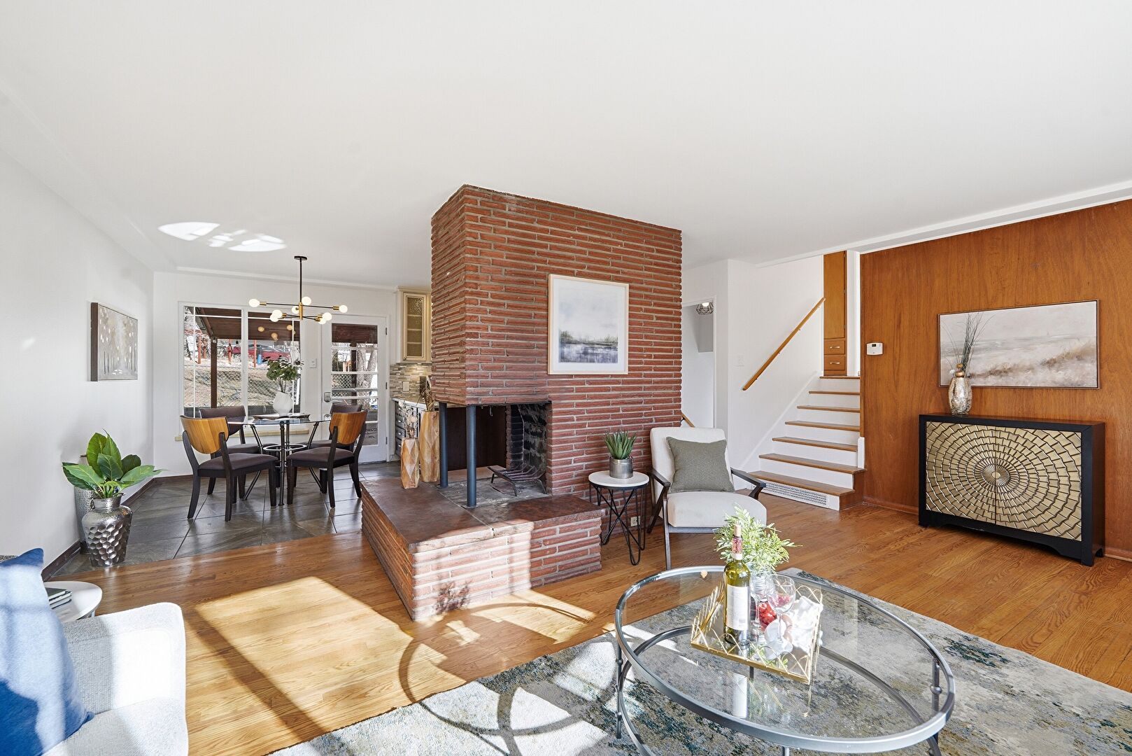 Baseboards Wall, Drywall, Fireplace, Natural Light, Notable Chandelier, Stairs, Wood Finish Floor, Wood Wall, Baseboards Wall, Natural Light