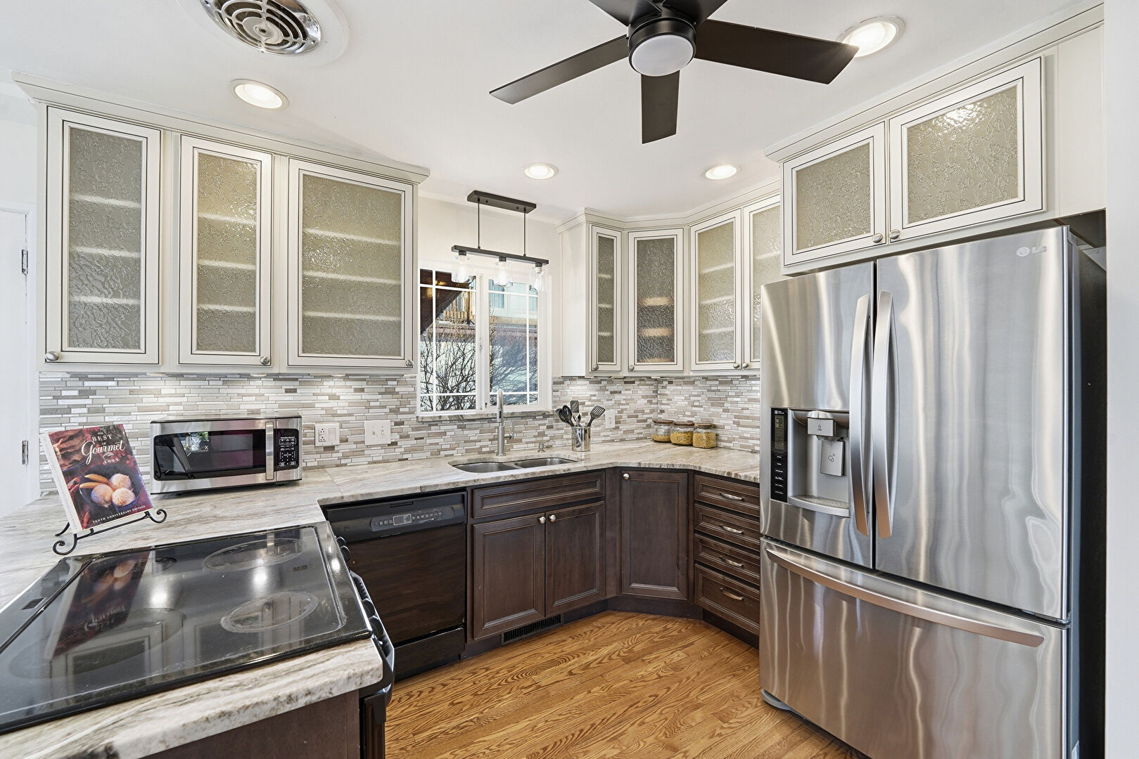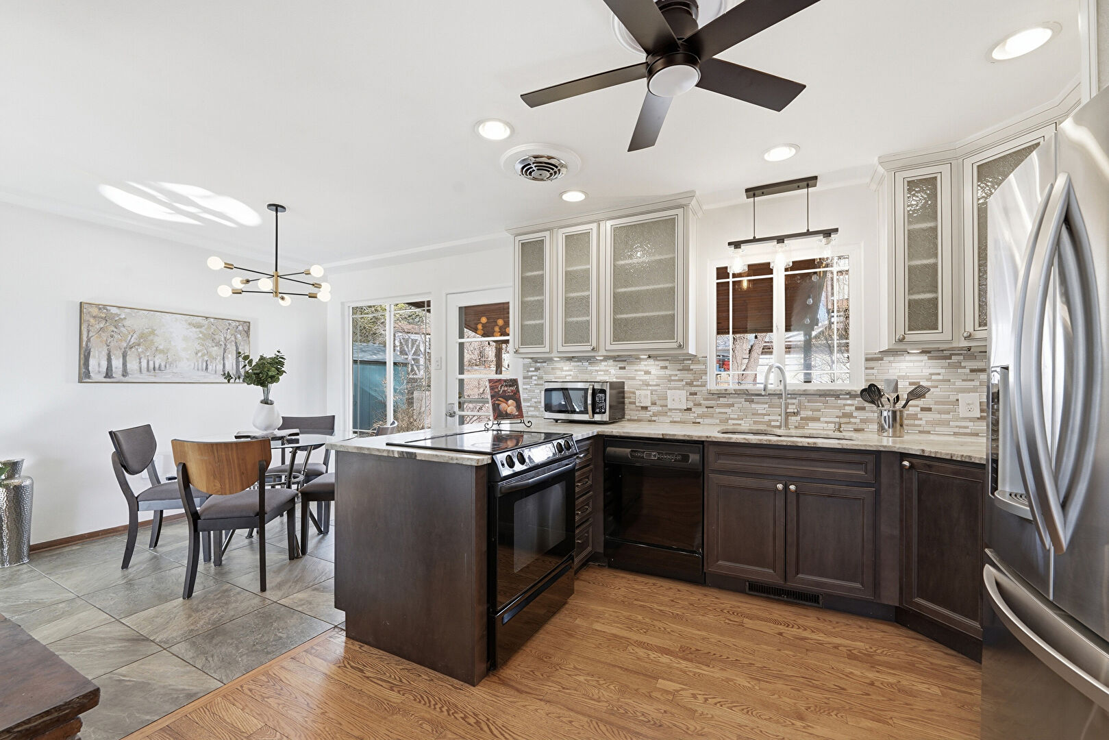 Baseboards Wall, Ceiling Fan, Crown Molding Cabinets, Dark Brown Cabinets, Drywall, Glass Insert Cabinets, Kitchen Peninsula, Natural Light, Pendant Lighting, Recessed Lighting, Shaker Cabinets, Stone Countertops, Vent, Wood Finish Floor, Notable Chandelier, Stone Countertops