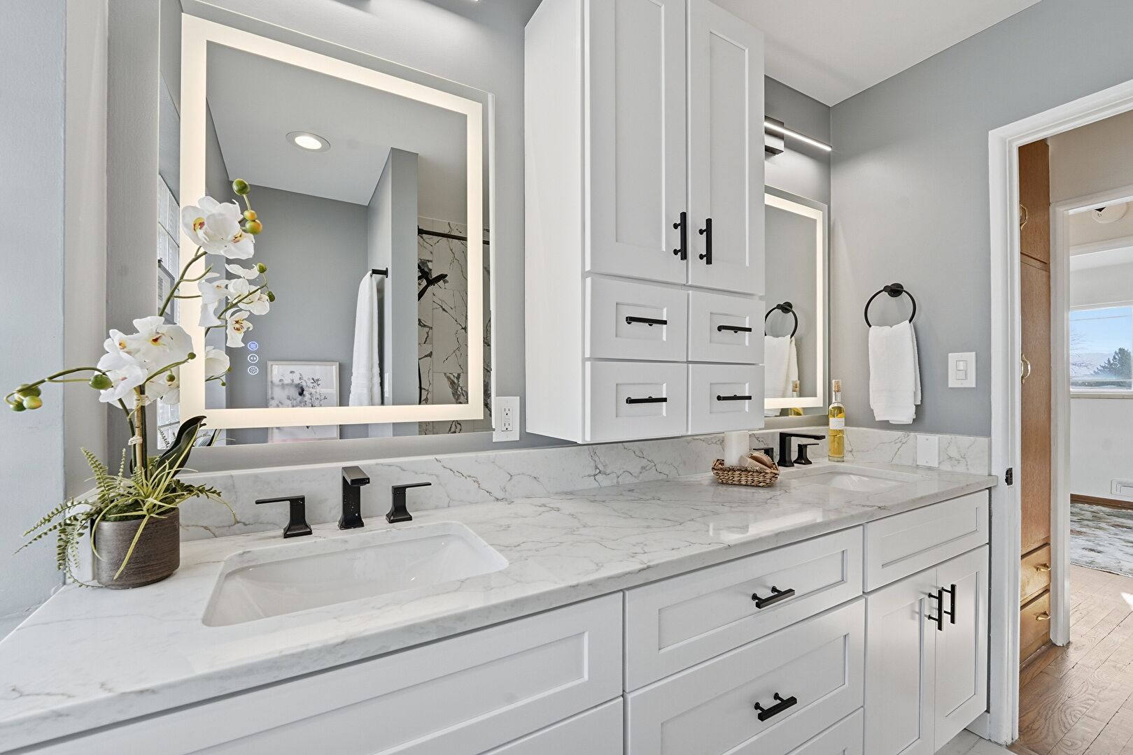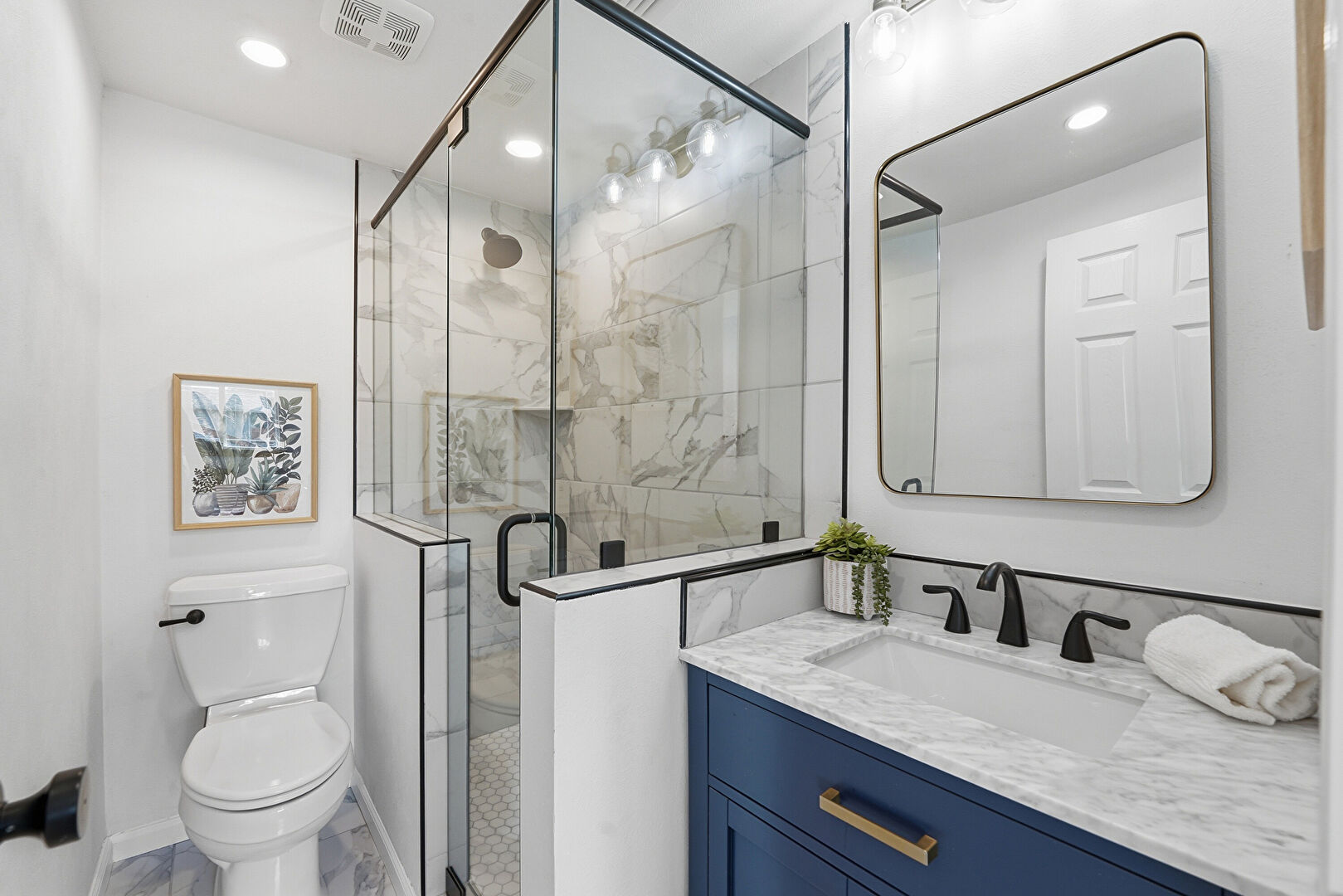 Baseboards Wall, Double Vanity, Drywall, Full Bathroom, Natural Light, Recessed Lighting, Vent, Wood Finish Floor, Drywall, Vanity