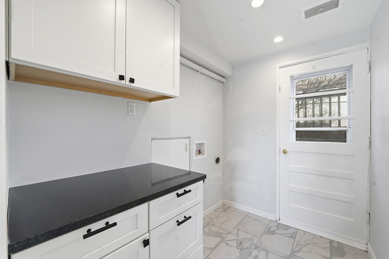 Baseboards Wall, Drywall, Laundry, Marble Finish Floor, Recessed Lighting, Vent, Washer Hookup, Natural Light