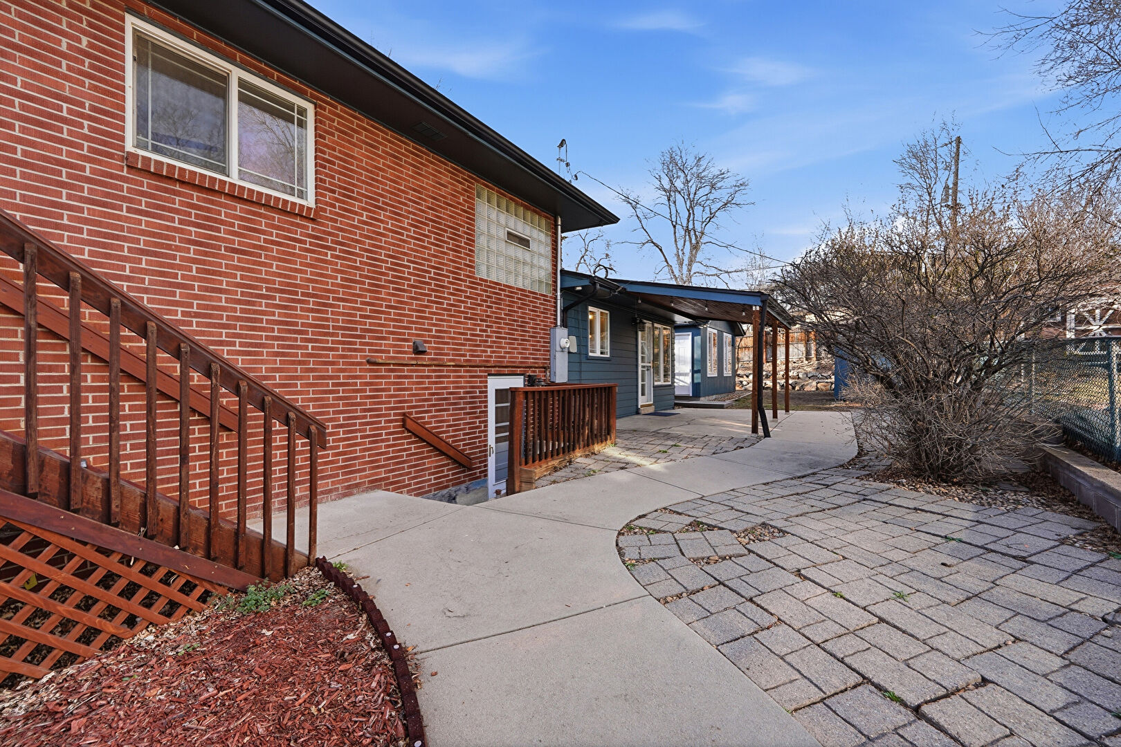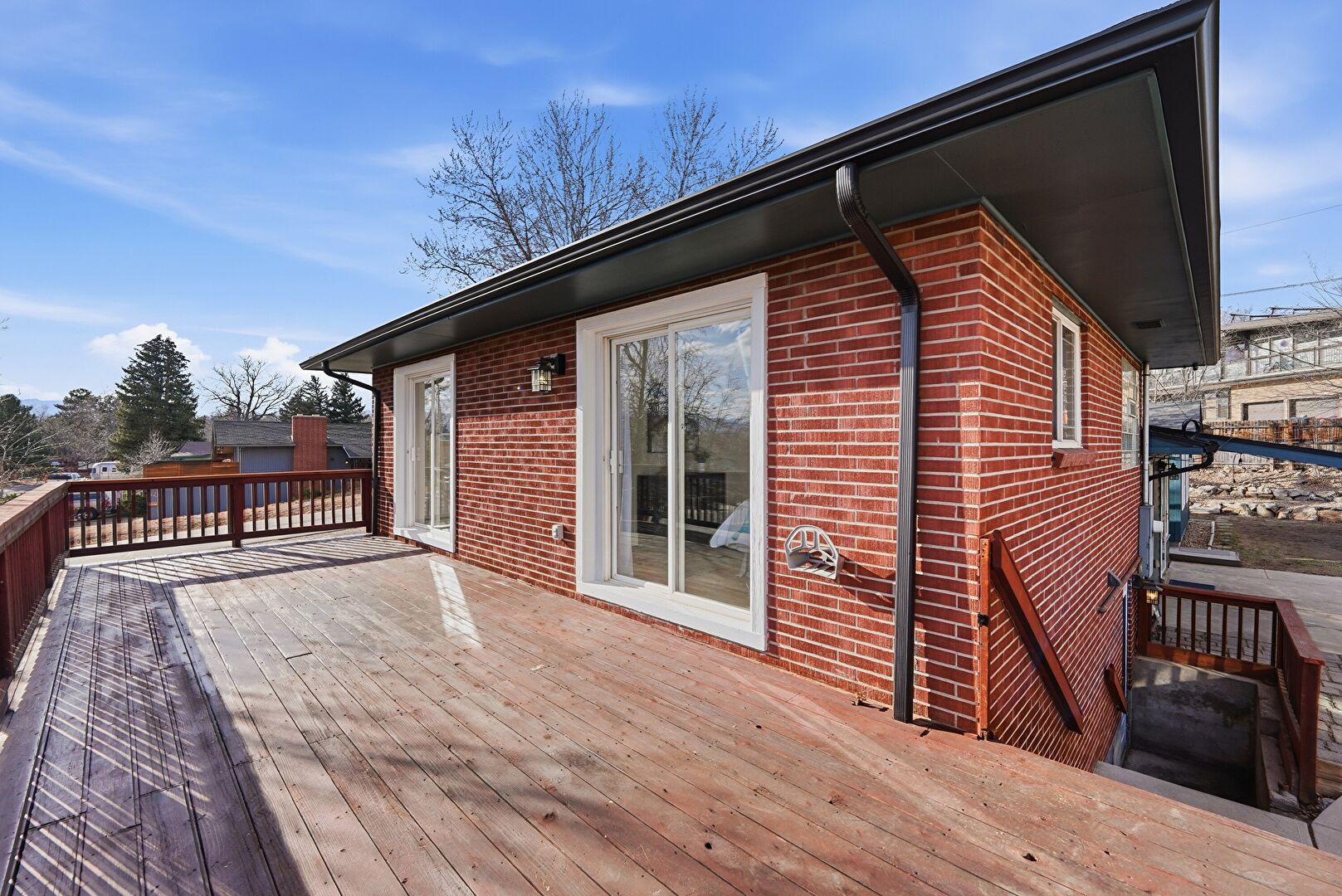 Balcony, Basement Garage, Brick Siding, Built In Garage, Chimney, Deck, Downspout, Driveway, Fence, Gutters, Horizontal Siding, Lawn, Parking Pad, Patio, Gutters, Lawn, Parking Pad