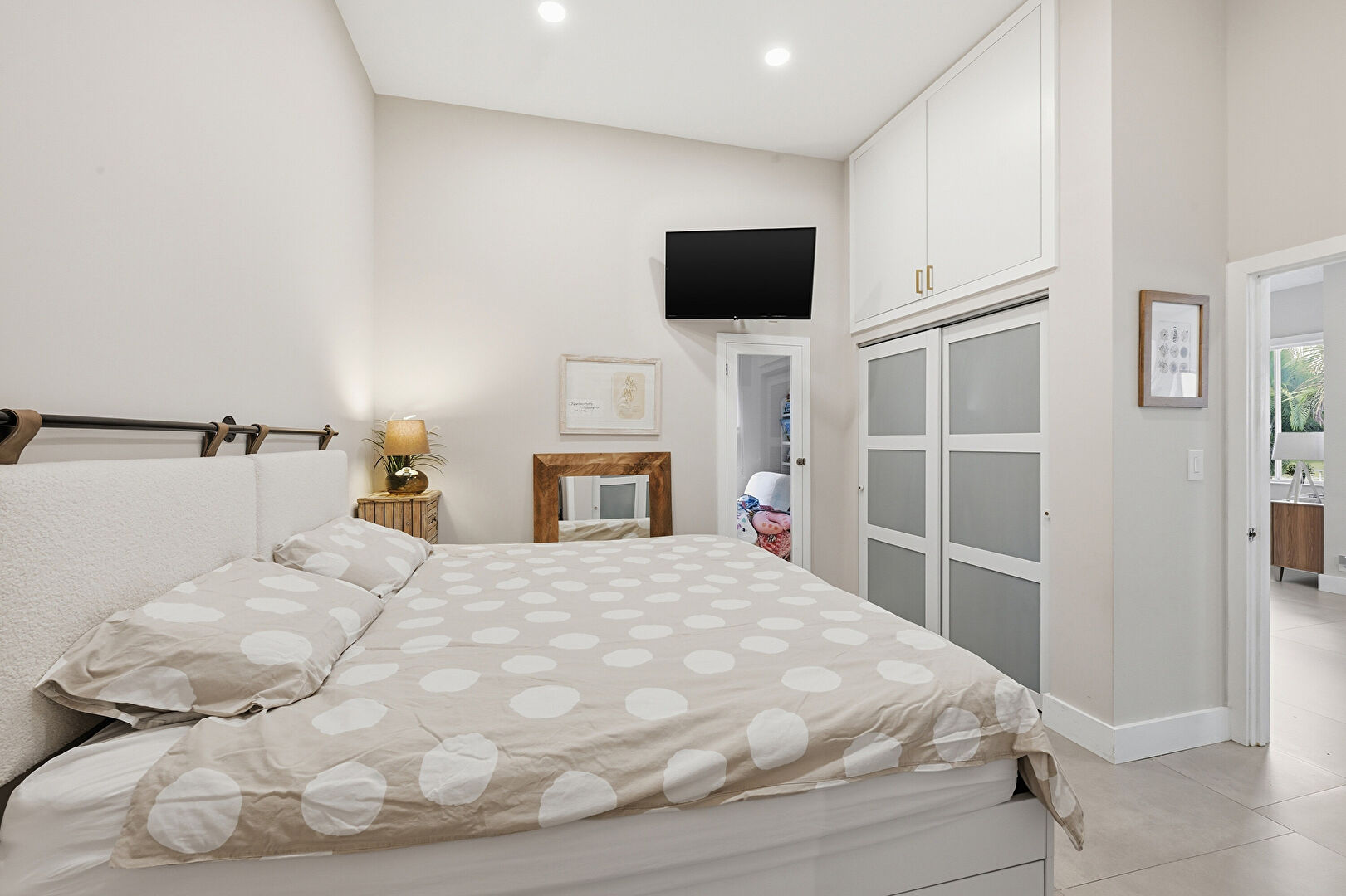 Accent Wall, Baseboards Wall, Drywall, Ensuite Bathroom, High Ceiling, Natural Light, Office Area, Recessed Lighting, Sunroom, Textured Ceiling, Tile Floor, Vaulted Ceiling, Wallpaper Wall, Accent Wall, Closet, Recessed Lighting, Tile Floor
