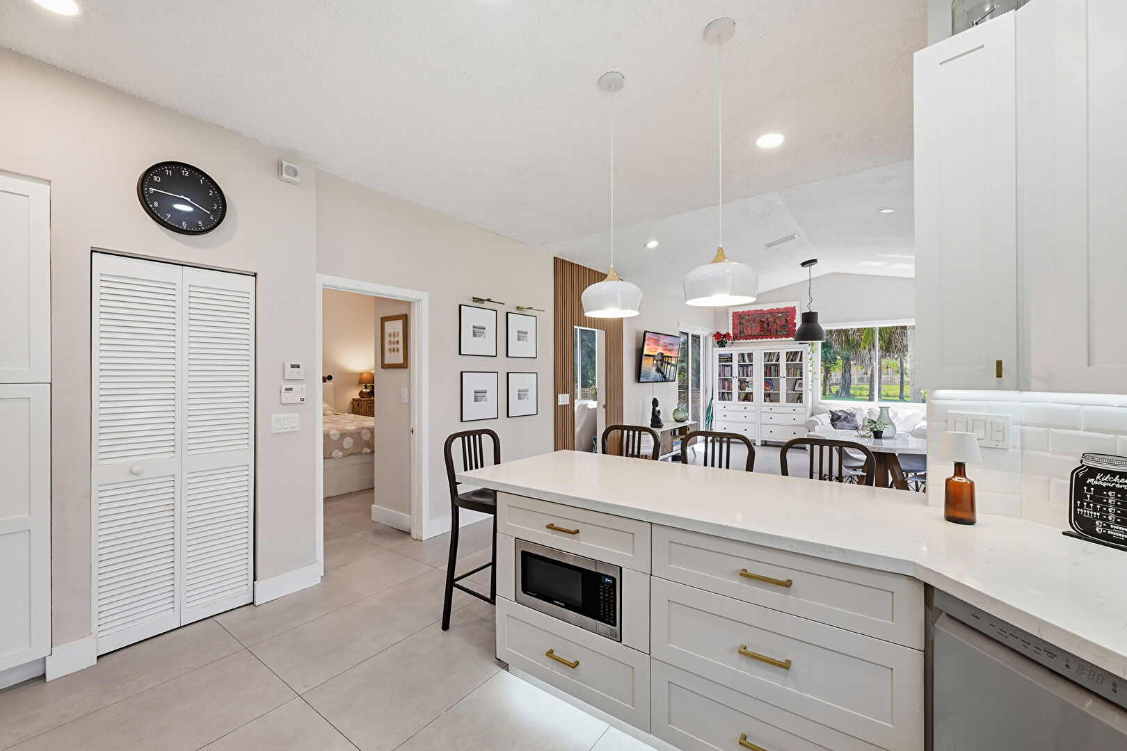 Baseboards Wall, Drywall, Glass Insert Cabinets, Kitchen Peninsula, Natural Light, Pendant Lighting, Recessed Lighting, Shaker Cabinets, Textured Ceiling, Tile Floor, U Shaped Kitchen, Vent, Kitchen Bar