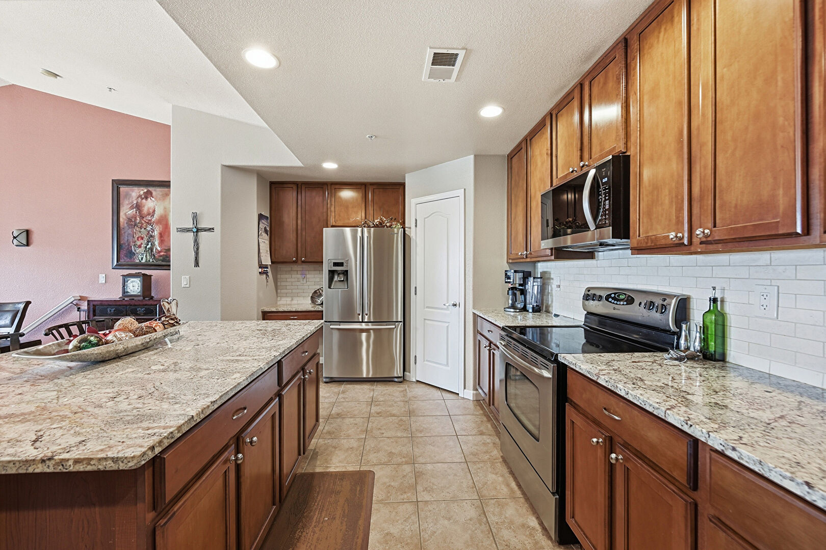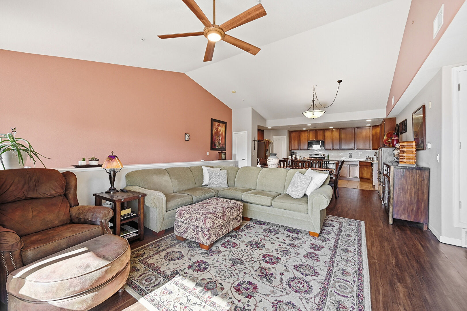 Baseboards Wall, Ceiling Fan, Dark Brown Cabinets, Drywall, High Ceiling, Kitchen Bar, Kitchen Island, Medium Brown Cabinets, Natural Light, Opens To Living Area, Pendant Lighting, Recessed Lighting, Shaker Cabinets, Stone Countertops, Textured Ceiling, Tile Floor, U Shaped Kitchen, Vaulted Ceiling, Vent, Wood Finish Floor, Baseboards Wall, Recessed Lighting, Shaker Cabinets, Vent