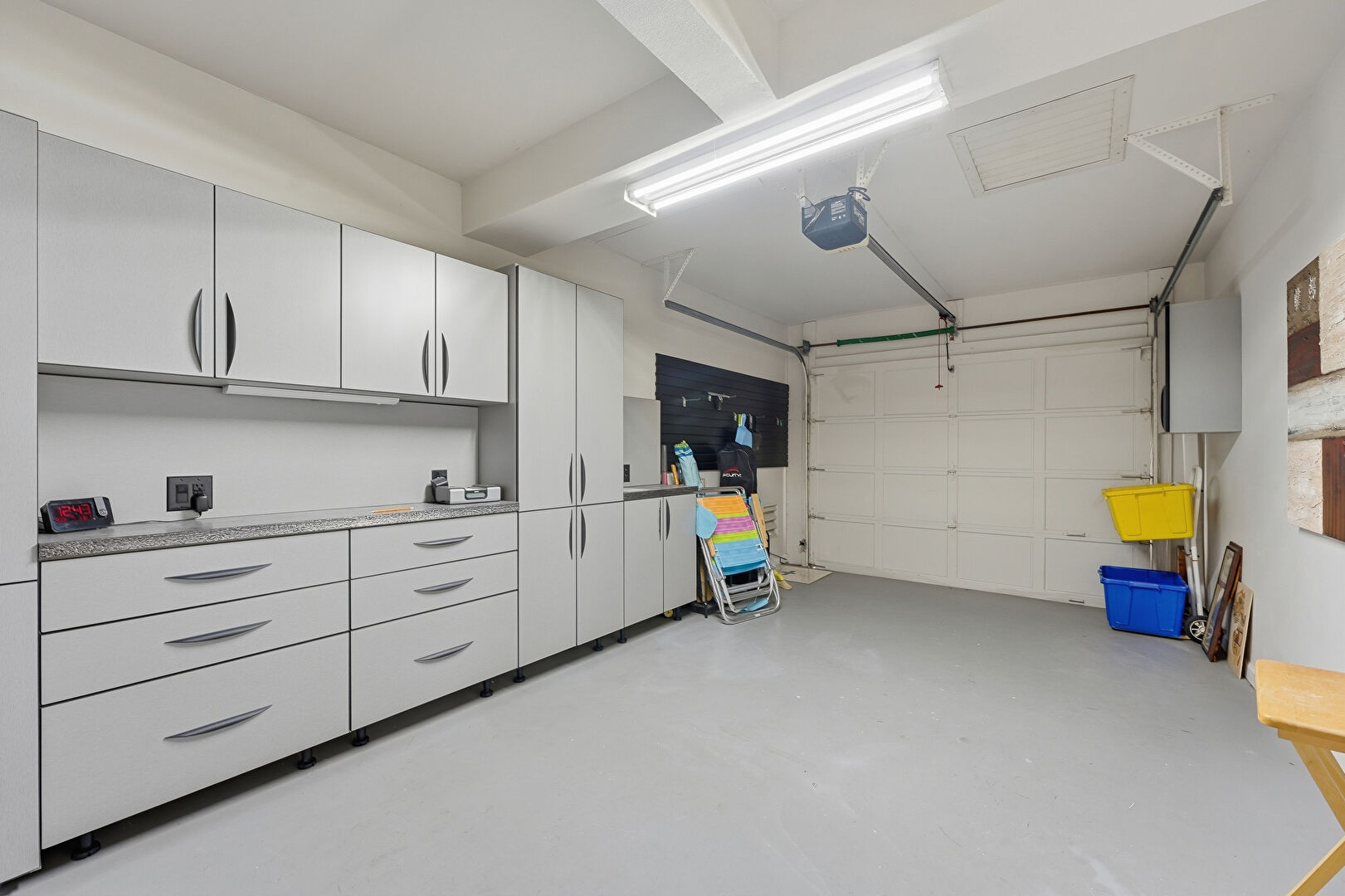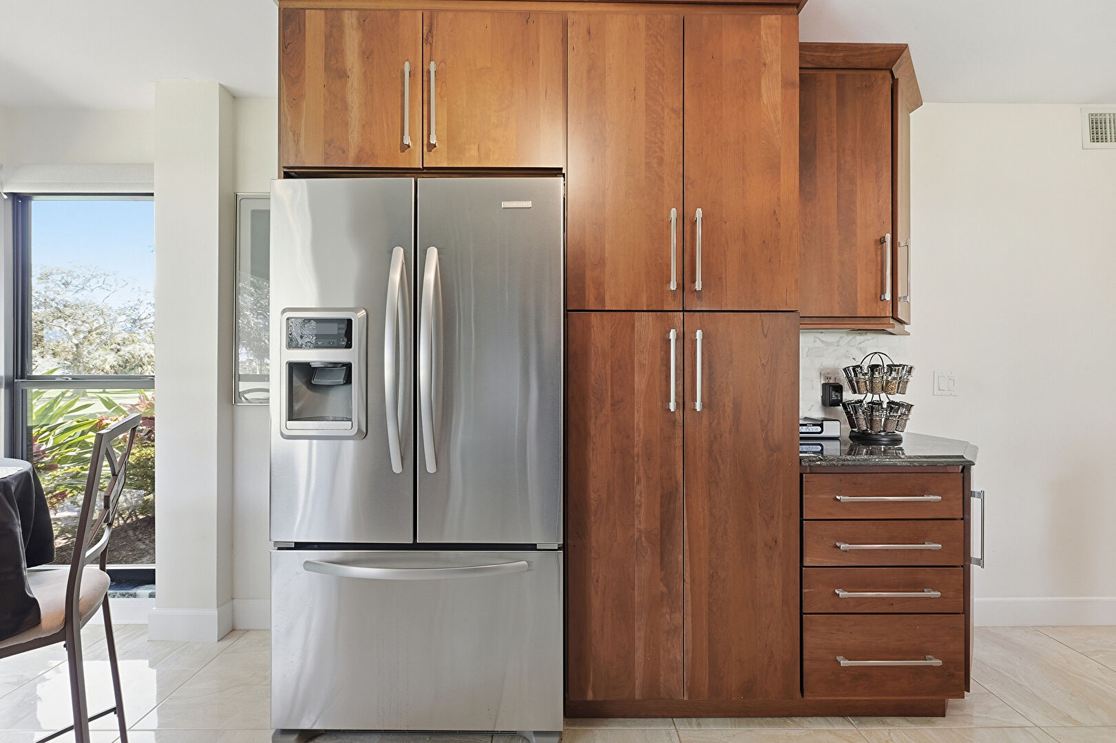 Baseboards Wall, Ceiling Fan, Drywall, Kitchen Peninsula, Medium Brown Cabinets, Natural Light, Pendant Lighting, Stone Countertops, Tile Floor, Track Lighting, U Shaped Kitchen, Vent, Crown Molding Cabinets, Kitchen Peninsula