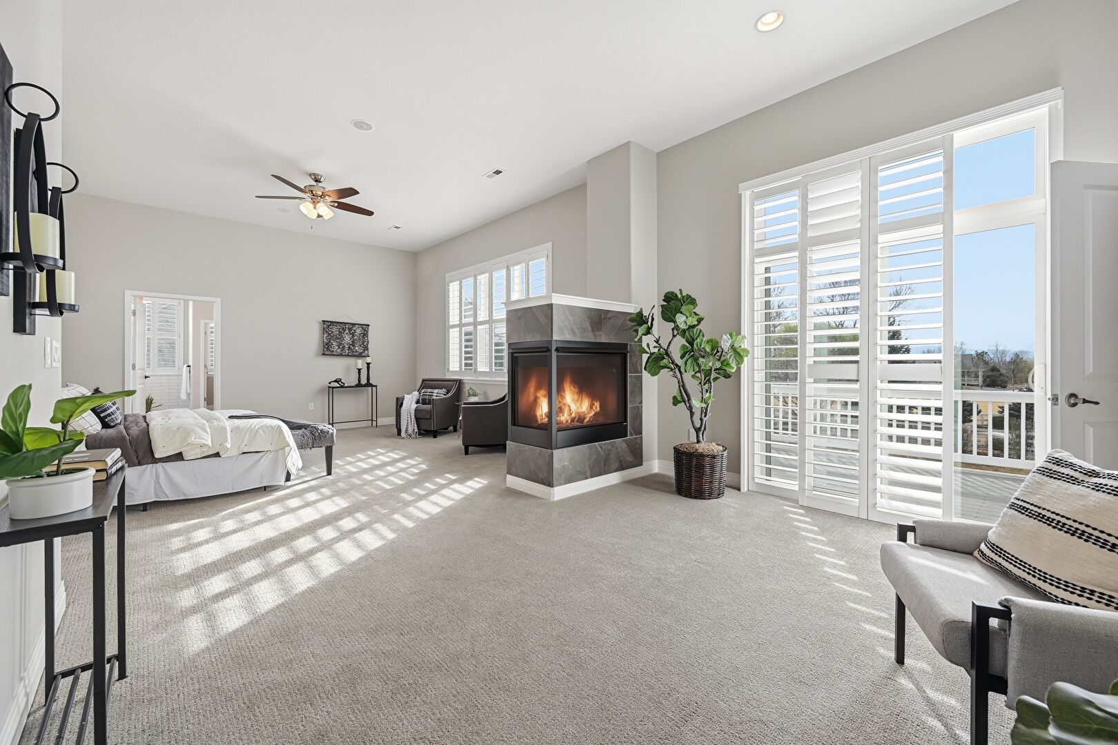 Access To Exterior, Carpet, Ceiling Fan, Drywall, Fireplace, Natural Light, Recessed Lighting, Vent, Baseboards Wall, Ceiling Fan