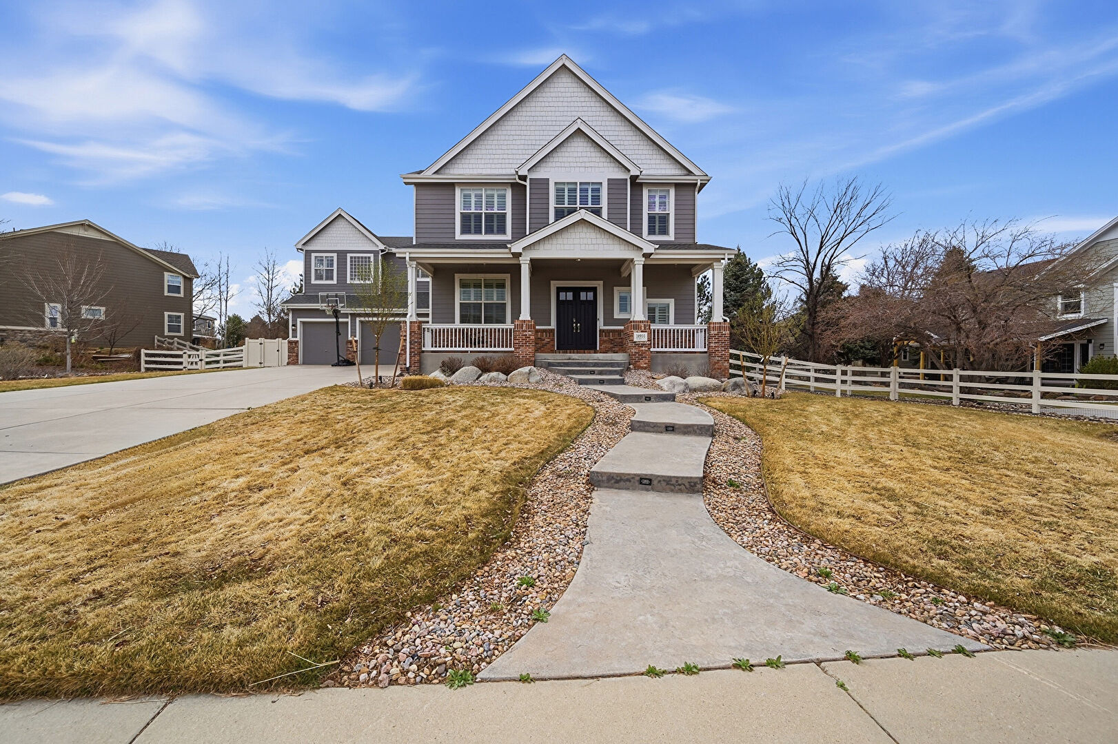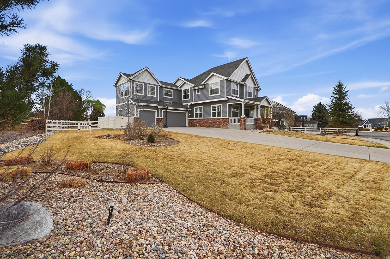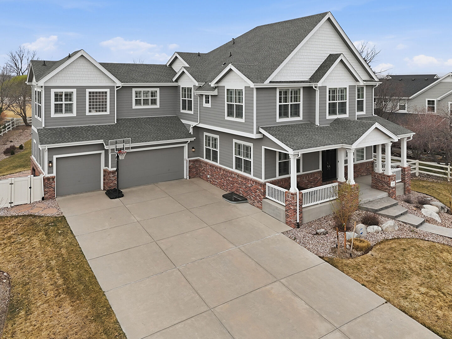 Brick Siding, Built In Garage, Downspout, Driveway, Fence, Gutters, Horizontal Siding, Lawn, Porch, Shake Shingle Siding, Stone Siding, Built In Garage, Downspout, Gate, Porch