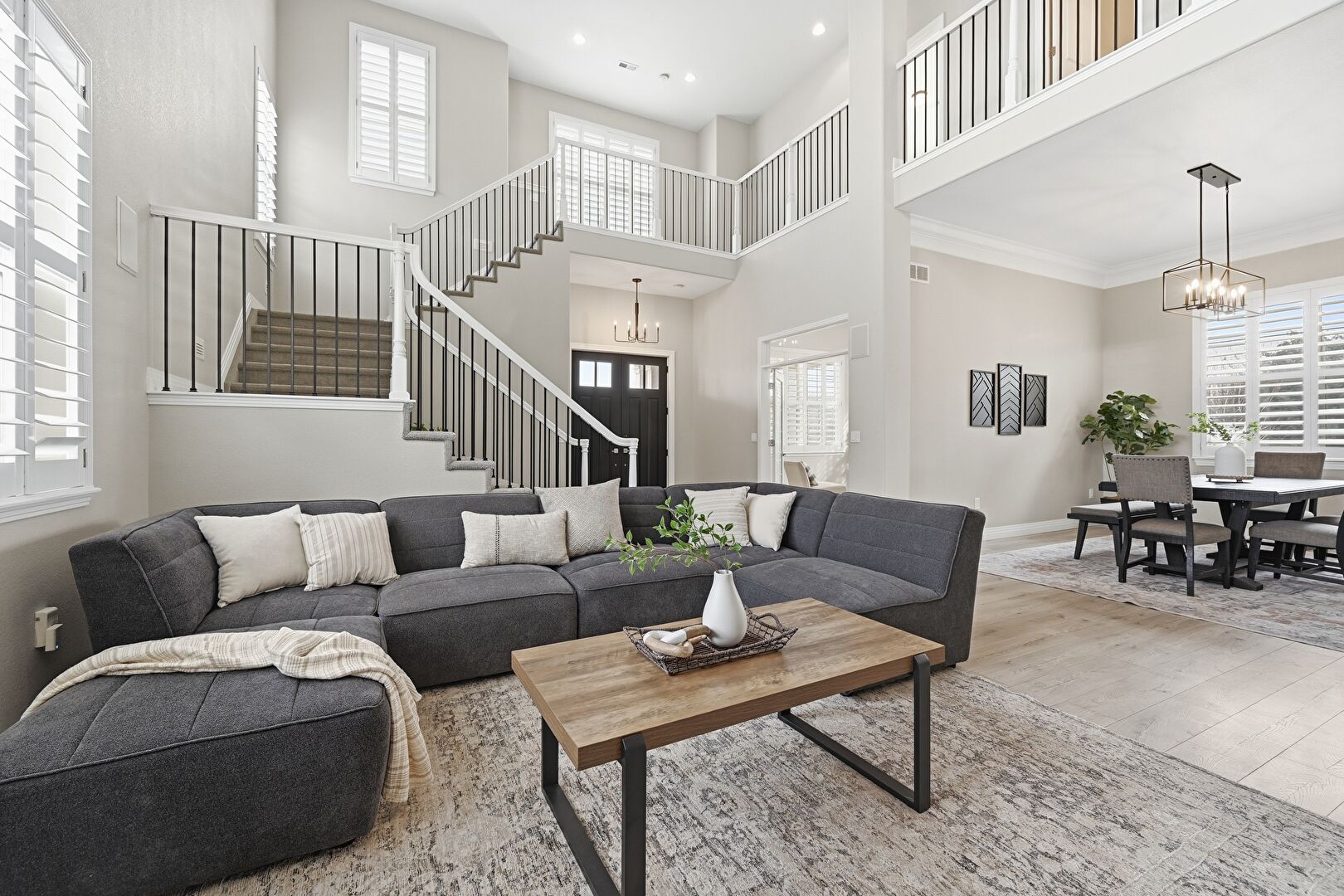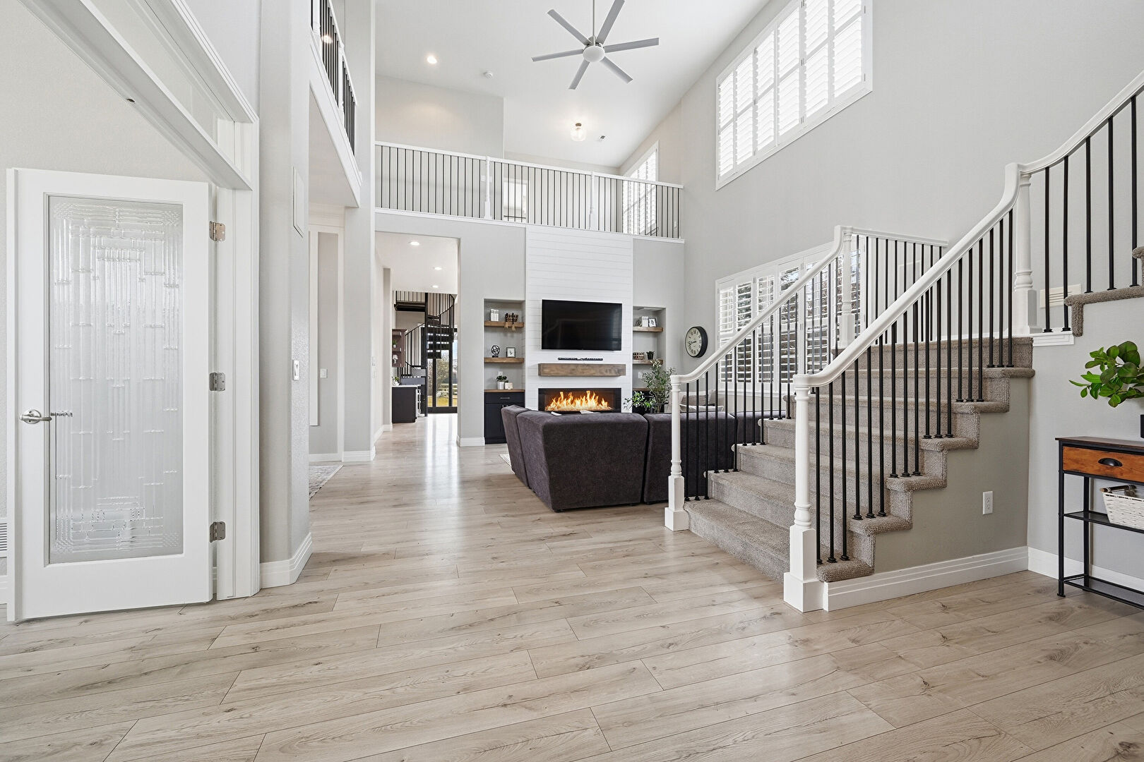 Baseboards Wall, Ceiling Fan, Drywall, Fireplace, High Ceiling, Natural Light, Recessed Lighting, Wood Finish Floor, Stairs