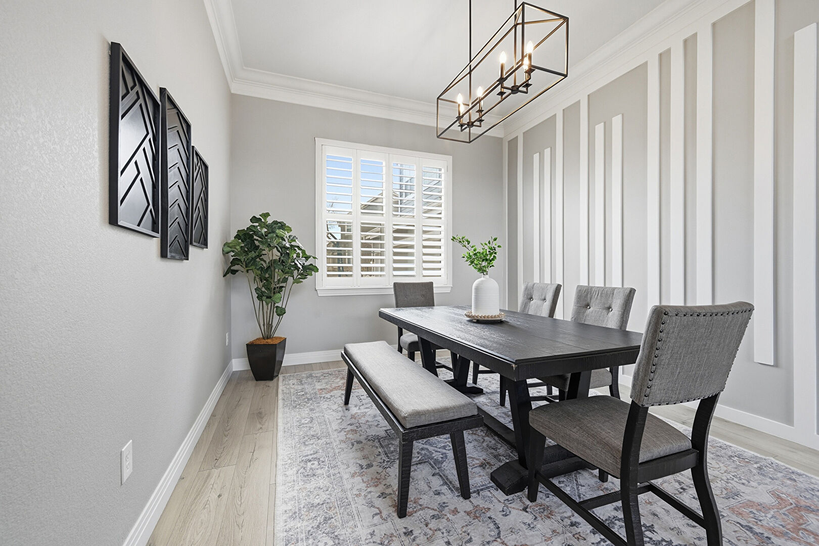 Baseboards Wall, Drywall, Natural Light, Notable Chandelier, Wood Finish Floor, Crown Molding
