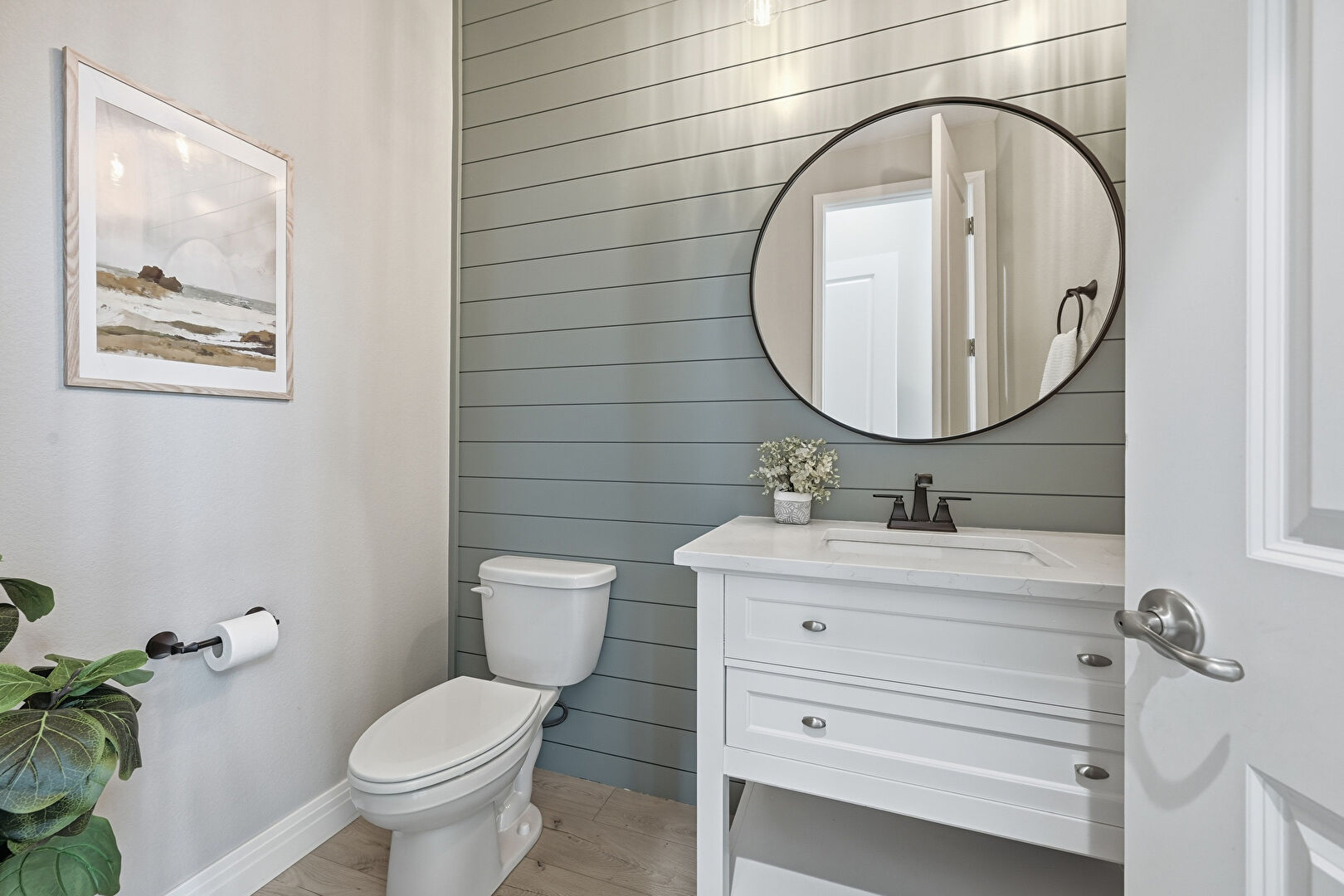 Baseboards Wall, Combined Bath Shower, Double Vanity, Drywall, Full Bathroom, Half Bathroom, Natural Light, Recessed Lighting, Tile Floor, Vanity, Vent, Wood Finish Floor, Wood Wall, Baseboards Wall, Double Vanity, Drywall