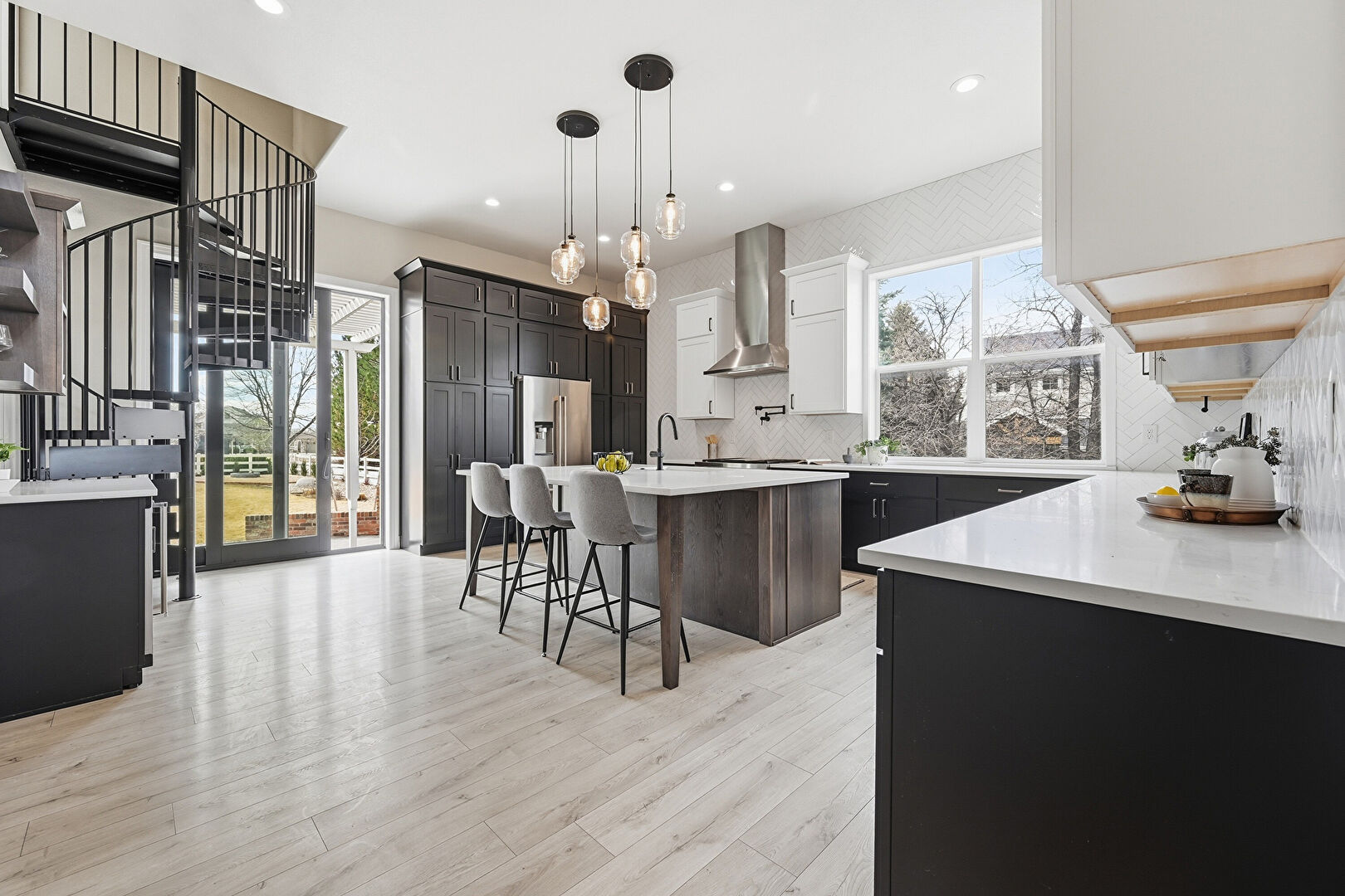 Baseboards Wall, Black Cabinets, Crown Molding Cabinets, Dark Brown Cabinets, Drywall, Kitchen Bar, Kitchen Island, Natural Light, Open Shelves, Pendant Lighting, Pot Filler, Recessed Lighting, Shaker Cabinets, Stone Countertops, U Shaped Kitchen, Vent, Wine Cooler, Wood Finish Floor, Black Cabinets, Dark Brown Cabinets, Kitchen Bar