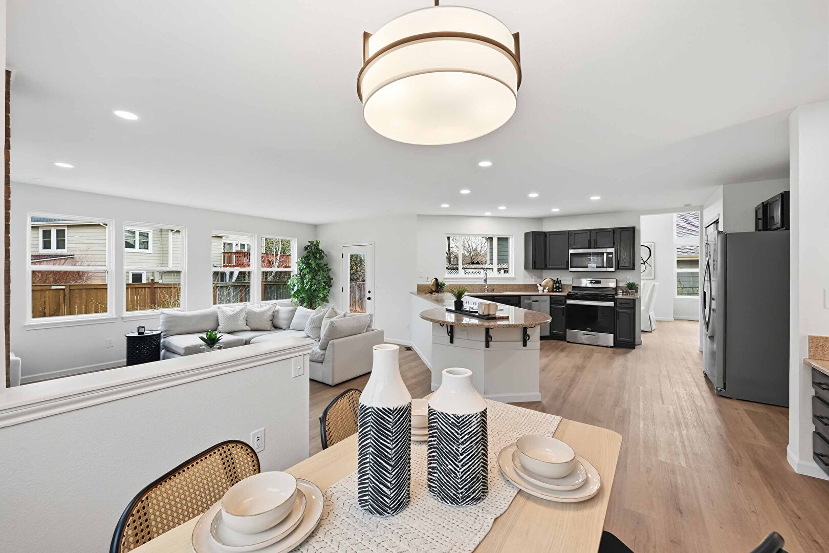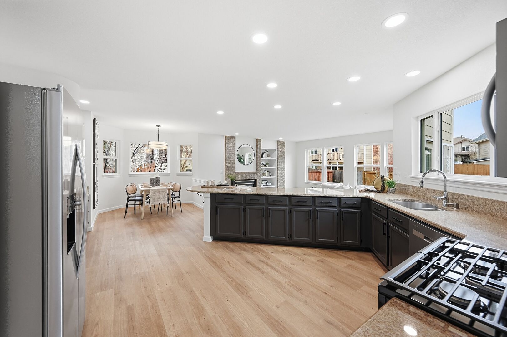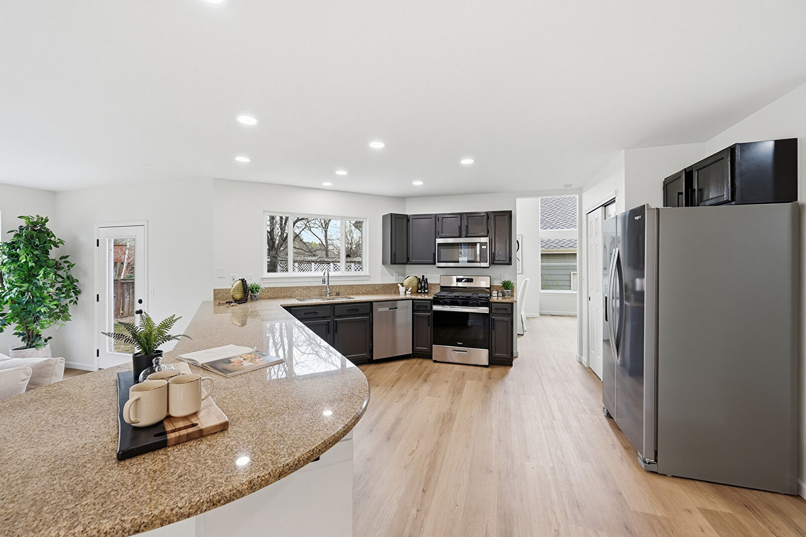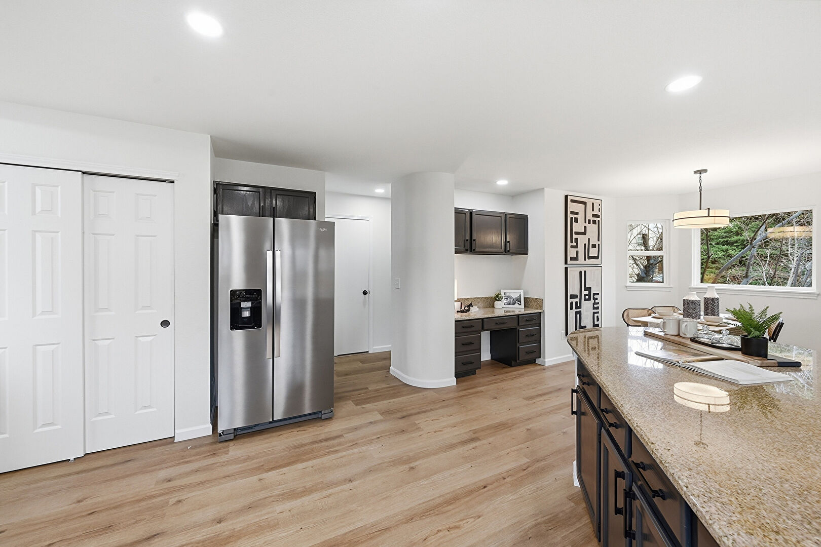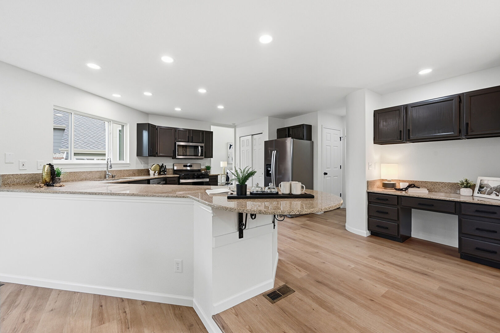 Baseboards Wall, Black Cabinets, Built In Desk, Dark Brown Cabinets, Drywall, G Shaped Kitchen, Gray Cabinets, Kitchen Bar, Kitchen Peninsula, Natural Light, Office Area, Opens To Living Area, Pendant Lighting, Recessed Lighting, Shaker Cabinets, Stone Countertops, Vent, Wood Finish Floor, Baseboards Wall, Black Cabinets, Drywall, Kitchen Bar, Recessed Lighting