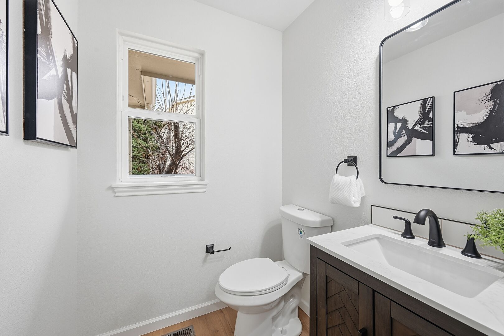 Baseboards Wall, Combined Bath Shower, Double Vanity, Drywall, Full Bathroom, Natural Light, Vanity, Vaulted Ceiling, Vent, Wood Finish Floor, Half Bathroom, Tile Floor