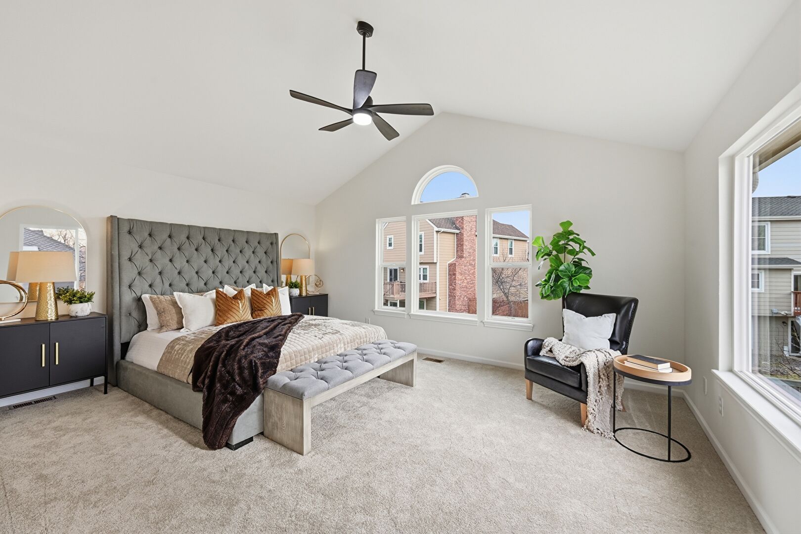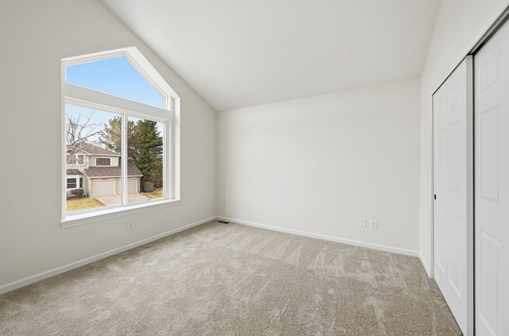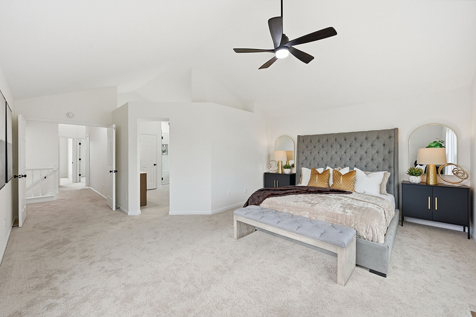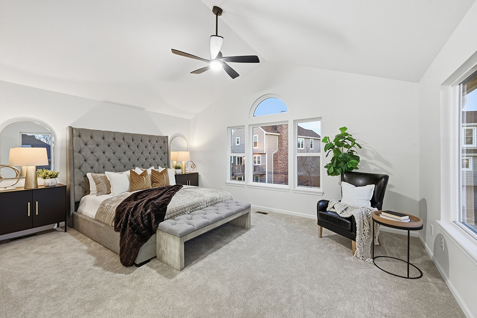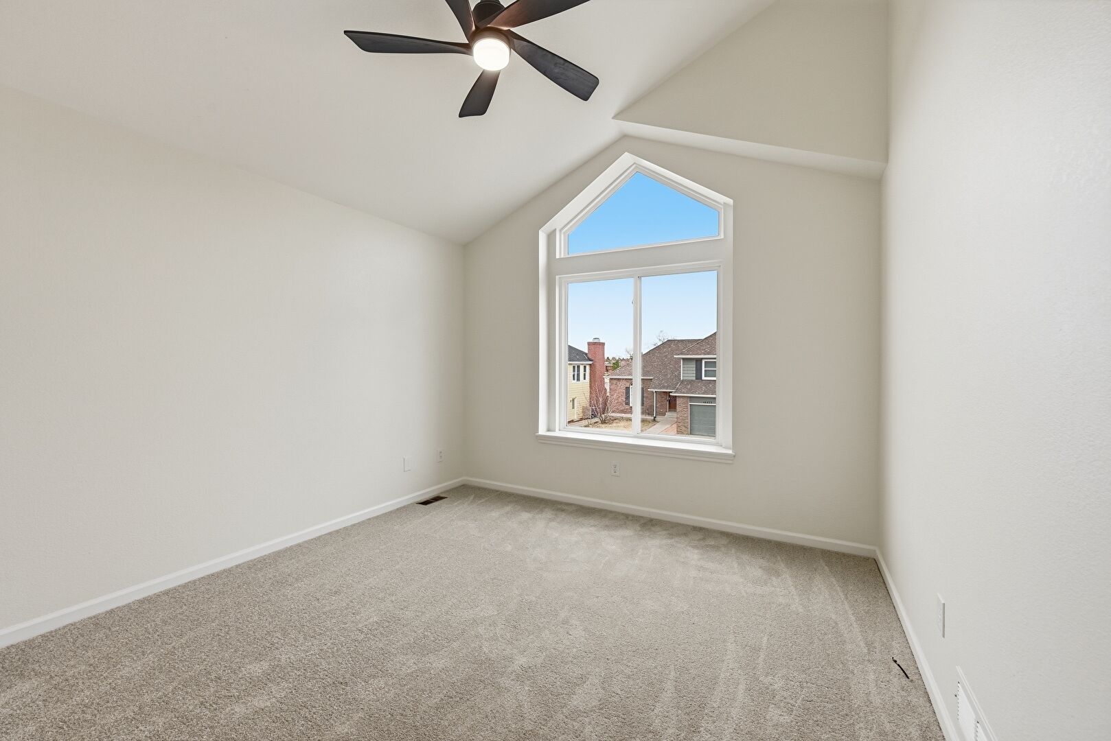 Baseboards Wall, Carpet, Cathedral Ceiling, Ceiling Fan, Drywall, High Ceiling, Natural Light, Vaulted Ceiling, Vent, Baseboards Wall, Carpet, Cathedral Ceiling