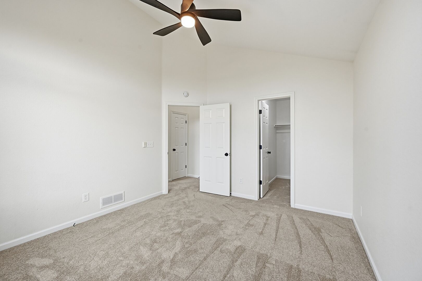 Baseboards Wall, Carpet, Ceiling Fan, Drywall, High Ceiling, Natural Light, Vaulted Ceiling, Vent, Walk In Closet, Closet, Drywall, Vaulted Ceiling